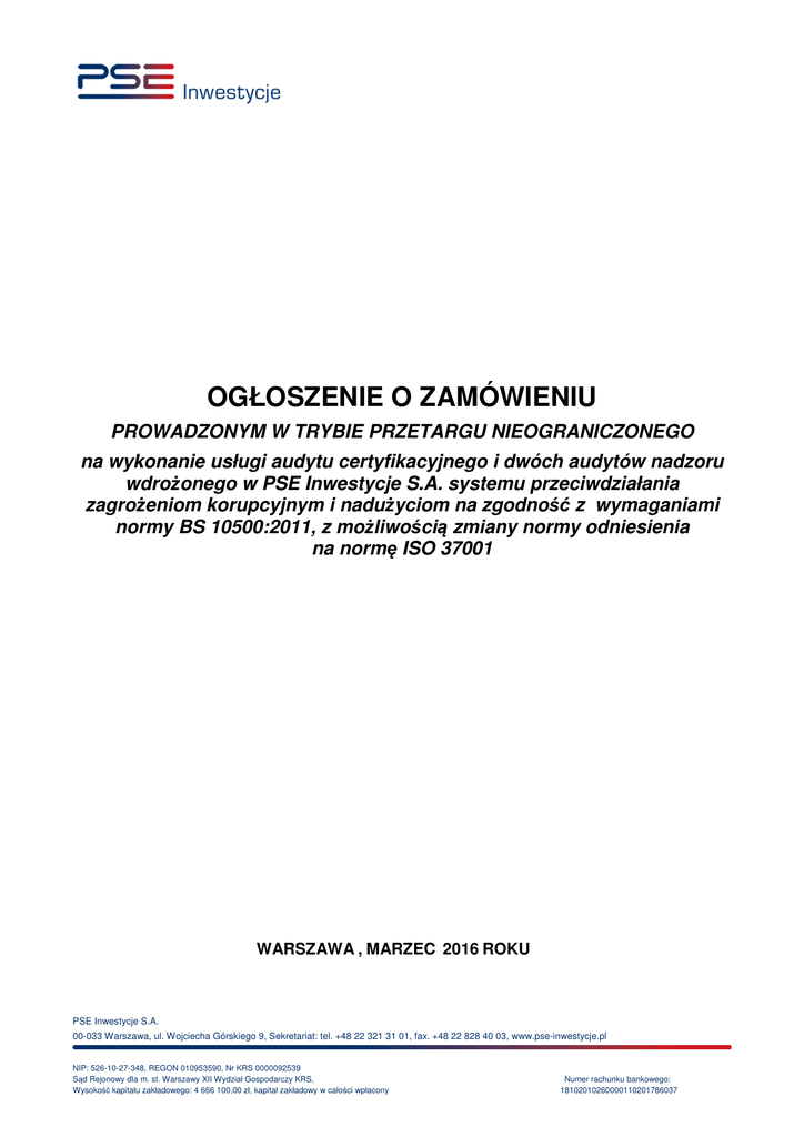 OGŁOSZENIE O ZAMÓWIENIU PROWADZONYM W TRYBIE PRZETARGU NIEOGRANICZONEGO na wykonanie usługi audytu certyfikacyjnego i dwóch audytów nadzoru wdrożonego w PSE Inwestycje S.A. systemu przeciwdziałania zagrożeniom korupcyjnym i nadużyciom na zgodność z wymaganiami normy BS 10500:2011, z możliwością zmiany normy odniesienia na normę ISO 37001 WARSZAWA , MARZEC 2016 ROKU PSE Inwestycje S.A. 00-033 Warszawa, ul. Wojciecha Górskiego 9, Sekretariat: tel. +48 22 321 31 01, fax. +48 22 828 40 03, www.pse-inwestycje.pl NIP: 526-10-27-348, REGON 010953590, Nr KRS 0000092539 Sąd Rejonowy dla m. st. Warszawy XII Wydział Gospodarczy KRS, Wysokość kapitału zakładowego: 4 666 100,00 zł, kapitał zakładowy w całości wpłacony Numer rachunku bankowego: 18102010260000110201786037 1. NAZWA I ADRES ZAMAWIAJĄCEGO PSE Inwestycje S.A. z siedzibą w Warszawie 00-033 Warszawa ul. Wojciecha Górskiego 9 NIP: 526-10-27-348, Nr KRS 0000092539 www.pse-inwestycje.pl 2. TRYB UDZIELENIA ZAMÓWIENIA Postępowanie o udzielenie zamówienia prowadzone będzie w trybie przetargu nieograniczonego zgodnie z obowiązującym „Regulaminem udzielania zamówień w PSE Inwestycje S.A.” z dnia 1 lipca 2015 r. Regulamin jest udostępniony na stronie www.pse-inwestycje.pl w zakładce przetargi. 3. PRZEDMIOT ZAMÓWIENIA • Przedmiotem niniejszego zamówienia jest wykonanie usługi certyfikacji wdrożonego w PSE Inwestycje S.A. Systemu Przeciwdziałania Zagrożeniom Korupcyjnym i Nadużyciom (dalej System) na zgodność z wymaganiami normy BS 10500:2011 (dalej Norma BS). W zakres przedmiotu umowy wchodzi wykonanie audytu certyfikacyjnego w 2016 roku, pierwszego audytu nadzoru w 2017 roku oraz drugiego audytu nadzoru w 2018 roku, w terminach każdorazowo uzgodnionych z Zamawiającym i umożliwiających Zamawiającemu utrzymanie ważności certyfikatu uzyskanego na podstawie audytu certyfikacyjnego. • W przypadku opublikowania, w okresie obowiązywania umowy z Wykonawcą, międzynarodowej normy ISO 37001 (dalej Norma ISO), określającej wymagania dla systemów przeciwdziałania zagrożeniom korupcyjnym i nadużyciom, Wykonawca, na wniosek Zamawiającego, przeprowadzi certyfikację Systemu na zgodność z wymaganiami Normy ISO, która przerwie i zastąpi certyfikację i wykonywanie audytów nadzoru Systemu na zgodność z Normą BS. • Zamawiający wymaga, aby proces certyfikacji na zgodność z wymaganiami Normy BS oraz proces certyfikacji na zgodność z wymaganiami Normy ISO zostały przeprowadzone w akredytacji dowolnej jednostki akredytacyjnej. • Przedmiot zamówienia obejmuje wydanie właściwego certyfikatu, odpowiednio na zgodność z normą BS lub normą ISO. Strona 2 z 4 4. WYMAGANY TERMIN REALIZACJI ZAMÓWIENIA Zamawiający wymaga, aby przedmiot zamówienia został zrealizowany w terminie: • audyt certyfikacyjny systemu przeciwdziałania zagrożeniom korupcyjnym i nadużyciom na zgodność z wymaganiami Normy BS zostanie przeprowadzony w terminie 9-16.05.2016 roku; • pierwszy i drugi audyt nadzoru Systemu przeprowadzone zostaną odpowiednio w latach 2017 i 2018, w terminach każdorazowo uzgodnionych z Zamawiającym i zapewniających utrzymanie ważności certyfikatu uzyskanego na podstawie audytu certyfikacyjnego wykonanego w 2016 roku; • wydanie certyfikatu na zgodność systemu przeciwdziałania zagrożeniom korupcyjnym i nadużyciom z wymaganiami Normy BS nastąpi w terminie do 30 dni od dnia zakończenia audytu certyfikacyjnego tego Systemu; • jeżeli Zamawiający wystąpi do Wykonawcy z wnioskiem o certyfikację wdrożonego u Zamawiającego Systemu na zgodność z wymaganiami Normy ISO przed terminem pierwszego audytu nadzoru Systemu na zgodność z wymaganiami Normy BS w 2017 roku, to przedmiotowy audyt certyfikacyjny zostanie przeprowadzony w terminie pierwszego audytu nadzoru Systemu na zgodność z wymaganiami Normy BS; w tym przypadku w terminie drugiego audytu nadzoru Systemu na zgodność z wymaganiami Normy BS, w 2018 roku, wykonany zostanie pierwszy audyt nadzoru Systemu na zgodność z Normą ISO; • jeżeli Zamawiający wystąpi do Wykonawcy z wnioskiem o certyfikację wdrożonego u Zamawiającego Systemu na zgodność z wymaganiami Normy ISO po terminie pierwszego audytu nadzoru Systemu na zgodność z wymaganiami Normy BS w 2017 roku, ale przed terminem drugiego audytu nadzoru Systemu na zgodność z wymaganiami normy BS w 2018 roku, to przedmiotowy audyt certyfikacyjny zostanie przeprowadzony w terminie drugiego audytu nadzoru Systemu na zgodność z wymaganiami Normy BS. • wydanie certyfikatu zgodności systemu przeciwdziałania zagrożeniom korupcyjnym i nadużyciom na zgodność z wymaganiami normy ISO nastąpi w terminie do 30 dni od dnia zakończenia audytu certyfikacyjnego tego systemu. 5. ZASADY UZYSKANIA SPECYFIKACJI ISTOTNYCH WARUNKÓW ZAMÓWIENIA (SIWZ) Specyfikacja Istotnych Warunków Zamówienia (SIWZ) w języku polskim, jest udostępniona na stronie www.pse-inwestycje.pl w zakładce przetargi. 6. MIEJSCE I TERMIN SKŁADANIA OFERT ORAZ OTWARCIA OFERT Ofertę należy złożyć do dnia 21.03.2016 roku do godziny 16.00 lub przesłać na adres podany poniżej: Strona 3 z 4 PSE Inwestycje S.A. ul. Wojciecha Górskiego 9, 00-033 Warszawa W przypadku dostarczenia korespondencji osobiście do Biura Zamawiającego w Warszawie, należy składać ją w sekretariacie Spółki w godzinach: 8:00 – 16:00. Otwarcie ofert nastąpi w dniu 22.03.2016 roku. Zamawiający nie przewiduje publicznego otwarcia ofert. 7. INFORMACJA O SPOSOBIE POROZUMIEWANIA SIĘ Z ZAMAWIAJĄCYM 1. Zamawiający oprócz formy pisemnej do porozumiewania się z Wykonawcami dopuszcza faks i drogę elektroniczną. 2. Wszelka korespondencja powinna być kierowana na adres: PSE Inwestycje S.A. ul. Wojciecha Górskiego 9 00-033 Warszawa Tel. 22 321 31 01 3. Pracownikiem uprawnionym w imieniu Zamawiającego do bezpośredniego kontaktowania się z Wykonawcami jest: Magdalena Ryś-Przeszlakiewicz e-mail: 