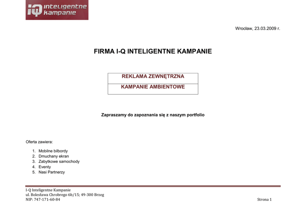 Wrocław, 23.03.2009 r. FIRMA I-Q INTELIGENTNE KAMPANIE REKLAMA ZEWNĘTRZNA KAMPANIE AMBIENTOWE Zapraszamy do zapoznania się z naszym portfolio Oferta zawiera: 1. 2. 3. 4. 5. Mobilne bilbordy Dmuchany ekran Zabytkowe samochody Eventy Nasi Partnerzy I-Q Inteligentne Kampanie ul. Bolesława Chrobrego 6b/15; 49-300 Brzeg NIP: 747-171-60-84 Strona 1 1. Do wykorzystania w całej Polsce posiadamy 90 mobilnych bilbordów . Mobilne bilbordy to przede wszystkim: Możliwość dotarcia do każdej miejscowości Krótki czas na przygotowanie kampanii Skuteczne wsparcie do kampanii prowadzonych za pomocą innych mediów Aktywne oddziaływanie na odbiorców poprzez reklamę dźwiękową Atrakcyjne ceny - za dzień ekspozycji bilbordu już od 295 zł netto! I-Q Inteligentne Kampanie ul. Bolesława Chrobrego 6b/15; 49-300 Brzeg NIP: 747-171-60-84 Strona 2 Mobil porusza się z prędkością 35-50 km / h, emitując spot reklamowy, zwraca uwagę większości przechodniów. Bilbordy ruchome poruszające się w kolumnie, generują ogromną liczbę kontaktów wzrokowych . Korzystając z technologii GPS, danych na temat natężenia ruchu ulicznego opracujemy dla Państwa trasę i wyślemy mobile tam, gdzie znajduje się Państwa target. I-Q Inteligentne Kampanie ul. Bolesława Chrobrego 6b/15; 49-300 Brzeg NIP: 747-171-60-84 Strona 3 2. Dmuchane ekrany… …są w tej chwili bardzo atrakcyjną formą reklamy zewnętrznej. Swoimi gabarytami zwracają uwagę w mieście. Sprawdzają się również jako ekrany do wyświetlania różnego rodzaju spotów reklamowych, filmów prezentacyjnych, czy zdjęć. I-Q Inteligentne Kampanie ul. Bolesława Chrobrego 6b/15; 49-300 Brzeg NIP: 747-171-60-84 Strona 4 3. Zabytkowe samochody Zabytkowe samochody zwracają uwagę niemal Wszystkich przechodniów Istnieje możliwość oklejenia samochodów, co zwiększa atrakcyjność przekazu I-Q Inteligentne Kampanie ul. Bolesława Chrobrego 6b/15; 49-300 Brzeg NIP: 747-171-60-84 Strona 5 4. Eventy Firma I-Q Inteligentne Kampanie zajmuje się organizacją działań niestandardowych, tzw. kampanii ambientowych. Jednym z naszych ostatnich tego typu projektów jest „Dzień życzliwości” zleconych przez Miasto Wrocław. Nasz zespół może dla Państwa przygotować strategię niestandardowej kampanii, z wykorzystaniem innowacyjnych nośników: projektory multimedialne, mobilne bilbordy, eventy oraz prezentacje. Posiadamy świetne lokalizacje ścian, które wykorzystujemy do projekcji w dobrych cenach. Możemy przygotować dla Państwa przykładową projekcję, dzięki której sprawdzą Państwo efekty i możliwości tej reklamy. Ceny już od 85 zł netto / h projekcji multimedialnej. I-Q Inteligentne Kampanie ul. Bolesława Chrobrego 6b/15; 49-300 Brzeg NIP: 747-171-60-84 Strona 6 5. Prezentujemy wybranych partnerów: I-Q Inteligentne Kampanie ul. Bolesława Chrobrego 6b/15; 49-300 Brzeg NIP: 747-171-60-84 Strona 7 Zapraszamy do kontaktu. Marcin Wolak I-Q Inteligentne Kampanie Oddział Wrocław: ul. Generała Władysława Sikorskiego 2-8 53-659 Wrocław tel: 071 735 18 34 kom: 662 434 567 Mail: [email protected] http: www.i-q.pl Siedziba Firmy: ul. B. Chrobrego 6b/15 49-300 Brzeg NIP: 747-171-60-84 REGON: 532410246 I-Q Inteligentne Kampanie ul. Bolesława Chrobrego 6b/15; 49-300 Brzeg NIP: 747-171-60-84 Strona 8