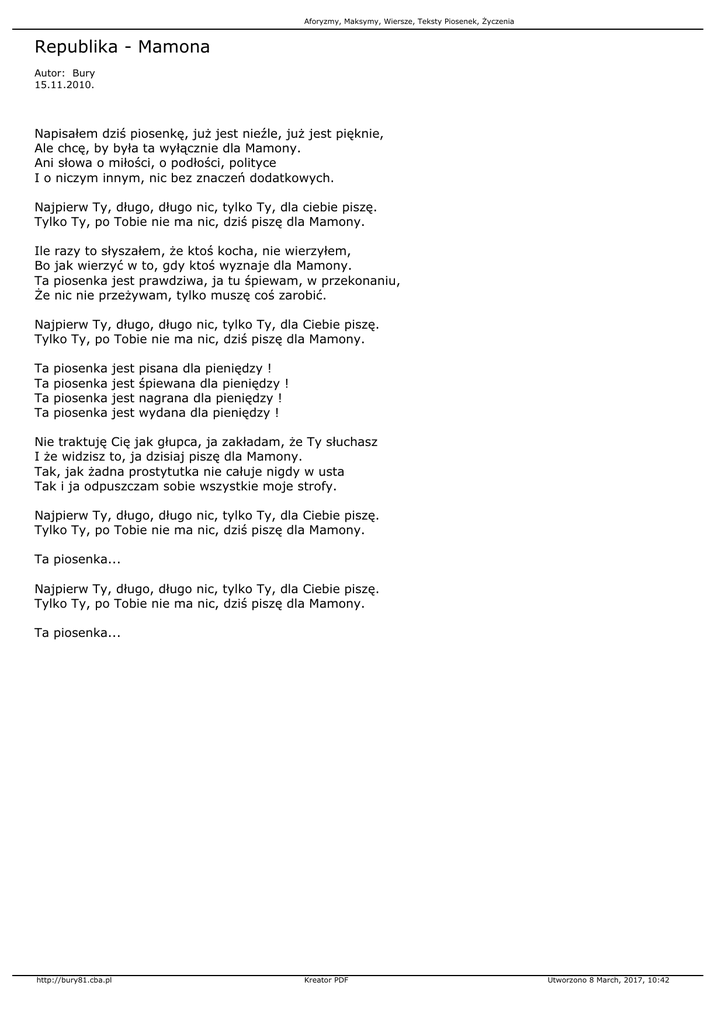 Aforyzmy, Maksymy, Wiersze, Teksty Piosenek, Życzenia Republika - Mamona Autor: Bury 15.11.2010. Napisałem dziś piosenkę, już jest nieźle, już jest pięknie, Ale chcę, by była ta wyłącznie dla Mamony. Ani słowa o miłości, o podłości, polityce I o niczym innym, nic bez znaczeń dodatkowych. Najpierw Ty, długo, długo nic, tylko Ty, dla ciebie piszę. Tylko Ty, po Tobie nie ma nic, dziś piszę dla Mamony. Ile razy to słyszałem, że ktoś kocha, nie wierzyłem, Bo jak wierzyć w to, gdy ktoś wyznaje dla Mamony. Ta piosenka jest prawdziwa, ja tu śpiewam, w przekonaniu, Że nic nie przeżywam, tylko muszę coś zarobić. Najpierw Ty, długo, długo nic, tylko Ty, dla Ciebie piszę. Tylko Ty, po Tobie nie ma nic, dziś piszę dla Mamony. Ta Ta Ta Ta piosenka piosenka piosenka piosenka jest jest jest jest pisana dla pieniędzy ! śpiewana dla pieniędzy ! nagrana dla pieniędzy ! wydana dla pieniędzy ! Nie traktuję Cię jak głupca, ja zakładam, że Ty słuchasz I że widzisz to, ja dzisiaj piszę dla Mamony. Tak, jak żadna prostytutka nie całuje nigdy w usta Tak i ja odpuszczam sobie wszystkie moje strofy. Najpierw Ty, długo, długo nic, tylko Ty, dla Ciebie piszę. Tylko Ty, po Tobie nie ma nic, dziś piszę dla Mamony. Ta piosenka... Najpierw Ty, długo, długo nic, tylko Ty, dla Ciebie piszę. Tylko Ty, po Tobie nie ma nic, dziś piszę dla Mamony. Ta piosenka... http://bury81.cba.pl Kreator PDF Utworzono 8 March, 2017, 10:42