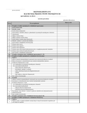 ................................. (pieczęć jednostki) SKONSOLIDOWANY RACHUNEK PRZEPŁYWÓW PIENIĘŻNYCH sporządzony za okres . . . . . . . . . . . . . . . . . . . . . . . . . . . . . . . . . . . . . . . . . . . . . . . . . . . . . (metoda pośrednia) jednostka obliczeniowa: . . . . . . . Wiersz Wyszczególnienie A. I. II. 1. 2. 3. 4. 5. 6. 7. 8. 9. 10. 11. 12. 13. 14. Przepływy środków pieniężnych z działalności operacyjnej Zysk (strata) netto Korekty razem Zyski (straty) mniejszości Zysk (strata) z udziałów (akcji) w jednostkach wycenianych metodą praw własności Amortyzacja Odpisy wartości firmy Odpisy ujemnej wartości firmy Zyski (straty) z tytułu różnic kursowych Odsetki i udziały w zyskach (dywidendy) Zysk (strata) z działalności inwestycyjnej Zmiana stanu rezerw Zmiana stanu zapasów Zmiana stanu należności Zmiana stanu zobowiązań krótkoterminowych, z wyjątkiem pożyczek i kredytów Zmiana stanu rozliczeń międzyokresowych Inne korekty z działalności operacyjnej III. B. I. 1. 2. 3. Przepływy pieniężne netto z działalności operacyjnej (I+/–II) Przepływy środków pieniężnych z działalności inwestycyjnej Wpływy Zbycie wartości niematerialnych i prawnych oraz rzeczowych aktywów trwałych Zbycie inwestycji w nieruchomości oraz wartości niematerialne i prawne Z aktywów finansowych, w tym: a) w jednostkach wycenianych metodą praw własności b) w pozostałych jednostkach - zbycie aktywów finansowych - dywidendy i udziały w zyskach - spłata udzielonych pożyczek długoterminowych - odsetki - inne wpływy z aktywów finansowych Inne wpływy inwestycyjne Wydatki Nabycie wartości niematerialnych i prawnych oraz rzeczowych aktywów trwałych Inwestycje w nieruchomości oraz wartości niematerialne i prawne Na aktywa finansowe, w tym: a) w jednostkach wycenianych metodą praw własności b) w pozostałych jednostkach - nabycie aktywów finansowych - udzielone pożyczki długoterminowe 4. II. 1. 2. 3. 4. Dywidendy i inne udziały w zyskach wypłacone udziałowcom (akcjonariuszom) mniejszościowym 5. III. Inne wydatki inwestycyjne Przepływy pieniężne netto z działalności inwestycyjnej (I–II) C. I. Przepływy środków pieniężnych z działalności finansowej Wpływy Wpływy netto z wydania udziałów (emisji akcji) i innych instrumentów kapitałowych oraz dopłat do kapitału 1. Dane za rok 2. 3. 4. II. 1. 2. 3. 4. 5. 6. 7. 8. 9. III. Kredyty i pożyczki Emisja dłużnych papierów wartościowych Inne wpływy finansowe Wydatki Nabycie udziałów (akcji) własnych Dywidendy i inne wypłaty na rzecz właścicieli Inne niż wypłaty na rzecz właścicieli wydatki z tytułu podziału zysku Spłaty kredytów i pożyczek Wykup dłużnych papierów wartościowych Z tytułu innych zobowiązań finansowych Płatności zobowiązań z tytułu umów leasingu finansowego Odsetki Inne wydatki finansowe Przepływy pieniężne netto z działalności finansowej (I–II) D. E. Przepływy pieniężne netto, razem (A.III+/–B.III+/–C.III) Bilansowa zmiana stanu środków pieniężnych, w tym: - zmiana stanu środków pieniężnych z tytułu różnic kursowych Środki pieniężne na początek okresu Środki pieniężne na koniec okresu (F+/–D), w tym: - o ograniczonej możliwości dysponowania F. G. ...... ....... .................................................. (Data i podpis osoby, której powierzono prowadzenie ksiąg rachunkowych / osób odpowiedzialnych za sporządzenie skonsolidowanego sprawozdania finansowego) . . . . . . . . . . . . . . . . . . .. . . . . . . . . . . . . . . . . . . . . . . . . . . . . . . . . . . . . . . . . . (Data i podpis kierownika jednostki dominującej, a jeżeli jednostką kieruje organ wieloosobowy, wszystkich członków tego organu)