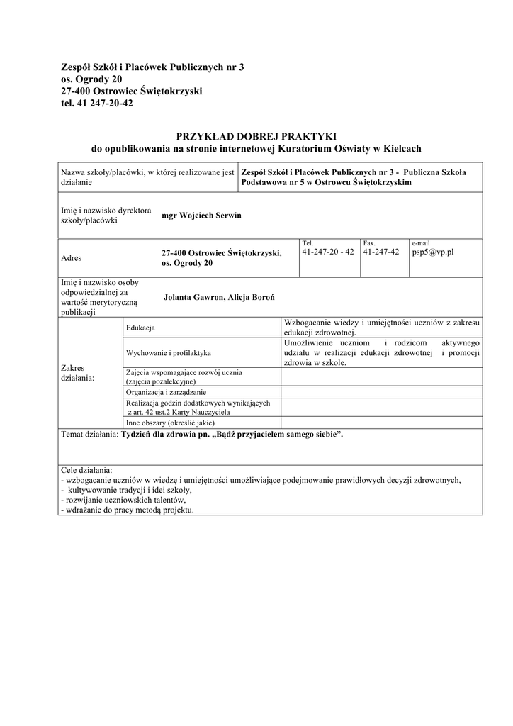 Zespół Szkół i Placówek Publicznych nr 3 os. Ogrody 20 27-400 Ostrowiec Świętokrzyski tel. 41 247-20-42 PRZYKŁAD DOBREJ PRAKTYKI do opublikowania na stronie internetowej Kuratorium Oświaty w Kielcach Nazwa szkoły/placówki, w której realizowane jest Zespół Szkół i Placówek Publicznych nr 3 - Publiczna Szkoła działanie Podstawowa nr 5 w Ostrowcu Świętokrzyskim Imię i nazwisko dyrektora szkoły/placówki mgr Wojciech Serwin Adres 27-400 Ostrowiec Świętokrzyski, os. Ogrody 20 Imię i nazwisko osoby odpowiedzialnej za wartość merytoryczną publikacji Jolanta Gawron, Alicja Boroń Edukacja Wychowanie i profilaktyka Zakres działania: Tel. Fax. e-mail 41-247-20 - 42 41-247-42 [email protected] Wzbogacanie wiedzy i umiejętności uczniów z zakresu edukacji zdrowotnej. Umożliwienie uczniom i rodzicom aktywnego udziału w realizacji edukacji zdrowotnej i promocji zdrowia w szkole. Zajęcia wspomagające rozwój ucznia (zajęcia pozalekcyjne) Organizacja i zarządzanie Realizacja godzin dodatkowych wynikających z art. 42 ust.2 Karty Nauczyciela Inne obszary (określić jakie) Temat działania: Tydzień dla zdrowia pn. „Bądź przyjacielem samego siebie”. Cele działania: - wzbogacanie uczniów w wiedzę i umiejętności umożliwiające podejmowanie prawidłowych decyzji zdrowotnych, - kultywowanie tradycji i idei szkoły, - rozwijanie uczniowskich talentów, - wdrażanie do pracy metodą projektu. Opis działania: Od 1998 roku nasza szkoła należy do Europejskiej Sieci Szkół Promujących Zdrowie. Systematycznie i aktywnie realizujemy zadania związane z promocją zdrowia. Od ośmiu lat organizujemy „Tydzień dla zdrowia”. W jego organizację angażuje się cała społeczność szkoły. Włączają się również władze lokalne, zaproszeni goście w osobach lokalnych przedsiębiorców, którzy są sponsorami nagród oraz rodzice. Nad organizacją sprawuje nadzór dyrekcja szkoły i szkolny koordynator promocji zdrowia. Poszczególne klasy lub grupy uczniów zgłaszają swoje propozycje działań, które są zgodne z potrzebami naszej placówki. Wiele z tych działań realizowane są metodą projektów. Z tych propozycji Szkolny Zespół Promocji Zdrowia opracowuje program ,,Tygodnia dla zdrowia’’, w którym są zaplanowane różnorodne działania. Największym powodzeniem cieszą się następujące imprezy: - Turniej tańca dyskotekowego z udziałem uczniów klas I – VI. - Konkurs piosenki turystycznej dla uczniów klas I – III. Prezentują się grupy i indywidualni wykonawcy. - Pogadanki w klasach na aktualnie ważne tematy. Materiały przygotowują pedagodzy i pielęgniarka szkolna. - Szkolny konkurs na najładniejszą salę zajęć w dwóch kategoriach: klasy I – III, IV – VI organizowanym prze Mały Samorządzik i Samorząd Uczniowski. - Pokaz multimedialny dla uczniów klas I – V. Prezentacje przygotowują uczniowie klas VI pod opieką nauczycieli informatyków. - Szkolny konkurs literacki o tematyce zdrowotnej, w którym biorą udział uczniowie klas IV – VI pod opieką nauczycieli polonistów. -Powiatowy Konkurs Recytatorski pn. „Zdrowie w poezji dziecięcej” z udziałem uczniów klas I – III oraz grup zerowych. Przy okazji odbywa się degustacja zdrowej żywności. - Pokaz udzielania pierwszej pomocy dla uczniów klas I – VI. - Wystawa plakatów, albumów i prac plastycznych nt. „Bądź przyjacielem przyrody i samego siebie”. - Program artystyczny o tematyce zdrowotnej przygotowany przez uczniów klas I – III. - Badanie komputerowe postawy wśród uczniów klas I metodą Moore przez pracowników Poradni Wad Postawy. - Rozgrywki sportowe klas IV – VI pod kierunkiem nauczycieli wychowania fizycznego. - Turniej na najbardziej usportowioną klasę I – III. - Spotkania z producentami zdrowej żywności (pszczelarz, właściciel gospodarstwa agroturystycznego, piekarz, ogrodnik). - Rajdy, wycieczki o charakterze rekreacyjnym, promujące aktywny styl życia. Opis uzyskanych efektów: Udział uczniów w uroczystościach, imprezach i konkursach zorganizowanych w „Tygodniu dla zdrowia” przyczynia się do podnoszenia wiedzy, umiejętności uczniów z zakresu dbałości o swoje zdrowie i innych, prawidłowego odżywiania, aktywnego wypoczynku, bezpieczeństwa, i zachowań ekologicznych. Daje możliwość rozwijania zdolności uczniów, aktywizowania ich na forum klasy i szkoły, jak również umożliwia doskonalenie umiejętności pracy metodą projektu. Wnioski z realizacji: Kontynuować organizowanie Tygodnia dla zdrowia, jako inicjatywy pożytecznej, kultywującej tradycje i idee szkoły. Instytucje wspomagające realizację podjętych działań: Ostrowiecka Spółdzielnia Mleczarska, władze lokalne, Samorząd Terytorialny,, Bank Żywności, Tecso, właściciele aptek. Uzasadnienie zgłoszenia: Organizowany przez naszą placówkę „Tydzień dla zdrowia” jest przedsięwzięciem promującym naszą placówkę i jej ideę w środowisku lokalnym. Jest działaniem prowadzonym przez wiele lat, a więc sprawdzonym i przynoszącym wymierne efekty. Trudności w realizacji: Ciągle szukamy nowych sponsorów nagród w konkursach i pokazach. Więcej funduszy dałoby nam większe możliwości w działaniu. Wykaz załączników: prezentacja multimedialna w „Tygodniu dla zdrowia”. Wyrażam zgodę na opublikowanie na stronie internetowej Kuratorium Oświaty w Kielcach przedstawionego przykładu dobrej praktyki. Ostrowiec Świętokrzyski, 28.05.2012 Miejscowość, data Wojciech Serwin Podpis dyrektora szkoły/placówki