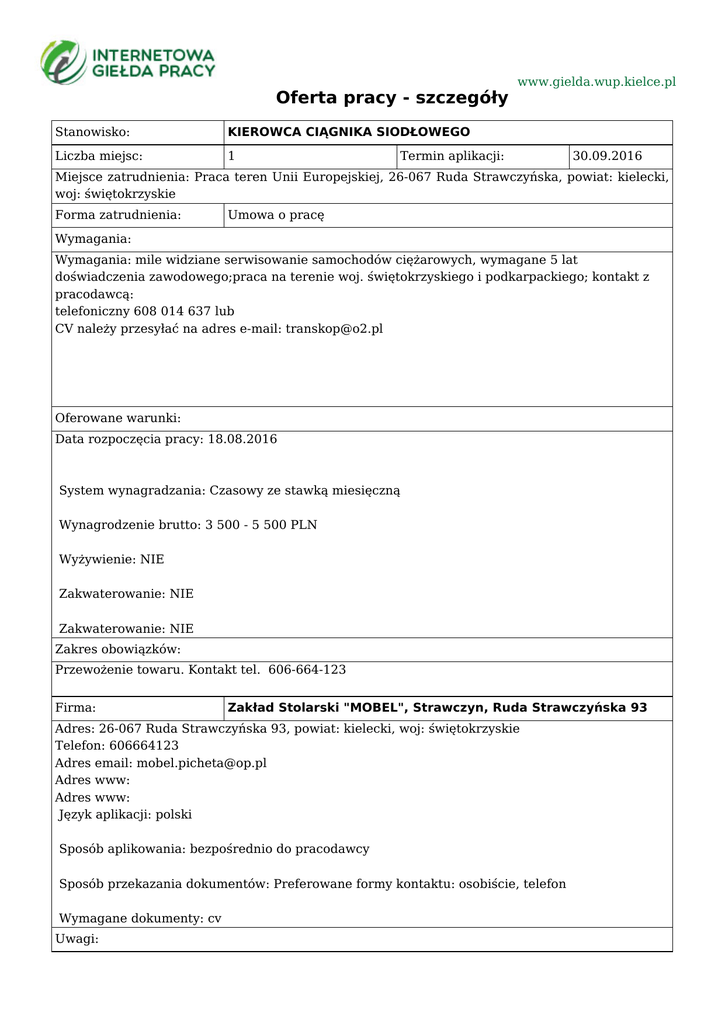 Oferta pracy - szczegóły Stanowisko: KIEROWCA CIĄGNIKA SIODŁOWEGO Liczba miejsc: 1 www.gielda.wup.kielce.pl Termin aplikacji: 30.09.2016 Miejsce zatrudnienia: Praca teren Unii Europejskiej, 26-067 Ruda Strawczyńska, powiat: kielecki, woj: świętokrzyskie Forma zatrudnienia: Umowa o pracę Wymagania: Wymagania: mile widziane serwisowanie samochodów ciężarowych, wymagane 5 lat doświadczenia zawodowego;praca na terenie woj. świętokrzyskiego i podkarpackiego; kontakt z pracodawcą: telefoniczny 608 014 637 lub CV należy przesyłać na adres e-mail: [email protected] Oferowane warunki: Data rozpoczęcia pracy: 18.08.2016 System wynagradzania: Czasowy ze stawką miesięczną Wynagrodzenie brutto: 3 500 - 5 500 PLN Wyżywienie: NIE Zakwaterowanie: NIE Zakwaterowanie: NIE Zakres obowiązków: Przewożenie towaru. Kontakt tel. 606-664-123 Firma: Zakład Stolarski "MOBEL", Strawczyn, Ruda Strawczyńska 93 Adres: 26-067 Ruda Strawczyńska 93, powiat: kielecki, woj: świętokrzyskie Telefon: 606664123 Adres email: [email protected] Adres www: Adres www: Język aplikacji: polski Sposób aplikowania: bezpośrednio do pracodawcy Sposób przekazania dokumentów: Preferowane formy kontaktu: osobiście, telefon Wymagane dokumenty: cv Uwagi: Identyfikator oferty: StPr/16/3483 Instytucja koordynująca ofertę: Powiatowy Urząd Pracy w Kielcach Urząd Pracy dokłada wszelkich starań, aby oferty pracy będące w zasobach urzędu, były rzetelne i wiarygodne. Ponieważ wszystkie oferty pracy pochodzą od osób trzecich Urząd Pracy zastrzega, że odpowiedzialność za ewentualne rozbieżności pomiędzy warunkami pracy zaprezentowanymi w niniejszej ofercie a warunkami zaproponowanymi przez potencjalnego pracodawcę ponosi pracodawca.
