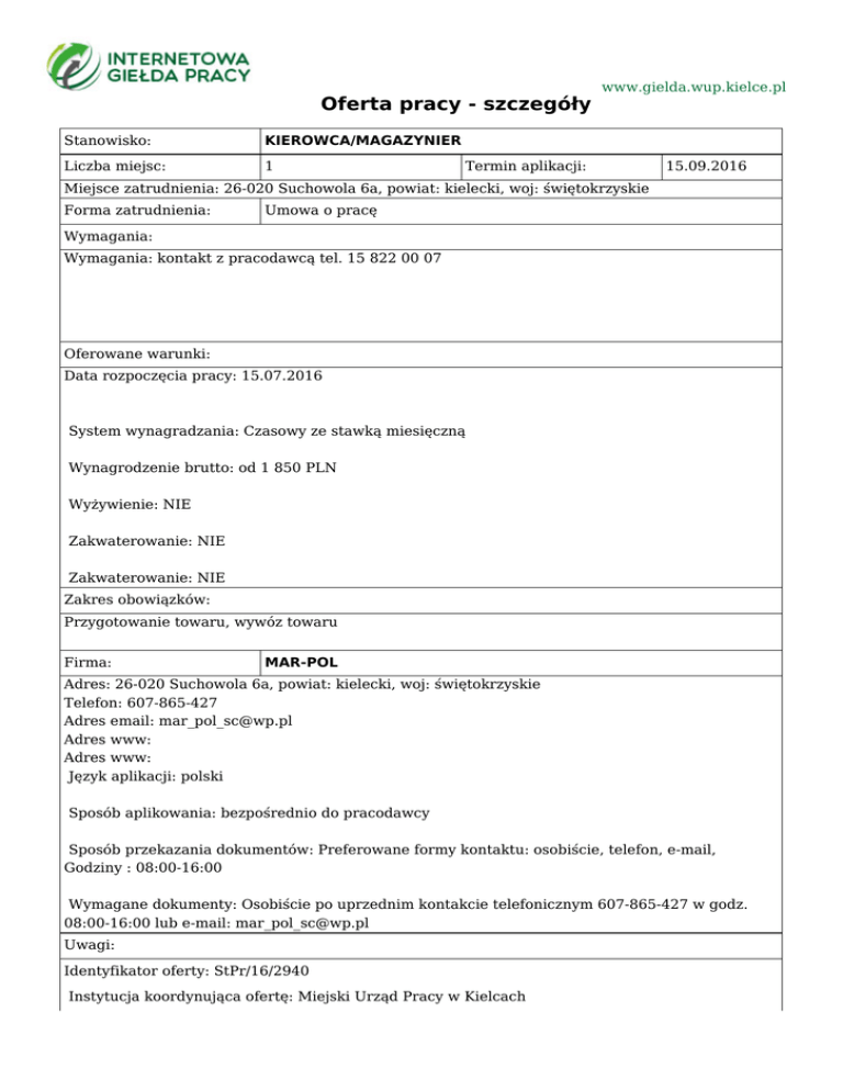 Oferta pracy - szczegóły Stanowisko: KIEROWCA/MAGAZYNIER Liczba miejsc: 1 www.gielda.wup.kielce.pl Termin aplikacji: 15.09.2016 Miejsce zatrudnienia: 26-020 Suchowola 6a, powiat: kielecki, woj: świętokrzyskie Forma zatrudnienia: Umowa o pracę Wymagania: Wymagania: kontakt z pracodawcą tel. 15 822 00 07 Oferowane warunki: Data rozpoczęcia pracy: 15.07.2016 System wynagradzania: Czasowy ze stawką miesięczną Wynagrodzenie brutto: od 1 850 PLN Wyżywienie: NIE Zakwaterowanie: NIE Zakwaterowanie: NIE Zakres obowiązków: Przygotowanie towaru, wywóz towaru Firma: MAR-POL Adres: 26-020 Suchowola 6a, powiat: kielecki, woj: świętokrzyskie Telefon: 607-865-427 Adres email: [email protected] Adres www: Adres www: Język aplikacji: polski Sposób aplikowania: bezpośrednio do pracodawcy Sposób przekazania dokumentów: Preferowane formy kontaktu: osobiście, telefon, e-mail, Godziny : 08:00-16:00 Wymagane dokumenty: Osobiście po uprzednim kontakcie telefonicznym 607-865-427 w godz. 08:00-16:00 lub e-mail: [email protected] Uwagi: Identyfikator oferty: StPr/16/2940 Instytucja koordynująca ofertę: Miejski Urząd Pracy w Kielcach Urząd Pracy dokłada wszelkich starań, aby oferty pracy będące w zasobach urzędu, były rzetelne i wiarygodne. Ponieważ wszystkie oferty pracy pochodzą od osób trzecich Urząd Pracy zastrzega, że odpowiedzialność za ewentualne rozbieżności pomiędzy warunkami pracy zaprezentowanymi w niniejszej ofercie a warunkami zaproponowanymi przez potencjalnego pracodawcę ponosi pracodawca.