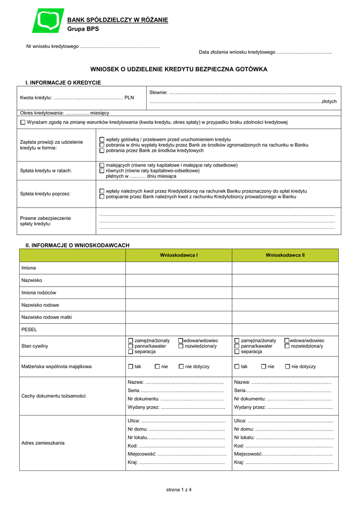 BANK SPÓŁDZIELCZY W RÓŻANIE Grupa BPS Nr wniosku kredytowego ………………………………………….. Data złożenia wniosku kredytowego …………………………….. WNIOSEK O UDZIELENIE KREDYTU BEZPIECZNA GOTÓWKA I. INFORMACJE O KREDYCIE Słownie: ……………………………..…………………….……………………………………… Kwota kredytu: …………….………………………. PLN ………………….………………………………..…………………………………………złotych Okres kredytowania: …………… miesięcy Wyrażam zgodę na zmianę warunków kredytowania (kwota kredytu, okres spłaty) w przypadku braku zdolności kredytowej Zapłata prowizji za udzielenie kredytu w formie: wpłaty gotówką / przelewem przed uruchomieniem kredytu pobrania w dniu wypłaty kredytu przez Bank ze środków zgromadzonych na rachunku w Banku pobrania przez Bank ze środków kredytowych Spłata kredytu w ratach: malejących (równe raty kapitałowe i malejące raty odsetkowe) równych (równe raty kapitałowo-odsetkowe) płatnych w ………. dniu miesiąca Spłata kredytu poprzez: wpłaty należnych kwot przez Kredytobiorcę na rachunek Banku przeznaczony do spłat kredytu potrącanie przez Bank należnych kwot z rachunku Kredytobiorcy prowadzonego w Banku Prawne zabezpieczenie spłaty kredytu: ………………………………………………………………………………………………………………………………… ………………………………………………………………………………………………………………………………… ………………………………………………………………………………………………………………………………… II. INFORMACJE O WNIOSKODAWCACH Wnioskodawca I Wnioskodawca II Imiona Nazwisko Imiona rodziców Nazwisko rodowe Nazwisko rodowe matki PESEL Stan cywilny zamężna/żonaty panna/kawaler separacja Małżeńska wspólnota majątkowa tak Cechy dokumentu tożsamości Adres zamieszkania nie wdowa/wdowiec rozwiedziona/y nie dotyczy zamężna/żonaty panna/kawaler separacja tak nie wdowa/wdowiec rozwiedziona/y nie dotyczy Nazwa: …………………………………………. Nazwa: ………………………….………………. Seria…………………………………………….. Seria…………………………….……………….. Nr dokumentu: ……………….………………… Nr dokumentu: …………….…….……………… Wydany przez: ................................................ Wydany przez: ................................................. Ulica: ………………………….…………………. Ulica: ……………………………………………... Nr domu: ………………….…………………….. Nr domu: …………………………………………. Nr lokalu………………….……………………… Nr lokalu: …………………….…………………… Kod: ……………………………………………... Kod: …………………………….………………… Miejscowość: …………………….……………… Miejscowość………………….………………….. Kraj: ……………………………………………... Kraj: ………………………….…………………… strona 1 z 4 Wnioskodawca I Adres do korespondencji Nr telefonu (do wyboru) Wnioskodawca II Ulica……...………………………….…………… Ulica……...…………………….….……………… Nr domu: ……...………………………………… Nr domu: ……...…………………….…………… Nr lokalu: ……...……………...………………… Nr lokalu: ……...…………….…………………… Kod……...………….……….…………………… Kod……...………..…………….………………… Miejscowość: ……...…………………………… Miejscowość: …………....……………………… Kraj: ……...……………………………………… Kraj: ……...…………….………………………… stacjonarny…………………………….………… stacjonarny: ……………………………………… komórkowy: ………………………….………….. komórkowy: ……………………….……………… E-mail: Wykształcenie wyższe magisterskie licencjat/inżynier średnie zasadnicze zawodowe podstawowe/gimnazjalne wyższe magisterskie licencjat/inżynier średnie zasadnicze zawodowe podstawowe/gimnazjalne nie posiadam posiadam ................. nie posiadam posiadam ................. Wykonywany zawód Rachunek w BS Różan III. INFORMACJE O DOCHODACH I WYDATKACH Wnioskodawca I Wnioskodawca II Całkowity staż pracy (w latach) Okres zatrudnienia u obecnego pracodawcy/czas prowadzenia obecnej dział. gospodarczej (w latach) Informacje o pracodawcy (nazwa, adres) Stanowisko Miesięczny dochód netto: Źródła dochodu właściciel firmy wyższa kadra zarządzająca średnia kadra zarządzająca urzędnik specjalista pracownik inne ..................................... PLN, w tym: umowa o pracę: .................................... emerytura: ............................................ renta: .................................................... zasiłek przedemerytalny: ...................... wolne zawody: ...................................... działalność gospodarcza: ..................... działalność rolnicza: ............................. umowa cywilno-prawna: ....................... umowa najmu: ...................................... umowa o pracę na czas określony do…….................: ............................... odsetki z aktywów finansowych: ............................................................. dywidendy: ........................................... i