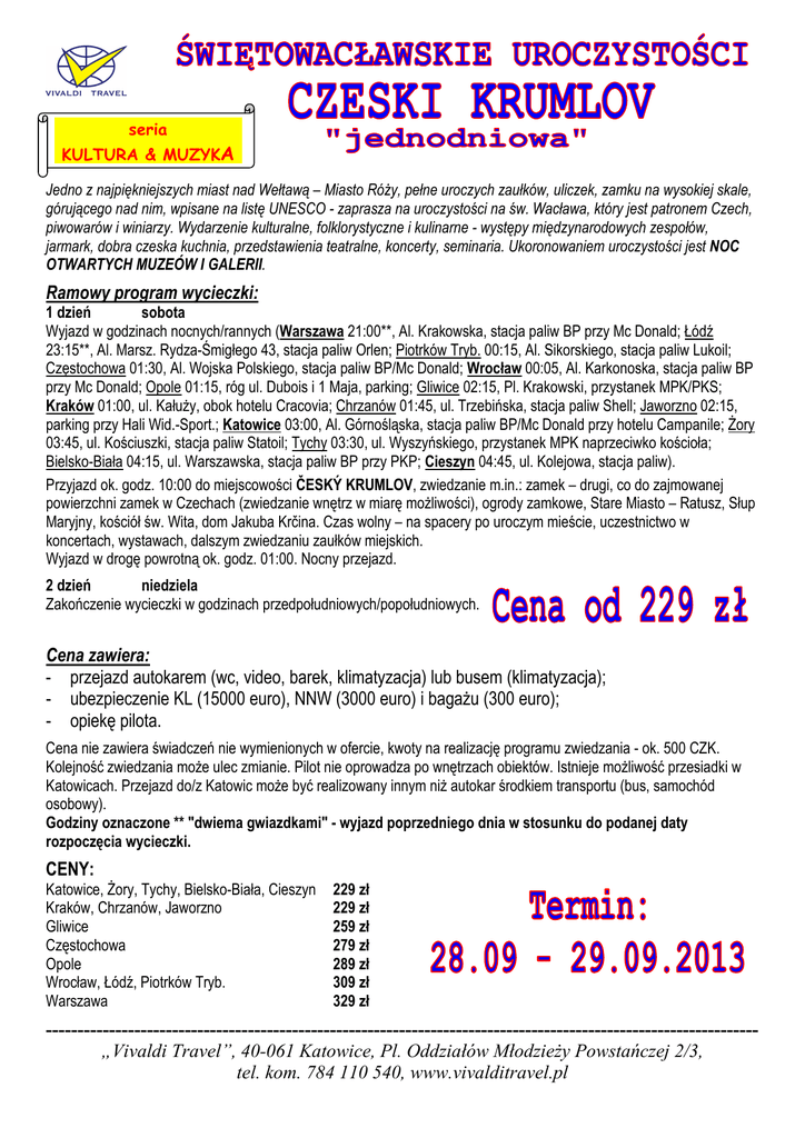 seria KULTURA & MUZYKA Jedno z najpiękniejszych miast nad Wełtawą – Miasto Róży, pełne uroczych zaułków, uliczek, zamku na wysokiej skale, górującego nad nim, wpisane na listę UNESCO - zaprasza na uroczystości na św. Wacława, który jest patronem Czech, piwowarów i winiarzy. Wydarzenie kulturalne, folklorystyczne i kulinarne - występy międzynarodowych zespołów, jarmark, dobra czeska kuchnia, przedstawienia teatralne, koncerty, seminaria. Ukoronowaniem uroczystości jest NOC OTWARTYCH MUZEÓW I GALERII. Ramowy program wycieczki: 1 dzień sobota Wyjazd w godzinach nocnych/rannych (Warszawa 21:00**, Al. Krakowska, stacja paliw BP przy Mc Donald; Łódź 23:15**, Al. Marsz. Rydza-Śmigłego 43, stacja paliw Orlen; Piotrków Tryb. 00:15, Al. Sikorskiego, stacja paliw Lukoil; Częstochowa 01:30, Al. Wojska Polskiego, stacja paliw BP/Mc Donald; Wrocław 00:05, Al. Karkonoska, stacja paliw BP przy Mc Donald; Opole 01:15, róg ul. Dubois i 1 Maja, parking; Gliwice 02:15, Pl. Krakowski, przystanek MPK/PKS; Kraków 01:00, ul. Kałuży, obok hotelu Cracovia; Chrzanów 01:45, ul. Trzebińska, stacja paliw Shell; Jaworzno 02:15, parking przy Hali Wid.-Sport.; Katowice 03:00, Al. Górnośląska, stacja paliw BP/Mc Donald przy hotelu Campanile; Żory 03:45, ul. Kościuszki, stacja paliw Statoil; Tychy 03:30, ul. Wyszyńskiego, przystanek MPK naprzeciwko kościoła; Bielsko-Biała 04:15, ul. Warszawska, stacja paliw BP przy PKP; Cieszyn 04:45, ul. Kolejowa, stacja paliw). Przyjazd ok. godz. 10:00 do miejscowości ČESKÝ KRUMLOV, zwiedzanie m.in.: zamek – drugi, co do zajmowanej powierzchni zamek w Czechach (zwiedzanie wnętrz w miarę możliwości), ogrody zamkowe, Stare Miasto – Ratusz, Słup Maryjny, kościół św. Wita, dom Jakuba Krčina. Czas wolny – na spacery po uroczym mieście, uczestnictwo w koncertach, wystawach, dalszym zwiedzaniu zaułków miejskich. Wyjazd w drogę powrotną ok. godz. 01:00. Nocny przejazd. 2 dzień niedziela Zakończenie wycieczki w godzinach przedpołudniowych/popołudniowych. Cena zawiera: - przejazd autokarem (wc, video, barek, klimatyzacja) lub busem (klimatyzacja); - ubezpieczenie KL (15000 euro), NNW (3000 euro) i bagażu (300 euro); - opiekę pilota. Cena nie zawiera świadczeń nie wymienionych w ofercie, kwoty na realizację programu zwiedzania - ok. 500 CZK. Kolejność zwiedzania może ulec zmianie. Pilot nie oprowadza po wnętrzach obiektów. Istnieje możliwość przesiadki w Katowicach. Przejazd do/z Katowic może być realizowany innym niż autokar środkiem transportu (bus, samochód osobowy). Godziny oznaczone ** "dwiema gwiazdkami" - wyjazd poprzedniego dnia w stosunku do podanej daty rozpoczęcia wycieczki. CENY: Katowice, Żory, Tychy, Bielsko-Biała, Cieszyn Kraków, Chrzanów, Jaworzno Gliwice Częstochowa Opole Wrocław, Łódź, Piotrków Tryb. Warszawa 229 zł 229 zł 259 zł 279 zł 289 zł 309 zł 329 zł ----------------------------------------------------------------------------------------------------------------„Vivaldi Travel”, 40-061 Katowice, Pl. Oddziałów Młodzieży Powstańczej 2/3, tel. kom. 784 110 540, www.vivalditravel.pl