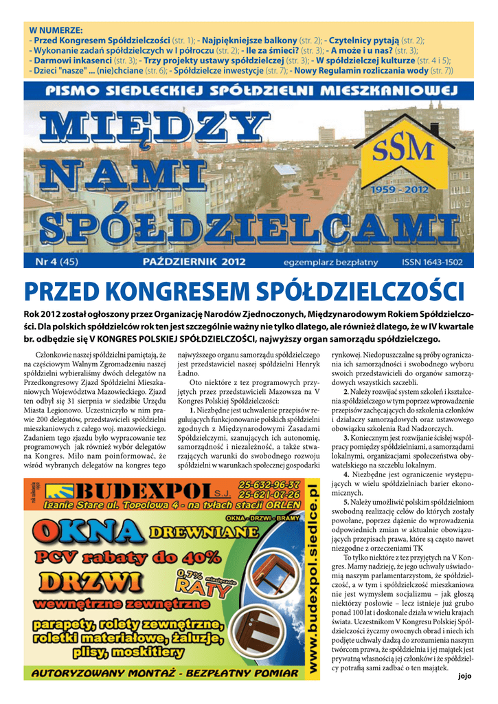 W NUMERZE: www.ssm.net.pl - Przed Kongresem Spółdzielczości (str. 1); - Najpiękniejsze balkony (str. 2); - Czytelnicy pytają (str. 2); - Wykonanie zadań spółdzielczych w I półroczu (str. 2); - Ile za śmieci? (str. 3); - A może i u nas? (str. 3); - Darmowi inkasenci (str. 3); - Trzy projekty ustawy spółdzielczej (str. 3); - W spółdzielczej kulturze (str. 4 i 5); - Dzieci "nasze" ... (nie)chciane (str. 6); - Spółdzielcze inwestycje (str. 7); - Nowy Regulamin rozliczania wody (str. 7)) PRZED KONGRESEM SPÓŁDZIELCZOŚCI Rok 2012 został ogłoszony przez Organizację Narodów Zjednoczonych, Międzynarodowym Rokiem Spółdzielczości. Dla polskich spółdzielców rok ten jest szczególnie ważny nie tylko dlatego, ale również dlatego, że w IV kwartale br. odbędzie się V KONGRES POLSKIEJ SPÓŁDZIELCZOŚCI, najwyższy organ samorządu spółdzielczego. Członkowie naszej spółdzielni pamiętają, że na częściowym Walnym Zgromadzeniu naszej spółdzielni wybieraliśmy dwóch delegatów na Przedkongresowy Zjazd Spółdzielni Mieszkaniowych Województwa Mazowieckiego. Zjazd ten odbył się 31 sierpnia w siedzibie Urzędu Miasta Legionowo. Uczestniczyło w nim prawie 200 delegatów, przedstawicieli spółdzielni mieszkaniowych z całego woj. mazowieckiego. Zadaniem tego zjazdu było wypracowanie tez programowych jak również wybór delegatów na Kongres. Miło nam poinformować, że wśród wybranych delegatów na kongres tego MIĘDZY NAMI SPÓŁDZIELCAMI najwyższego organu samorządu spółdzielczego jest przedstawiciel naszej spółdzielni Henryk Ładno. Oto niektóre z tez programowych przyjętych przez przedstawicieli Mazowsza na V Kongres Polskiej Spółdzielczości: 1. Niezbędne jest uchwalenie przepisów regulujących funkcjonowanie polskich spółdzielni zgodnych z Międzynarodowymi Zasadami Spółdzielczymi, szanujących ich autonomię, samorządność i niezależność, a także stwarzających warunki do swobodnego rozwoju spółdzielni w warunkach społecznej gospodarki PAŹDZIERNIK 2012 rynkowej. Niedopuszczalne są próby ograniczania ich samorządności i swobodnego wyboru swoich przedstawicieli do organów samorządowych wszystkich szczebli. 2. Należy rozwijać system szkoleń i kształcenia spółdzielczego w tym poprzez wprowadzenie przepisów zachęcających do szkolenia członków i działaczy samorządowych oraz ustawowego obowiązku szkolenia Rad Nadzorczych. 3. Koniecznym jest rozwijanie ścisłej współpracy pomiędzy spółdzielniami, a samorządami lokalnymi, organizacjami społeczeństwa obywatelskiego na szczeblu lokalnym. 4. Niezbędne jest ograniczenie występujących w wielu spółdzielniach barier ekonomicznych. 5. Należy umożliwić polskim spółdzielniom swobodną realizację celów do których zostały powołane, poprzez dążenie do wprowadzenia odpowiednich zmian w aktualnie obowiązujących przepisach prawa, które są często nawet niezgodne z orzeczeniami TK To tylko niektóre z tez przyjętych na V Kongres. Mamy nadzieję, że jego uchwały uświadomią naszym parlamentarzystom, że spółdzielczość, a w tym i spółdzielczość mieszkaniowa nie jest wymysłem socjalizmu – jak głoszą niektórzy posłowie – lecz istnieje już grubo ponad 100 lat i doskonale działa w wielu krajach świata. Uczestnikom V Kongresu Polskiej Spółdzielczości życzmy owocnych obrad i niech ich podjęte uchwały dadzą do zrozumienia naszym twórcom prawa, że spółdzielnia i jej majątek jest prywatną własnością jej członków i że spółdzielcy potrafią sami zadbać o ten majątek. jojo1 Aktualności www.ssm.net.pl Czytelnicy pytają MnS wyjaśnia Oświetlenie ulic Pan Jan P. zadzwonił do naszej redakcji z pytaniem„czy to prawda, że za oświetlenie niektórych osiedlowych ulic płaci spółdzielnia i jeżeli tak to dlaczego, gdyż po tych ulicach nie chodzą przecież tylko spółdzielcy?”. Z informacji jakie uzyskaliśmy w dziale rozliczeń spółdzielnia za oświetlenie ulic osiedlowych płaci do Urzędu Miasta około 140 tys. zł rocznie. To prawda, że po tych ulicach nie chodzą tylko spółdzielcy, ale ???? I tu można się zastanawiać i mieć wątpliwości, czy to słuszne, bo przecież my jako spółdzielcy płacimy takie same podatki jak mieszkańcy np. Nowych Siedlec, którym miasto oświetla drogę do samego domu i nie pobiera poza podatkami dodatkowych opłat za oświetlenie ulic. Myślę, że sprawę można ponownie przedyskutować (już kiedyś o tym pisaliśmy) na odpowiednim szczeblu i doprowadzić do tego żeby spółdzielcy nie ponosili dodatkowych dość znaczących w budżecie spółdzielni kosztów, bo przecież spółdzielcy to tacy sami mieszkańcy miasta jak Ci z innych zasobów mieszkaniowych. A może zwrócić się z tym problemem do radnych RM Siedlce, wśród których są również spółdzielcy? Kredyty mieszkaniowe Pani Krystyna z Osiedla „Roskosz” pisze, że słyszała o wydłużeniu okresu spłaty tzw. kredytów mieszkaniowych starego portfela, czy to prawda? Tak, to prawda. W m-cu wrześniu br. Rada Ministrów przyjęła projekt nowelizacji ustawy o pomocy państwa w spłacie niektórych kredytów mieszkaniowych. Z powyższego wynika, że spółdzielcy , którzy zamieszkują w lokalach na których ciążą te nieszczęsne długi będą mogli korzystać z preferencyjnych warunków spłaty do końca 2017r, a nie jak dotychczas, było zapisane w ustawie do końca 2012r.W naszej spółdzielni takich zadłużonych mieszkań pozostało już tylko 49. Telewizja cyfrowa Pan Janusz K. pyta, „czy po 1 lipca 2013 r. kiedy zostanie wyłączona telewizja analogowa będę zmuszony zakupić dekoder? Zaznaczam, że mam stary telewizor nie przystosowany do odbioru telewizji cyfrowej i nie mam telewizji kablowej tylko wnoszę opłatę 5,5zł w czynszu”. Według zapewnień operatora kablowego (Vectra), który dostarcza do naszych zasobów tzw. „pakiet stalowy” (opłata w czynszu) w skład którego