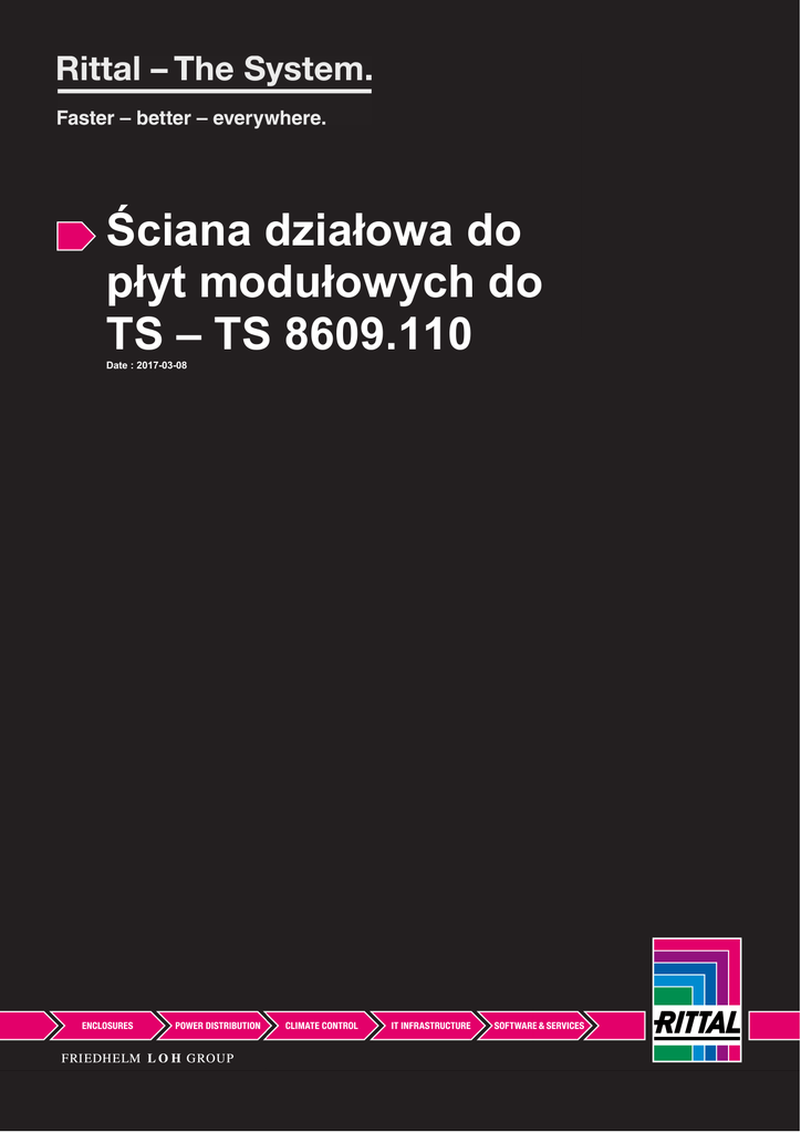 Ściana działowa do płyt modułowych do TS – TS 8609.110 Date : 2017-03-08 Ściana działowa do płyt modułowych do TS – TS 8609.110 created: 08.03.2017 on www.rittal.com/pl-pl Opis produktu Opis: Wycięcia do montażu płyt modułowych lub prowadzeń mogą służyć także do przeprowadzenia systemów szyn zbiorczych i innej zabudowy. Okołobieżne podwójne krawędzie służą stabilności i uszczelnieniu. Dzięki symetrii ramy szafy, można montować ściany działowe także z tyłu przy odpowiednich wymiarach. Korzyści: Więcej możliwości: Wycięcia ściany działowej są wyposażane indywidualnie w płyty modułowe dla łączników wtykowych 16 lub 24 biegunowych, w płyty modułowe przepustów kablowych i w zamknięte płyty modułowe. Szybki montaż: W zasadzie wykorzystuje się tylko część ze wszystkich wycięć wtykowych. Dzięki nowej technice ścian działowych, nie muszą być one pojedynczo przykrywane. Stosowana jest zamknięta płyta modułowa. Zalety: mniej płyt, mniej śrub, mniej nakładów montażowych. Zastosowania: Wycięcia w rogach i po bokach na połowie wysokości umożliwiają zastosowanie kątowników szeregujących i złączek także przy zamontowanej ścianie działowej. Materiał: blacha stalowa, 2,0 mm Powierzchnia: Ocynkowana Zakres dostawy: Łącznie z materiałem mocującym i samoformującymi się śrubami okrągłymi z wnętrzem sześciokątnym M5 x 12 mm do montażu płyt modułowych. Cechy produktu Pasujący do: © Rittal 2017 Typ obudowy: TS 8 Wysokość: = 1800 mm Głębokość: = 600 mm 1 Możliwości zabudowy: Montaż odbywa się na zewnętrznym poziomie mocowania Wewnętrzny poziom pozostaje wolny do dalszej zabudowy Wprowadzanie kabli: Liczba wycięć: 9 Ilość x średnica metryczna: 9 Jednostka opakowania: 1 szt. Masa/opak.: 9,95 kg EAN: 4028177893870 Numer taryfy celnej: 94039010 ETIM 6.0: EC002525 ETIM 5.0: EC002525 eCl@ss 8.0/8.1: 27182102 eCl@ss 7.0/7.1: 27182102 eCl@ss 6.0/6.1: 27182102 eCl@ss 5.1/5.1.4: 27182102 2017 © Rittal Sp. z o o. © Rittal 2017 2