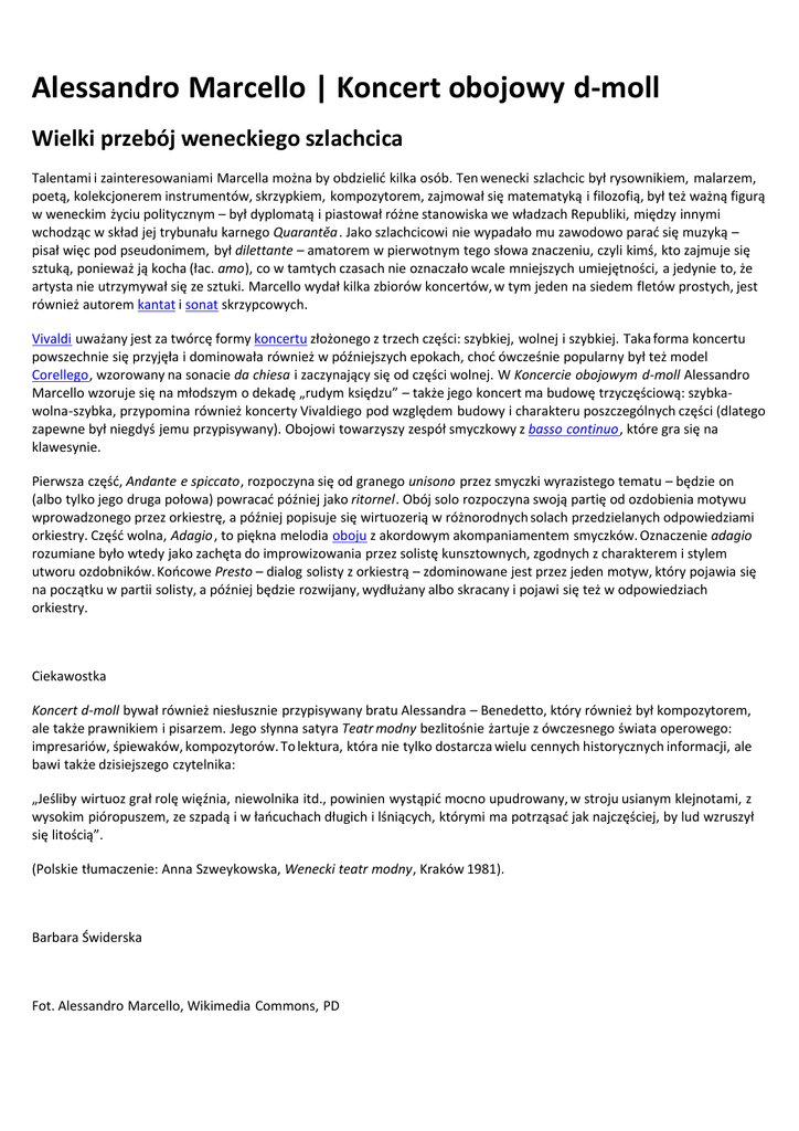 Alessandro Marcello | Koncert obojowy d-moll Wielki przebój weneckiego szlachcica Talentami i zainteresowaniami Marcella można by obdzielić kilka osób. Ten wenecki szlachcic był rysownikiem, malarzem, poetą, kolekcjonerem instrumentów, skrzypkiem, kompozytorem, zajmował się matematyką i filozofią, był też ważną figurą w weneckim życiu politycznym – był dyplomatą i piastował różne stanowiska we władzach Republiki, między innymi wchodząc w skład jej trybunału karnego Quarantěa. Jako szlachcicowi nie wypadało mu zawodowo parać się muzyką – pisał więc pod pseudonimem, był dilettante – amatorem w pierwotnym tego słowa znaczeniu, czyli kimś, kto zajmuje się sztuką, ponieważ ją kocha (łac. amo), co w tamtych czasach nie oznaczało wcale mniejszych umiejętności, a jedynie to, że artysta nie utrzymywał się ze sztuki. Marcello wydał kilka zbiorów koncertów, w tym jeden na siedem fletów prostych, jest również autorem kantat i sonat skrzypcowych. Vivaldi uważany jest za twórcę formy koncertu złożonego z trzech części: szybkiej, wolnej i szybkiej. Taka forma koncertu powszechnie się przyjęła i dominowała również w późniejszych epokach, choć ówcześnie popularny był też model Corellego, wzorowany na sonacie da chiesa i zaczynający się od części wolnej. W Koncercie obojowym d-moll Alessandro Marcello wzoruje się na młodszym o dekadę „rudym księdzu” – także jego koncert ma budowę trzyczęściową: szybkawolna-szybka, przypomina również koncerty Vivaldiego pod względem budowy i charakteru poszczególnych części (dlatego zapewne był niegdyś jemu przypisywany). Obojowi towarzyszy zespół smyczkowy z basso continuo, które gra się na klawesynie. Pierwsza część, Andante e spiccato, rozpoczyna się od granego unisono przez smyczki wyrazistego tematu – będzie on (albo tylko jego druga połowa) powracać później jako ritornel. Obój solo rozpoczyna swoją partię od ozdobienia motywu wprowadzonego przez orkiestrę, a później popisuje się wirtuozerią w różnorodnych solach przedzielanych odpowiedziami orkiestry. Część wolna, Adagio, to piękna melodia oboju z akordowym akompaniamentem smyczków. Oznaczenie adagio rozumiane było wtedy jako zachęta do improwizowania przez solistę kunsztownych, zgodnych z charakterem i stylem utworu ozdobników. Końcowe Presto – dialog solisty z orkiestrą – zdominowane jest przez jeden motyw, który pojawia się na początku w partii solisty, a później będzie rozwijany, wydłużany albo skracany i pojawi się też w odpowiedziach orkiestry. Ciekawostka Koncert d-moll bywał również niesłusznie przypisywany bratu Alessandra – Benedetto, który również był kompozytorem, ale także prawnikiem i pisarzem. Jego słynna satyra Teatr modny bezlitośnie żartuje z ówczesnego świata operowego: impresariów, śpiewaków, kompozytorów. To lektura, która nie tylko dostarcza wielu cennych historycznych informacji, ale bawi także dzisiejszego czytelnika: „Jeśliby wirtuoz grał rolę więźnia, niewolnika itd., powinien wystąpić mocno upudrowany, w stroju usianym klejnotami, z wysokim pióropuszem, ze szpadą i w łańcuchach długich i lśniących, którymi ma potrząsać jak najczęściej, by lud wzruszył się litością”. (Polskie tłumaczenie: Anna Szweykowska, Wenecki teatr modny, Kraków 1981). Barbara Świderska Fot. Alessandro Marcello, Wikimedia Commons, PD