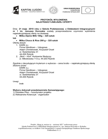 PROTOKÓŁ WYŁONIENIA NAJATRAKCYJNIEJSZEJ OFERTY Dnia 21 maja 2010 roku w Szkole Podstawowej z Oddziałami Integracyjnymi nr 1 im. Janusza Korczaka zostały przeprowadzone czynności wyłonienia najatrakcyjniejszej oferty na dostawę: • Milka Alpine Milk 100g – 325 sztuk lub • Milka Choco & Rice 200 g – 325 sztuk Ofertę złożyli: 1. DARK s.j. Firma Handlowo – Usługowa Adam Chmielowski, Krzysztof Orzeł ul. Świerklańska 31 44-200 Rybnik 2. „Słod – Hurt” Hurtownia Słodyczy ul. Mikołowska 113 a, 44-203 Rybnik Zgodnie z decydującym kryterium o wyborze – cena brutto – najatrakcyjniejszą ofertę złożono przez DARK s.j. Firma Handlowo – Usługowa Adam Chmielowski, Krzysztof Orzeł ul. Świerklańska 31 44-200 Rybnik Uwagi: brak Wyboru dokonali przedstawiciele Zamawiającego: 1) Zdzisław Plisz – koordynator projektu 2) Aleksandra Kolarczyk - organizator Projekt „Mogę ja, możesz ty – możemy MY” realizowany przez Szkołę Podstawową z Oddziałami Integracyjnymi nr 1 im. Janusza Korczaka w Rybniku współfinansowany ze środków Unii Europejskiej w ramach Europejskiego Funduszu Społecznego Poddziałanie 9.1.2