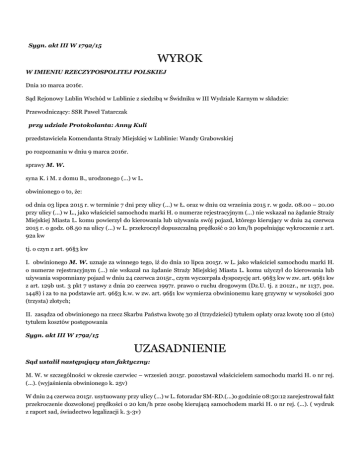Sygn. akt III W 1792/15 WYROK W IMIENIU RZECZYPOSPOLITEJ POLSKIEJ Dnia 10 marca 2016r. Sąd Rejonowy Lublin Wschód w Lublinie z siedzibą w Świdniku w III Wydziale Karnym w składzie: Przewodniczący: SSR Paweł Tatarczak przy udziale Protokolanta: Anny Kuli przedstawiciela Komendanta Straży Miejskiej w Lublinie: Wandy Grabowskiej po rozpoznaniu w dniu 9 marca 2016r. sprawy M. W. syna K. i M. z domu B., urodzonego (...) w L. obwinionego o to, że: od dnia 03 lipca 2015 r. w terminie 7 dni przy ulicy (...) w Ł. oraz w dniu 02 września 2015 r. w godz. 08.00 – 20.00 przy ulicy (...) w L., jako właściciel samochodu marki H. o numerze rejestracyjnym (...) nie wskazał na żądanie Straży Miejskiej Miasta L. komu powierzył do kierowania lub używania swój pojazd, którego kierujący w dniu 24 czerwca 2015 r. o godz. 08.50 na ulicy (...) w L. przekroczył dopuszczalną prędkość o 20 km/h popełniając wykroczenie z art. 92a kw tj. o czyn z art. 96§3 kw I. obwinionego M. W. uznaje za winnego tego, iż do dnia 10 lipca 2015r. w L. jako właściciel samochodu marki H. o numerze rejestracyjnym (...) nie wskazał na żądanie Straży Miejskiej Miasta L. komu użyczył do kierowania lub używania wspomniany pojazd w dniu 24 czerwca 2015r., czym wyczerpała dyspozycję art. 96§3 kw w zw. art. 96§1 kw z art. 129b ust. 3 pkt 7 ustawy z dnia 20 czerwca 1997r. prawo o ruchu drogowym (Dz.U. tj. z 2012r., nr 1137, poz. 1448) i za to na podstawie art. 96§3 k.w. w zw. art. 96§1 kw wymierza obwinionemu karę grzywny w wysokości 300 (trzysta) złotych; II. zasądza od obwinionego na rzecz Skarbu Państwa kwotę 30 zł (trzydzieści) tytułem opłaty oraz kwotę 100 zł (sto) tytułem kosztów postępowania Sygn. akt III W 1792/15 UZASADNIENIE Sąd ustalił następujący stan faktyczny: M. W. w szczególności w okresie czerwiec – wrzesień 2015r. pozostawał właścicielem samochodu marki H. o nr rej. (...). (wyjaśnienia obwinionego k. 25v) W dniu 24 czerwca 2015r. usytuowany przy ulicy (...) w L. fotoradar SM-RD.(...)o godzinie 08:50:12 zarejestrował fakt przekroczenie dozwolonej prędkości o 20 km/h prze osobę kierującą samochodem marki H. o nr rej. (...). ( wydruk z raport sad, świadectwo legalizacji k. 3-3v) Wobec powyższego Straż Miejska Miasta L. przesłała M. W. kopię raportu z fotoradaru wraz z drukami oświadczeń, na których winien był wskazać dane personalne osoby, która kierowała pojazdem w dniu 24 czerwca 2015r. W treści wezwania wskazano dwa alternatywne sposoby wykonania tego obowiązku. Pierwszy - wypełnienie i przesłanie do Straży Miejskiej Części A załącznika z oświadczeniem w terminie 7 dni. Drugi - osobiste stawiennictwo w terminie 7 dni w siedzibie Straży Miejskiej. M. W. skierowaną do niego korespondencję odebrał 3 lipca 2015r. i zapoznał się z nią. Jedynie telefonicznie poinformował Straż Miejską Miasta L., iż żona kierowała jego samochodem w dniu 24 czerwca 2015r. (pokwitowanie odbioru k.4, wyjaśnienia obwinionego k. 25v) Do dnia 18 sierpnia 2015 r. obwiniony nie wywiązał się jednak z tego obowiązku. W związku z tym Straż Miejska Miasta L. ponownie wezwała właściciela pojazdu – M. W. do wskazania kierującego pojazdem w wyżej wymienionym dniu. Wezwanie w imieniu obwinionego odebrała w dniu 20 sierpnia 2015 r. jego żona A. W. (potwierdzenie odbioru k.5). Obwiniony zapoznał się pismem, ale ponownie nie złożył pisemnego oświadczenia i nie stawił się na wezwanie do Straży Miejskiej Miasta L.. (wyjaśnienia obwinionego k.25v ) M. W. ma 29 lat, jest żonaty, ma dwie osoby na utrzymaniu. Z zawodu jest fizjoterapeutą. Pracuje jednak jako górnik osiągając dochód w wysokości około 4.000 złotych. Pozostaje właścicielem samochodu o wartości około 40.000 zł. (dane obwinionego k.25). Obwiniony M. W. (k.25-25v) przyznał się do popełnienia zarzucanego czynu. Potwierdził fakt otrzymania wezwania od Straży Miejskiej Miasta L., w którym był zobowiązany do pisemnego podania danych kierowcy poruszającego się jego pojazdem w dniu 24 czerwca 2015r., względnie osobistego stawiennictwa w siedzibie Straży. Nie złożył pisemnego oświadczenia i nie pojechał do siedziby Straży Miejskiej z uwagi na brak czasu. Jedynie telefonicznie poinformował, że pojazd prowadziła jego żona. W ocenie Sądu wyjaśnienia obwinionego są prawdziwe. Brak podstaw aby kwestionować wiarygodność jego słów, skoro korespondują z pozostałymi dowodami. Dowody w postaci wydruku z wideorejestratora wraz ze świadectwem legalizacji ( k. 3-3v), potwierdzeń odbioru pism (k.4,5), wezwania, skierowanego do obwinionego ( k. 17-18 ), ze względu na swój charakter i rzeczowy walor nie budziły wątpliwości Sądu co do ich wiarygodności. Żadna ze stron nie kwestionowała tych dokumentów. Przystępując do kwalifikacji prawnej czynu Sąd zważył, co następuje: Czyn obwinionego stanowi wykroczenie stypizowane w art. 96§3 k.w. Do znamion wykroczenia z art. 96§3 k.w. należy zachowanie sprawcy, który wbrew obowiązkowi nie wskaże na żądanie uprawnionego organu, komu powierzył pojazd do kierowania lub używania w oznaczonym czasie. Wykroczenie określone w tym przepisie ma na celu m.in. ustalenie kierującego pojazdem w razie popełnienia przestępstwa lub popełnienia wykroczenia z udziałem tego pojazdu. Przepis ten należy rozważać w kontekście art. 78 ust. 4 ustawy prawo o ruchu drogowym (Dz. U. 2005 nr 108 poz. 908 z późn. zm) zgodnie z którym właściciel lub posiadacz pojazdu jest obowiązany wskazać na żądanie uprawnionego organu, komu powierzył pojazd do kierowania lub używania w oznaczonym czasie, chyba że pojazd został użyty wbrew jego woli i wiedzy przez nieznaną osobę, czemu nie mógł zapobiec. Dokonując subsumpcji dostrzec trzeba, iż obwiniony jako właściciel samochodu marki H. nr rej. (...) w dniu 3 lipca 2015r. (data doręczenia) był wezwany do podania w terminie 7 dni komu użyczył