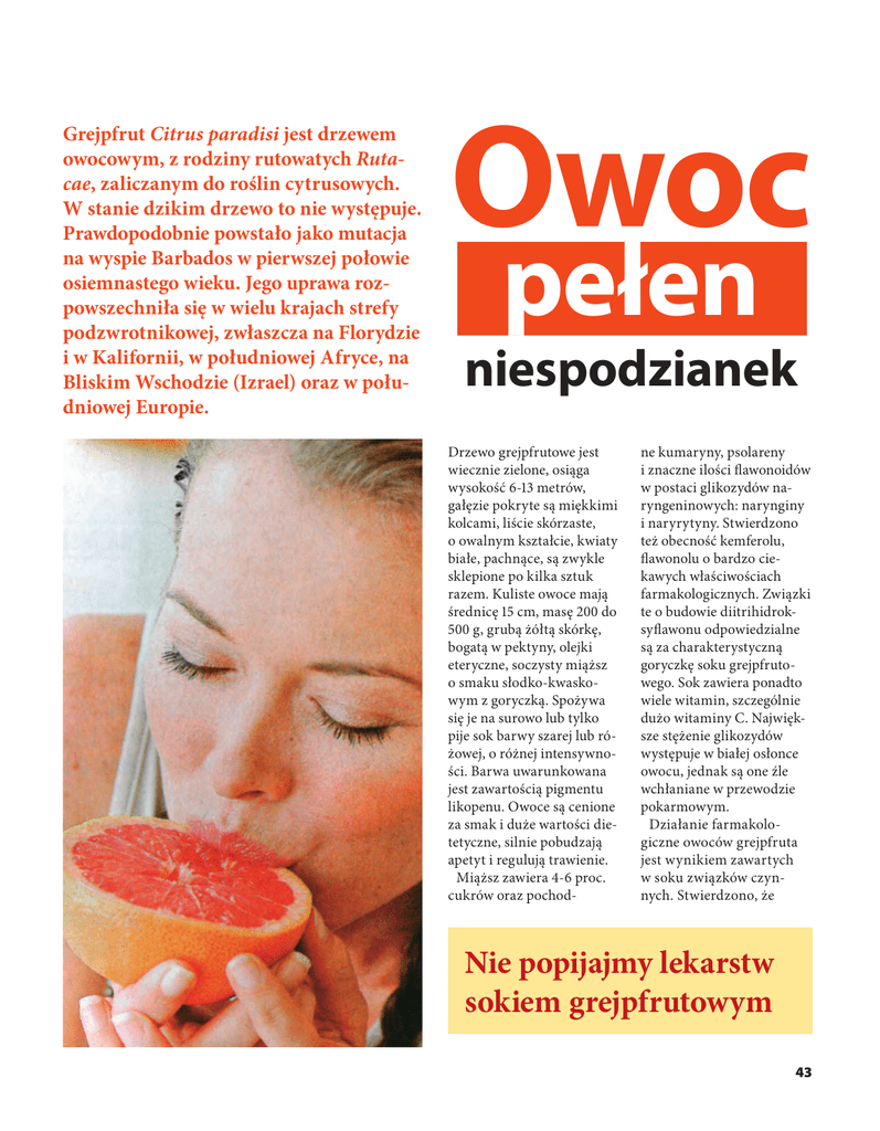 Grejpfrut Citrus paradisi jest drzewem owocowym, z rodziny rutowatych Rutacae, zaliczanym do roślin cytrusowych. W stanie dzikim drzewo to nie występuje. Prawdopodobnie powstało jako mutacja na wyspie Barbados w pierwszej połowie osiemnastego wieku. Jego uprawa rozpowszechniła się w wielu krajach strefy podzwrotnikowej, zwłaszcza na Florydzie i w Kalifornii, w południowej Afryce, na Bliskim Wschodzie (Izrael) oraz w południowej Europie. Owoc pełen niespodzianek Drzewo grejpfrutowe jest wiecznie zielone, osiąga wysokość 6-13 metrów, gałęzie pokryte są miękkimi kolcami, liście skórzaste, o owalnym kształcie, kwiaty białe, pachnące, są zwykle sklepione po kilka sztuk razem. Kuliste owoce mają średnicę 15 cm, masę 200 do 500 g, grubą żółtą skórkę, bogatą w pektyny, olejki eteryczne, soczysty miąższ o smaku słodko-kwasko wym z goryczką. Spożywa się je na surowo lub tylko pije sok barwy szarej lub ró żowej, o różnej intensywno ści. Barwa uwarunkowana jest zawartością pigmentu likopenu. Owoce są cenione za smak i duże wartości die tetyczne, silnie pobudzają apetyt i regulują trawienie. Miąższ zawiera 4-6 proc. cukrów oraz pochod ne kumaryny, psolareny i znaczne ilości flawonoidów w postaci glikozydów na ryngeninowych: narynginy i naryrytyny. Stwierdzono też obecność kemferolu, flawonolu o bardzo cie kawych właściwościach farmakologicznych. Związki te o budowie diitrihidrok syflawonu odpowiedzialne są za charakterystyczną goryczkę soku grejpfruto wego. Sok zawiera ponadto wiele witamin, szczególnie dużo witaminy C. Najwięk sze stężenie glikozydów występuje w białej osłonce owocu, jednak są one źle wchłaniane w przewodzie pokarmowym. Działanie farmakolo giczne owoców grejpfruta jest wynikiem zawartych w soku związków czyn nych. Stwierdzono, że Nie popijajmy lekarstw sokiem grejpfrutowym 43 naryngenina i kemferol jako bardzo aktywne polifenole wywierają silne działanie antyoksydacyjne i przeciwwolnorodnikowe, porównywalne z działa niem witaminy E. Ostatnio prowadzono intensywne badania nad mechanizma mi działania soku grejp frutowego na organizm ludzki, gdyż zauważono, że sok ten używany do popijania leków w istotny sposób zmienia ich far makokinetykę. Zawiera bowiem związki modyfiku jące w znacznym stopniu metabolizm leków. To spostrzeżenie ma szersze znaczenie, gdyż uświadomiło lekarzom, że niewinne składniki diety, np. dojrzewające sery, czerwone wina i niektóre składniki pożywienia mogą w istotny sposób wpływać na działanie leków. Farmakokinetyka każdego leku jest złożona i odmien na, może zostać zaburzona na poszczególnych etapach swego przebiegu. Może ulec zmianom już podczas wchłaniania leku w prze wodzie pokarmowym, jak też podczas „pierwszego przejścia” przez wątrobę, gdzie różne ilości wchłonię tego leku ulegają biotrans formacji. Przebieg farmakokinetyki na wspomnianych etapach zależy od szeregu układów enzymatycznych. Do takich enzymów należy przede wszystkim układ cytochro mowy P450, złożony z wielu izoenzymów. W toku licznych badań in vitro stwierdzono, że naryngeni na (aglikagon narynginy) 44 silnie hamuje izoenzym ludzkiego cytochromu P-450, tj. GYP 3A4. Sok grejpfrutowy uży wany do popijania wielu przyjmowanych leków w istotny sposób zwiększa maksymalne stężenie leku w surowicy krwi, przy czym nie obserwowano współ zależności miedzy ilością spożytego soku a efektem wzmożonego wchłaniania. Sok grejpfrutowy zwięk sza również stężenie leków z grupy inhibitorów kanału wapniowego, np. nifedypiny, nimodypiny i amlodypiny, a w szczegól ności felodypiny. Praw dopodobnie sok ten nie zmienia farmakokinetyki werapamilu i diltiazemu. Sok grejpfrutowy wpływa również na farmakokine tykę innych grup leków, jak cyklosporyny, terfena dyny, leki psychotropowe, cisapryd oraz niektóre hormony steroidowe, co może sprzyjać powstawaniu działań niepożądanych. Zwrócono uwagę na wpływ soku grejpfrutowego na wzrost stężenia symwa styny w surowicy krwi; średnio wzrost ten sięgał nawet 80 proc. Podobny efekt obserwowano podczas stosowania lowastyny, leków silnie obniżających stężenie cholesterolu i jego frakcji w surowicy krwi. Sok grejpfrutowy nieco odmiennie wpływa na farmakokinetykę klarytro mycyny, wydłuża bowiem czas powstawania maksy malnego stężenia leku we krwi. Podobnie ma wpły wać na stężenie podawanej doustnie teofiliny, chociaż niektórzy zaprzeczają tej obserwacji. Uważa się, że mechanizm podwyższania stężeń tych leków w surowicy krwi po wypiciu soku grejpfruto wego spowodowany jest zahamowaniem aktywności izoenzymu CYP 3A4 cy tochromu P-450 w ścianie jelita cienkiego o około 62 proc. Inni uważają, że mechanizm ten jest bardziej złożony i działanie flawo noidów ma tylko znaczenie pomocnicze. Natomiast aktywność cytochromów w ścianie jelita ma być hamowana przez kuma ryny i psolareny. Soldner i współpracownicy przed stawili ostatnio nową hipotezę, według której sok grejpfrutowy aktywuje tzw. glikoproteinę P, biorącą udział we wchłanianiu jeli towym wielu związków. Jak wynika z przedstawionych hipotez, nadal nie pozna no w pełni mechanizmu wpływu soku grejpfruto wego na farmakokinetykę leków. Podstawowym sposobem unikania takiej interakcji jest nieużywanie soku grejpfrutowego do popijania leków. Istnieje konieczność uświadomienia pacjentom, że do popijania leków najbezpieczniejsze jest używanie czystej niega zowanej wody. Poza wpływem na farma kokinetykę leków stwier dzono, że sok grejpfrutowy, a także jego wyciągi, hamu ją rozwój wielu nowotwo rowych linii komórkowych. Mechanizm działania anty proliferacyjnego nie jest jak dotychczas poznany. Prof. dr hab. med. Jan Niedworok Zakład Farmakologii i Toksykologii Wojskowej Akademii Medycznej w Łodzi