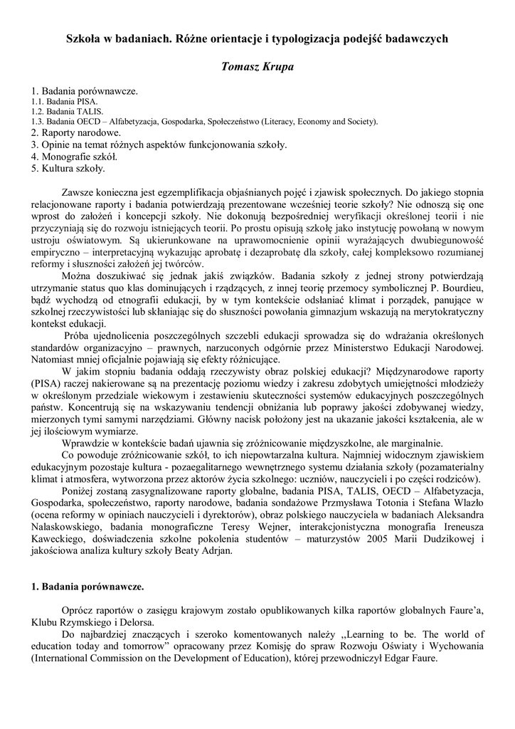 Szkoła w badaniach. Różne orientacje i typologizacja podejść badawczych Tomasz Krupa 1. Badania porównawcze. 1.1. Badania PISA. 1.2. Badania TALIS. 1.3. Badania OECD – Alfabetyzacja, Gospodarka, Społeczeństwo (Literacy, Economy and Society). 2. Raporty narodowe. 3. Opinie na temat różnych aspektów funkcjonowania szkoły. 4. Monografie szkół. 5. Kultura szkoły. Zawsze konieczna jest egzemplifikacja objaśnianych pojęć i zjawisk społecznych. Do jakiego stopnia relacjonowane raporty i badania potwierdzają prezentowane wcześniej teorie szkoły? Nie odnoszą się one wprost do założeń i koncepcji szkoły. Nie dokonują bezpośredniej weryfikacji określonej teorii i nie przyczyniają się do rozwoju istniejących teorii. Po prostu opisują szkołę jako instytucję powołaną w nowym ustroju oświatowym. Są ukierunkowane na uprawomocnienie opinii wyrażających dwubiegunowość empiryczno – interpretacyjną wykazując aprobatę i dezaprobatę dla szkoły, całej kompleksowo rozumianej reformy i słuszności założeń jej twórców. Można doszukiwać się jednak jakiś związków. Badania szkoły z jednej strony potwierdzają utrzymanie status quo klas dominujących i rządzących, z innej teorię przemocy symbolicznej P. Bourdieu, bądź wychodzą od etnografii edukacji, by w tym kontekście odsłaniać klimat i porządek, panujące w szkolnej rzeczywistości lub skłaniając się do słuszności powołania gimnazjum wskazują na merytokratyczny kontekst edukacji. Próba ujednolicenia poszczególnych szczebli edukacji sprowadza się do wdrażania określonych standardów organizacyjno – prawnych, narzuconych odgórnie przez Ministerstwo Edukacji Narodowej. Natomiast mniej oficjalnie pojawiają się efekty różnicujące. W jakim stopniu badania oddają rzeczywisty obraz polskiej edukacji? Międzynarodowe raporty (PISA) raczej nakierowane są na prezentację poziomu wiedzy i zakresu zdobytych umiejętności młodzieży w określonym przedziale wiekowym i zestawieniu skuteczności systemów edukacyjnych poszczególnych państw. Koncentrują się na wskazywaniu tendencji obniżania lub poprawy jakości zdobywanej wiedzy, mierzonych tymi samymi narzędziami. Główny nacisk położony jest na ukazanie jakości kształcenia, ale w jej ilościowym wymiarze. Wprawdzie w kontekście badań ujawnia się zróżnicowanie międzyszkolne, ale marginalnie. Co powoduje zróżnicowanie szkół, to ich niepowtarzalna kultura. Najmniej widocznym zjawiskiem edukacyjnym pozostaje kultura - pozaegalitarnego wewnętrznego systemu działania szkoły (pozamaterialny klimat i atmosfera, wytworzona przez aktorów życia szkolnego: uczniów, nauczycieli i po części rodziców). Poniżej zostaną zasygnalizowane raporty globalne, badania PISA, TALIS, OECD – Alfabetyzacja, Gospodarka, społeczeństwo, raporty narodowe, badania sondażowe Przmysława Totonia i Stefana Wlazło (ocena reformy w opiniach nauczycieli i dyrektorów), obraz polskiego nauczyciela w badaniach Aleksandra Nalaskowskiego, badania monograficzne Teresy Wejner, interakcjonistyczna monografia Ireneusza Kaweckiego, doświadczenia szkolne pokolenia studentów – maturzystów 2005 Marii Dudzikowej i jakościowa analiza kultury szkoły Beaty Adrjan. 1. Badania porównawcze. Oprócz raportów o zasięgu krajowym zostało opublikowanych kilka raportów globalnych Faure’a, Klubu Rzymskiego i Delorsa. Do najbardziej znaczących i szeroko komentowanych należy ,,Learning to be. The world of education today and tomorrow” opracowany przez Komisję do spraw Rozwoju Oświaty i Wychowania (International Commission on the Development of Education), której przewodniczył Edgar Faure. 1.1. Badania PISA. Skuteczność polskiej oświaty w sferze kompetencji uczniów na poziomie gimnazjum ma badać narzędzie stosowane w krajach członkowskich OECD - PISA. Jest to skrót nazwy Programu Międzynarodowej Oceny Umiejętności Uczniów (Programme for International Student Assessment). Jego celem jest uzyskanie porównywalnych danych o umiejętnościach uczniów, którzy ukończyli 15 rok życia w celu poprawy jakości nauczania i organizacji systemów edukacyjnych. Wyniki badań PISA mają odpowiadać na następujące pytania: W jakim stopniu młodzież jest przygotowana do podjęcia wyzwań przyszłości? Czy młodzi ludzie potrafią efektywnie analizować, rozumować i jasno przekazywać swoje myśli? Czy są przygotowani, by zachować zdolność uczenia się przez całe życie? Jak kształtować programy szkolne i systemy edukacji, by im w tym dopomóc? Jak zmniejszać różnice życiowych szans między młodymi ludźmi poprzez oświatę? Przedmiotem badania są umiejętności uczniów uporządkowane w trzech następujących dziedzinach: czytanie i rozumowanie w naukach humanistycznych (reading literacy), matematyka (mathematical literacy) oraz rozumowanie w naukach przyrodniczych (scientific literacy). Te trzy dziedziny uważa się za decydujące o możliwościach dalszego rozwoju, zarówno indywidualnego jak i społecznego i gospodarczego. Dotychczas odbyły się następujące edycje badania: PISA 2000 – czytanie i rozumowanie w naukach humanistycznych jako główna dziedzina, matematyka i rozumowanie w naukach przyrodniczych jako poboczne, PISA 2003 – matematyka jako główna dziedzina, pozostałe – poboczne. W 2003 roku badano dodatkowo umiejętność rozwiązywania problemów (problem solving). PISA 2006 – rozumowanie w naukach przyrodniczych jako główna dziedzina, pozostałe – poboczne, PISA 2009 - czytanie i rozumowanie w naukach humanistycznych jako główna dziedzina, pozostałe – poboczne. W 2000 roku badanie PISA objęło uczniów pierwszych klas szkół ponadpodstawowych: liceów (40,7%), techników i innych średnich szkół zawodowych (36,4%) oraz zasadniczych szkół zawodowych (22,9%). Średni wynik dla całej populacji polskich piętnastolatków wyniósł 479 punktów i był znacząco niższy od średnie