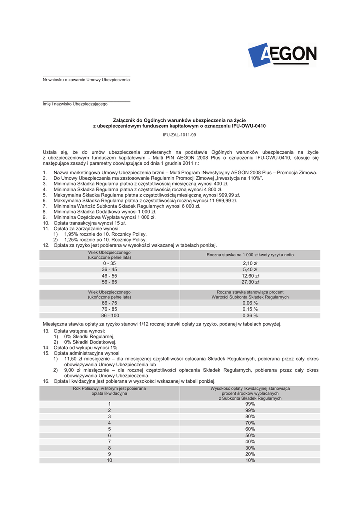 _____________________________________ Nr wniosku o zawarcie Umowy Ubezpieczenia _____________________________________ ImiĊ i nazwisko Ubezpieczającego Załącznik do Ogólnych warunków ubezpieczenia na Īycie z ubezpieczeniowym funduszem kapitałowym o oznaczeniu IFU-OWU-0410 IFU-ZAL-1011-99 Ustala siĊ, Īe do umów ubezpieczenia zawieranych na podstawie Ogólnych warunków ubezpieczenia na Īycie z ubezpieczeniowym funduszem kapitałowym - Multi PIN AEGON 2008 Plus o oznaczeniu IFU-OWU-0410, stosuje siĊ nastĊpujące zasady i parametry obowiązujące od dnia 1 grudnia 2011 r.: 1. 2. 3. 4. 5. 6. 7. 8. 9. 10. 11. Nazwa marketingowa Umowy Ubezpieczenia brzmi – Multi Program INwestycyjny AEGON 2008 Plus – Promocja Zimowa. Do Umowy Ubezpieczenia ma zastosowanie Regulamin Promocji Zimowej „Inwestycja na 110%”. Minimalna Składka Regularna płatna z czĊstotliwoĞcią miesiĊczną wynosi 400 zł. Minimalna Składka Regularna płatna z czĊstotliwoĞcią roczną wynosi 4 800 zł. Maksymalna Składka Regularna płatna z czĊstotliwoĞcią miesiĊczną wynosi 999,99 zł. Maksymalna Składka Regularna płatna z czĊstotliwoĞcią roczną wynosi 11 999,99 zł. Minimalna WartoĞü Subkonta Składek Regularnych wynosi 6 000 zł. Minimalna Składka Dodatkowa wynosi 1 000 zł. Minimalna CzĊĞciowa Wypłata wynosi 1 000 zł. Opłata transakcyjna wynosi 15 zł. Opłata za zarządzanie wynosi: 1) 1,95% rocznie do 10. Rocznicy Polisy, 2) 1,25% rocznie po 10. Rocznicy Polisy. 12. Opłata za ryzyko jest pobierana w wysokoĞci wskazanej w tabelach poniĪej. Wiek Ubezpieczonego (ukoĔczone pełne lata) Roczna stawka na 1 000 zł kwoty ryzyka netto 0 - 35 36 - 45 46 - 55 56 - 65 2,10 zł 5,40 zł 12,60 zł 27,30 zł Wiek Ubezpieczonego (ukoĔczone pełne lata) Roczna stawka stanowiąca procent WartoĞci Subkonta Składek Regularnych 66 - 75 76 - 85 86 - 100 0,06 % 0,15 % 0,36 % MiesiĊczna stawka opłaty za ryzyko stanowi 1/12 rocznej stawki opłaty za ryzyko, podanej w tabelach powyĪej. 13. Opłata wstĊpna wynosi: 1) 0% Składki Regularnej, 2) 0% Składki Dodatkowej. 14. Opłata od wykupu wynosi 1%. 15. Opłata administracyjna wynosi 1) 11,50 zł miesiĊcznie – dla miesiĊcznej czĊstotliwoĞci opłacania Składek Regularnych, pobierana przez cały okres obowiązywania Umowy Ubezpieczenia lub 2) 9,00 zł miesiĊcznie – dla rocznej czĊstotliwoĞci opłacania Składek Regularnych, pobierana przez cały okres obowiązywania Umowy Ubezpieczenia. 16. Opłata likwidacyjna jest pobierana w wysokoĞci wskazanej w tabeli poniĪej. Rok Polisowy, w którym jest pobierana opłata likwidacyjna WysokoĞü opłaty likwidacyjnej stanowiąca procent Ğrodków wypłacanych z Subkonta Składek Regularnych 1 2 3 4 5 6 7 8 9 10 99% 99% 80% 70% 60% 50% 40% 30% 20% 10% 17. Opłata za cesjĊ wynosi 0,00 zł. 18. Opłata za obniĪenie Składki Regularnej wynosi 0,00 zł. 19. W kaĪdym Roku Polisowym bezpłatnych jest 12 zleceĔ Transferu, w tym 4 zlecenia Transferu złoĪone na formularzu przygotowanym przez Towarzystwo. 20. W kaĪdym Roku Polisowym bezpłatnych jest 12 zleceĔ zmiany Alokacji Składki, w tym 4 zlecenia zmiany Alokacji Składki złoĪone na formularzu przygotowanym przez Towarzystwo. 21. W kaĪdym Roku Polisowym bezpłatna jest 1 pisemna informacja potwierdzająca WartoĞü Rachunku Ubezpieczenia. 22. W kaĪdym Roku Polisowym są dopuszczalne 2 CzĊĞciowe Wypłaty, łącznie z obu Subkont. 23. Termin zapłaty Składki Regularnej przypada na: 1) DatĊ MiesiĊcznicy – jeĪeli Składka Regularna jest opłacana z czĊstotliwoĞcią miesiĊczną; 2) RocznicĊ Polisy – jeĪeli Składka Regularna jest opłacana z czĊstotliwoĞcią roczną. 24. Opłata za przewalutowanie jest pobierana w wysokoĞci wskazanej poniĪej. Waluta, z której nastĊpuje przewalutowanie Waluta, na którą jest dokonywane przewalutowanie Stawka opłaty za przewalutowanie od jednostki monetarnej waluty, z której nastĊpuje przewalutowanie PLN USD 0,0015 zł PLN EUR 0,0015 zł PLN CHF 0,0015 zł W przypadku przewalutowania waluty obcej na inną walutĊ obcą oraz waluty obcej na złote, stawka opłaty za przewalutowanie od jednostki monetarnej waluty, z której nastĊpuje przewalutowanie wynosi 0,005 zł. 25. Opłata za wznowienie Umowy Ubezpieczenia wynosi 200,00 zł. 26. Ustala siĊ, Īe Ğrodki pochodzące ze Składek zapłaconych w wykonaniu Umów Ubezpieczenia zawieranych na podstawie Ogólnych Warunków Ubezpieczenia mogą byü inwestowane w nastĊpujące ubezpieczeniowe fundusze kapitałowe: FUNDUSZE NOMINOWANE W PLN Idea Premium • UniWIBID • BPH Obligacji 1 • Idea Obligacji • BPH Stabilnego Wzrostu • Idea Stabilnego Wzrostu • Legg Mason Senior • Arka BZ WBK ZrównowaĪony • BPH Aktywnego Zarządzania • Noble Mieszany • UniKorona ZrównowaĪony • Arka BZ WBK Akcji • Legg Mason Akcji • Noble Akcji • Skarbiec - Akcja • UniKorona Akcje • Arka BZ WBK Akcji ĝrodkowej i Wschodniej Europy • Investor Ameryka ŁaciĔska • Investor BRIC • Investor Indie i Chiny • Noble Africa • Investor Gold Otwarty • Noble Timingowy • AEGON Alfa • AEGON Bessa • Noble Global Return FUNDUSZE NOMINOWANE W EUR UFK - JPMorgan Series II (EUR) • UFK - Templeton Global Total Return (EUR) • UFK - Templeton Global Income (EUR) • UFK - AEGON Central European Equity (EUR) • UFK - BlackRock Continental European Flexible (EUR) • UFK - BlackRock US Small & MidCap Opportunities (EUR) • UFK - BlackRock Latin American (EUR) • UFK - Templeton Asian Growth (EUR) • UFK - BlackRock Emerging Markets (EUR) • UFK - AEGON Climate Change (EUR) • UFK - BlackRock World Gold (EUR) • UFK - BlackRock World Mining (EUR) FUNDUSZE NOMINOWANE W USD UFK - JPMorgan Series II (USD) • UFK - Templeton Global Bond (USD) • UFK - Templeton Emerging Markets Bond (USD) • UFK - Templeton Global Income (USD) • UFK - BlackRock US Small & MidCap Opportunities (USD) • UFK - HSBC Chinese Equity (USD) • UFK - HSB