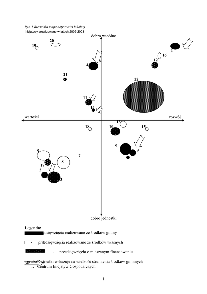 Rys. 1 Bieruńska mapa aktywności lokalnej Inicjatywy zrealizowane w latach 2002-2003 dobro wspólne 20 19 1 16 12 4 21 22 11 14 wartości rozwój 13 18 10 15 5 9 6 7 89 17 2 3 dobro jednostki Legenda: - przedsięwzięcia realizowane ze środków gminy - przedsięwzięcia realizowane ze środków własnych - przedsięwzięcia o mieszanym finansowaniu - grubość strzałki wskazuje na wielkość strumienia środków gminnych 1. Centrum Inicjatyw Gospodarczych 1 2. świetlica terapeutyczna 3. rehabilitacja niepełnosprawnych 4. akcje gaśnicze 5. organizacja zajęć i treningów sportowych dla dzieci i młodzieży 6. organizacja rozgrywek i zawodów sportowych 7. sport niepełnosprawnych 8. poszerzanie oferty opieki zdrowotnej dla członków 9. działalność charytatywna 10. festyny, imprezy 11. ochrona dziedzictwa narodowego i tradycji 12. inicjatywy proeuropejskie 13. inicjatywy kulturalne, artystyczne 14. obchody rocznicowe 15. inicjatywy edukacyjne 16. konflikty wokół inwestycji 17. pomoc i samopomoc społeczna 18. wspieranie bezrobotnych 19. ochrona praw człowieka 20. rozwój demokracji, kontrola funkcjonowania samorządu 21. ochrona środowiska 22. udział w wyborach i zaangażowanie w lokalną politykę Rys. 2 Cieszyńska mapa aktywności lokalnej 2 Inicjatywy zrealizowane w latach 2000-2003 dobro wspólne 20 12 22 19 17 13 23 1 5 27 21 5 14 16 wartości rozwój 10 18 11 4 9 2 4 7 25 2 6 2 3 1 8 6 dobro jednostki Legenda: - imprezy zorganizowane ze środków gminy - imprezy zorganizowane ze środków własnych - grubość strzałki wskazuje na wielkość strumienia środków gminnych (8/463) – ilość inicjatyw lub instytucji/wartość środków z budżetu gminy w tysiącach złotych 1. organizacja zajęć i treningów sportowych dla dzieci i młodzieży (8/463) 3 2. organizacja rozgrywek i zawodów sportowych (81/205) 3. inne inicjatywy sportowe (5/707) 4. wydarzenia artystyczne: festiwale, wystawy, koncerty, publikacje (61/457) 5. ochrona dziedzictwa narodowego i tradycji (17/60) 6. instytucje świadczące usługi socjalne (13/1462) 7. rehabilitacja niepełnosprawnych (17/110) 8. rehabilitacja niepełnosprawnych 9. turystyka (17/61) 10. charytatywne (9/37) 11. charytatywne 12. marsze antywojenne 13. rozwój lokalny, współpraca transgraniczna 14. działalność szkoleniowa (18/45) 15. rozbudowa szpitala 16. inicjatywy edukacyjne (17/56) 17. integracja europejska (3/15) 18. szkoły prywatne 19. konflikty wokół inwestycji 20. lokalne inicjatywy inwestycyjne 21. ochrona dziedzictwa narodowego i tradycji 22. integracja europejska 23. promocja gminy 24. rzecznictwo interesów własnych członków 25. sport niepełnosprawnych 26. inicjatywy kulturalne, artystyczne 27. udział w wyborach samorządowych Rys. 3 Kobiórska mapa aktywności lokalnej Inicjatywy zrealizowane w latach 2002-2003 4 dobro wspólne 6 12 11 13 5 15 1 9 wartości rozwój 14 7 8 3 4 10 2 dobro jednostki Legenda: - przedsięwzięcia realizowane ze środków gminy - przedsięwzięcia realizowane ze środków własnych - przedsięwzięcia o mieszanym finansowaniu - grubość strzałki wskazuje na wielkość strumienia środków gminnych 1. muzeum „Smolarnia” 2. Klub Pomocy Koleżeńskiej „Praca” 5 3. organizacja zajęć i treningów sportowych dla dzieci i młodzieży 4. organizacja rozgrywek i zawodów sportowych 5. akcje gaśnicze 6. monitorowanie funkcjonowania samorządu 7. festyny, imprezy 8. inicjatywy edukacyjne 9. obchody rocznicowe 10. działalność charytatywna 11. spotkanie dyskusyjne na temat członkostwa Polski w UE 12. akcja na rzecz narodowości śląskiej w spisie powszechnym 13. inicjatywy odwodnieniowe 14. inicjatywy kulturalne, artystyczne 15. zaangażowanie w wyborach samorządowych Rys. 4 Tyska mapa aktywności lokalnej 6 Inicjatywy zrealizowane w latach 2002-2003 dobro wspólne 19 20 33 17 23 22 34 24 25 26 28 35 27 29 30 36 18 31 wartości 32 rozwój 8 9 14 10 12 13 3 4 16 7 15 2 21 5 6 11 1 dobro jednostki Legenda: - przedsięwzięcia realizowane ze środków gminy - przedsięwzięcia realizowane ze środków własnych - przedsięwzięcia o mieszanym finansowaniu grubość strzałki wskazuje na wielkość strumienia środków gminnych 1. działalność charytatywna, zbiórki pieniędzy, darów (także adresowana poza społeczność lokalną, np. pomoc ofiarom powodzi, trzęsienia)ziemi w Indiach itd. 7 2. prowadzenie instytucji opiekuńczych i ochrony zdrowia 3. świadczenie bezpośredniej pomocy ubogim (np. ciepły posiłek) 4. imprezy artystyczno-charytatywno-pomocowe (dla seniorów, dzieci ze świetlic terapeutycznych) 5. realizacja konkretnych programów z zakresu pomocy społecznej „Starszy Brat, Starsza Siostra” 6. rehabilitacja ruchowa, integracja społeczna osób z dysfunkcją (niepełnosprawnych) 7. profilaktyka i przeciwdziałanie uzależnieniom 8. rzecznictwo interesów, pomoc prawa 9. problemy mieszkaniowe 10. problemy bezrobotnych 11. dostarczanie Internetu 12. imprezy i rozgrywki sportowe 13. szkolenia i treningi dla dzieci i młodzieży 14. działania artystyczne (spektakle, wystawy, teatr) 15. konflikt kupców z prywatnym właścicielem terenu 16. szkolenia podnoszące kwalifikacje i umiejętności zawodowe 17. ochrona przyrody 18. ochrona dziedzictwa narodowego 19. prawa i opieka nad zwierzętami 20. Sprzątanie Świata 21. imprezy rekreacyjne 22. utworzenie funduszu poręczeń kredytowych 23. zrównoważony rozwój, termomodernizacja, ograniczanie niskiej emisji 24. lokalne inicjatywy inwestycyjne 25. protesty mieszkańców przeciwko różnym uciążliwościom (ruch drogowy, wysypisko śmieci) 26. dostarczanie wiedzy i umiejętności (np. z zakresu dostępu do informacji) 27. konflikt z władzami miasta wokół likwidacji linii trolejbusowych 28. rozwój, modernizacja dzielnicy 29. wystąpienie w sprawie zagospodarowania terenu (problem wykopu kolejowego) 30. protesty kupców przeciwko planom budowy nowym hipermarketów 31. imprezy okolicznościowe 32. akcj