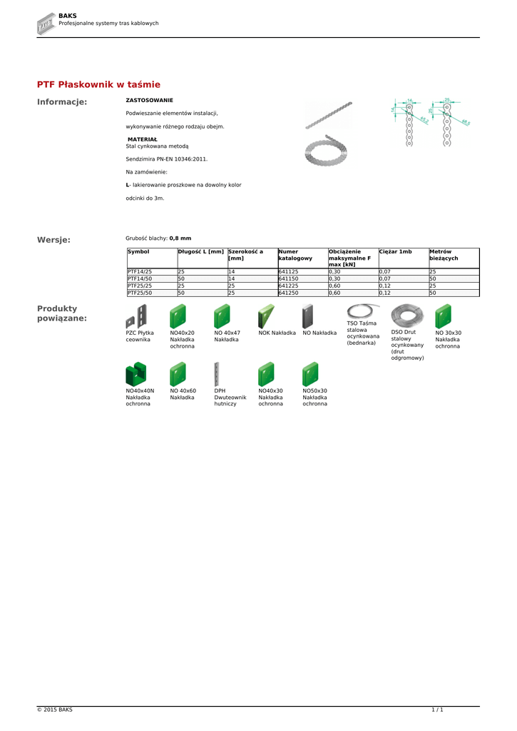 BAKS Profesjonalne systemy tras kablowych PTF Płaskownik w taśmie Informacje: ZASTOSOWANIE Podwieszanie elementów instalacji, wykonywanie różnego rodzaju obejm. MATERIAŁ Stal cynkowana metodą Sendzimira PN-EN 10346:2011. Na zamówienie: L- lakierowanie proszkowe na dowolny kolor odcinki do 3m. Wersje: Grubość blachy: 0,8 mm Symbol Długość L [mm] Szerokość a [mm] Numer katalogowy PTF14/25 PTF14/50 PTF25/25 PTF25/50 25 50 25 50 641125 641150 641225 641250 PZC Płytka ceownika NO40x20 Nakładka ochronna NO 40x47 Nakładka NOK Nakładka NO Nakładka NO40x40N Nakładka ochronna NO 40x60 Nakładka DPH Dwuteownik hutniczy NO40x30 Nakładka ochronna NO50x30 Nakładka ochronna 14 14 25 25 Obciążenie maksymalne F max [kN] 0,30 0,30 0,60 0,60 Ciężar 1mb Metrów bieżących 0,07 0,07 0,12 0,12 25 50 25 50 Produkty powiązane: TSO Taśma stalowa ocynkowana (bednarka) DSO Drut stalowy ocynkowany (drut odgromowy) NO 30x30 Nakładka ochronna © 2015 BAKS 1/1