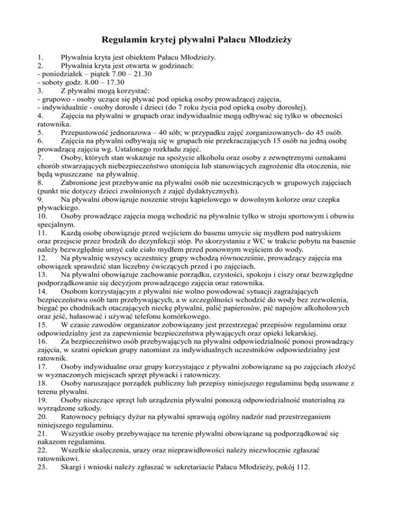 Regulamin krytej pływalni Pałacu Młodzieży 1. Pływalnia kryta jest obiektem Pałacu Młodzieży. 2. Pływalnia kryta jest otwarta w godzinach: - poniedziałek – piątek 7.00 – 21.30 - soboty godz. 8.00 – 17.30 3. Z pływalni mogą korzystać: - grupowo - osoby uczące się pływać pod opieką osoby prowadzącej zajęcia, - indywidualnie - osoby dorosłe i dzieci (do 7 roku życia pod opieką osoby dorosłej). 4. Zajęcia na pływalni w grupach oraz indywidualnie mogą odbywać się tylko w obecności ratownika. 5. Przepustowość jednorazowa – 40 sób; w przypadku zajęć zorganizowanych- do 45 osób. 6. Zajęcia na pływalni odbywają się w grupach nie przekraczających 15 osób na jedną osobę prowadzącą zajęcia wg. Ustalonego rozkładu zajęć. 7. Osoby, których stan wskazuje na spożycie alkoholu oraz osoby z zewnętrznymi oznakami chorób stwarzających niebezpieczeństwo utonięcia lub stanowiących zagrożenie dla otoczenia, nie będą wpuszczane na pływalnię. 8. Zabronione jest przebywanie na pływalni osób nie uczestniczących w grupowych zajęciach (punkt nie dotyczy dzieci zwolnionych z zajęć dydaktycznych). 9. Na pływalni obowiązuje noszenie stroju kąpielowego w dowolnym kolorze oraz czepka pływackiego. 10. Osoby prowadzące zajęcia mogą wchodzić na pływalnie tylko w stroju sportowym i obuwiu specjalnym. 11. Kazdą osobę obowiązuje przed wejściem do basenu umycie się mydłem pod natryskiem oraz przejscie przez brodzik do dezynfekcji stóp. Po skorzystaniu z WC w trakcie pobytu na basenie należy bezwzględnie umyć całe ciało mydłem przed ponownym wejściem do wody. 12. Na pływalnię wszyscy uczestnicy grupy wchodzą równocześnie, prowadzący zajęcia ma obowiązek sprawdzić stan liczebny ćwiczących przed i po zajęciach. 13. Na pływalni obowiązuje zachowanie porządku, czystości, spokoju i ciszy oraz bezwzględne podporządkowanie się decyzjom prowadzącego zajęcia oraz ratownika. 14. Osobom korzystającym z pływalni nie wolno powodować sytuacji zagrażających bezpieczeństwu osób tam przebywających, a w szczególności wchodzić do wody bez zezwolenia, biegać po chodnikach otaczających nieckę pływalni, palić papierosów, pić napojów alkoholowych oraz jeść, hałasować i używać telefonu komórkowego. 15. W czasie zawodów organizator zobowiązany jest przestrzegać przepisów regulaminu oraz odpowiedzialny jest za zapewnienie bezpieczeństwa pływających oraz opieki lekarskiej. 16. Za bezpieczeńśtwo osób przebywających na pływalni odpowiedzialność ponosi prowadzący zajęcia, w szatni opiekun grupy natomiast za indywidualnych uczestników odpowiedzialny jest ratownik. 17. Osoby indywidualne oraz grupy korzystające z pływalni zobowiązane są po zajęciach złożyć w wyznaczonych miejscach sprzęt pływacki i ratowniczy. 18. Osoby naruszające porządek publiczny lub przepisy niniejszego regulaminu będą usuwane z terenu pływalni. 19. Osoby niszczące sprzęt lub urządzenia pływalni ponoszą odpowiedzialność materialną za wyrządzone szkody. 20. Ratownocy pełniący dyżur na pływalni sprawują ogólny nadzór nad przestrzeganiem niniejszego regulaminu. 21. Wszystkie osoby przebywające na terenie pływalni obowiązane są podporządkować się nakazom regulaminu. 22. Wszelkie skaleczenia, urazy oraz nieprawidłowości należy niezwłocznie zgłaszać ratownikowi. 23. Skargi i wnioski należy zgłaszać w sekretariacie Pałacu Młodzieży, pokój 112.