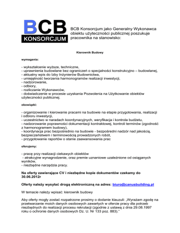 BCB Konsorcjum jako Generalny Wykonawca obiektu użyteczności publicznej poszukuje pracownika na stanowisko: Kierownik Budowy wymagania: - wykształcenie wyższe, techniczne, - uprawnienia budowlane bez ograniczeń o specjalności konstrukcyjno – budowlanej, - aktualny wpis do Izby Inżynierów Budownictwa, - umiejętność tworzenia harmonogramów realizacji inwestycji, - nadzorowanie, - odbiory, - rozliczanie Wykonawców, - doświadczenie w procesie uzyskania Pozwolenia na Użytkowanie obiektów użyteczności publicznej. obowiązki: - organizowanie i kierowanie pracami na budowie na etapie przygotowania, realizacji i odbioru inwestycji, - uczestnictwo w naradach koordynacyjnych, weryfikacja i kontrola budżetu, - nadzorowanie poprawności dokumentacji kontraktowej, kontroli terminów (zgodność z harmonogramem budowy), - koordynacja prac bezpośrednio na budowie - bezpośredni nadzór nad jakością, bezpieczeństwem i terminowością prowadzonych robót, - przygotowanie raportów o stanie zaawansowania prac oferujemy: - pracę przy realizacji ciekawych obiektów - atrakcyjne wynagrodzenie, oraz premie uznaniowe uzależnione od osiąganych wyników, - niezbędne narzędzia pracy. Na oferty zawierające CV i niezbędne kopie dokumentów czekamy do 30.06.2012r Oferty należy wysyłać drogą elektroniczną na adres: [email protected] W temacie należy wpisać: kierownik budowy Aby oferty mogły zostać rozpatrzone prosimy o dodanie klauzuli: „Wyrażam zgodę na przetwarzanie moich danych osobowych zawartych w ofercie pracy dla potrzeb niezbędnych do realizacji procesu rekrutacji (zgodnie z ustawą z dnia 29.08.1997 roku o ochronie danych osobowych Dz. U. Nr 133 poz. 883).”