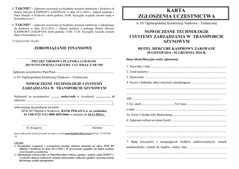 8. TAK/NIE* - Zgłaszam rezerwację na bezpłatny przejazd autobusem z Krakowa do Hotelu Mercure KASPROWY ZAKOPANE w dniu 30.11.2016 r. Odjazd autokaru z Placu Matejki w Krakowie około godziny 10.00. Szczegóły wyjazdu zawarte będą w komunikacie nr 2. 9. TAK/NIE* - Zgłaszam rezerwację na bezpłatny przejazd autobusem z Zakopanego do Krakowa w dniu 02.12.2016 r. Odjazd autokaru z parkingu Hotelu Mercure KASPROWY ZAKOPANE około godziny 13.00- 13.30. Szczegóły wyjazdu zawarte będą w komunikacie nr 2. *) niepotrzebne skreślić ZOBOWIĄZANIE FINANSOWE KARTA ZGŁOSZENIA UCZESTNICTWA w XV Ogólnopolskiej Konferencji Naukowo - Technicznej NOWOCZESNE TECHNOLOGIE I SYSTEMY ZARZĄDZANIA W TRANSPORCIE SZYNOWYM HOTEL MERCURE KASPROWY ZAKOPANE 30 LISTOPADA - 02 GRUDNIA 2016 R. ...................................................................................................................................... PIECZĘĆ FIRMOWA PŁATNIKA LUB DANE DO WYSTAWIENIA FAKTURY VAT WRAZ Z NR NIP Dane identyfikacyjne osoby zgłoszonej: 1. Nazwisko i imię ................................................................................................. Zgłaszam uczestnictwo Pani/Pana .......................................................................... 2. Tytuł naukowy ................................................................................................... w XV Ogólnopolskiej Konferencji Naukowo - Technicznej: 3. Stanowisko ........................................................................................................ NOWOCZESNE TECHNOLOGIE I SYSTEMY ZARZĄDZANIA W TRANSPORCIE SZYNOWYM Należność za uczestnictwo ........... osoby/osób w wysokości ................... zł (słownie:................................................................................................................. ..............................................................................................................................) zobowiązuję się przekazać na konto: SITK RP Oddział w Krakowie, BANK PEKAO S.A. nr rachunku: 43 1240 4722 1111 0000 4859 0666 w terminie do 10.11.2016 r. 4. Nazwa i dokładny adres instytucji zatrudniającej ............................................. ................................................................................................................................ ................................................................................................................................ NIP .................................................................................................................... 5.Tel. służb ..........................................Tel. kom.................................................... e-mail ..................................................................................................................... Nr. Ewid. Członka Izby Budowlanej...................................................................... 6. Zgłaszam referat na temat (tytuł) ...................................................................... ................................... Gł. Księgowy ............................................. Dyrektor Kartę zgłoszenia należy przesłać na adres e-mail [email protected] lub fax 12 659 0076. UWAGI: 1. Ewentualnej rezygnacji z uczestnictwa prosimy dokonać pisemnie na adres SITK RP Oddział w Krakowie do dnia 20.11.2016 r. W przeciwnym wypadku, nie będzie możliwy zwrot kosztów uczestnictwa. 2. Informujemy równocześnie, że Pana/Pani dane osobowe zgodnie z ustawą z dnia 29.08.97 r. o ochronie danych osobowych zostaną wykorzystane wyłącznie zgodnie z przeznaczeniem, dla którego zostały udostępnione. ................................................................................................................................ ................................................................................................................................ ................................................................................................................................ 7. Będę korzystał/a z następujących środków audiowizualnych: rzutnik multimedialny, rzutnik do slajdów, wideo, inne ……………………………….. …………………………............................................................................................. .............................................................................................................................................