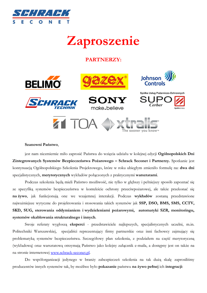 Zaproszenie PARTNERZY: Szanowni Państwo, jest nam niezmiernie miło zaprosić Państwa do wzięcia udziału w kolejnej edycji Ogólnopolskich Dni Zintegrowanych Systemów Bezpieczeństwa Pożarowego – Schrack Seconet i Partnerzy. Spotkanie jest kontynuacją Ogólnopolskiego Szkolenia Projektowego, które w roku ubiegłym zmieniło formułę na: dwa dni specjalistycznych, merytorycznych wykładów połączonych z praktycznymi warsztatami. Podczas szkolenia będą mieli Państwo możliwość, nie tylko w głębszy i pełniejszy sposób zapoznać się ze specyfiką systemów bezpieczeństwa w kontekście ochrony przeciwpożarowej, ale także przekonać się na żywo, jak funkcjonują one we wzajemnej interakcji. Podczas wykładów zostaną przedstawione najważniejsze wytyczne do projektowania i stosowania takich systemów jak SSP, DSO, BMS, SMS, CCTV, SKD, SUG, sterowania oddymianiem i wydzieleniami pożarowymi, automatyki SZR, monitoringu, systemów okablowania strukturalnego i innych. Swoje referaty wygłoszą eksperci - przedstawiciele najlepszych, specjalistycznych uczelni, m.in. Politechniki Warszawskiej, specjaliści reprezentujący firmy partnerskie oraz inni fachowcy zajmujący się problematyką systemów bezpieczeństwa. Szczegółowy plan szkolenia, z podziałem na część merytoryczną (wykładową) oraz warsztatową otrzymają Państwo jako kolejny załącznik e-maila, a dostępny jest on także na na stronie internetowej www.schrack-seconet.pl. Do współorganizacji jedynego w branży zabezpieczeń szkolenia na tak dużą skalę zaprosiliśmy producentów innych systemów tak, by możliwe było pokazanie państwu na żywo pełnej ich integracji: BELIMO – lider w produkcji napędów klap pożarowych oraz siłowników i zaworów przeznaczonych do instalacji HVAC; GAZEX – firma zajmująca się konstruowaniem, produkcją oraz propagowaniem stosowania elektronicznych urządzeń do wykrywania i pomiaru stężeń gazów toksycznych i wybuchowych; Johnson Controls International – czołowy dostawca produktów, usług oraz rozwiązań w zakresie systemów HVAC (chłodnictwa, wentylacji, klimatyzacji i ogrzewania), jak również Systemów Automatyki Budynkowej i BMS; Schrack Technik Polska Sp. z o. o. - wiodący dostawca produktów i rozwiązań w zakresie rozdziału energii elektrycznej oraz transmisji danych teletechnicznych; Sony Europe Limited - producent innowacyjnego sprzętu audio, wideo, telekomunikacyjnego i informatycznego, CCTV i Display; Supo Cerber Sp. z o. o. - dostawca innowacyjnych systemów gaszenia mgłą wodną, szczególnie obiektów zabytkowych (drewnianych ) oraz przemysłowych; TOA Electronics Europe GmbH - lider na rynku systemów nagłośnieniowych, komunikacyjnych i bezpieczeństwa (DSO); XTRALIS (UK) Ltd.- wiodący dostawca zaawansowanych rozwiązań z zakresu wczesnego wykrywania pożaru, gazu i zagrożenia bezpieczeństwa. Schrack Seconet Polska i Partnerzy tegorocznego szkolenia poprowadzą zajęcia praktyczne, obejmujące najważniejsze zagadnienia związane z wytycznymi i wymaganiami w zakresie projektowania, konfiguracji, montażu i instalacji, aż po programowanie systemów bezpieczeństwa. Najważniejszym punktem imprezy będzie prezentacja „na żywo” procedury zadziałania wszystkich zintegrowanych systemów bezpieczeństwa podczas pożaru. Udział w dwudniowych warsztatach zostanie potwierdzony wspólnym certyfikatem, wystawionym przez Schrack Seconet Polska oraz wszystkich Partnerów spotkania. Otrzymanie dokumentu z kompletem podpisów wszystkich producentów uzależnione będzie od udziału uczestnika w poszczególnych sesjach szkolenia. Spotkanie odbędzie się w dniach: 10 -11 października 2013 w Windsor Palace Hotel & Conference Center, Jachranka 75 nad Zalewem Zegrzyńskim k/Warszawy 05-140 Serock Początek spotkania o godzinie 09:30 (10.10.2013) Zakończenie szkolenia przewidujemy około godziny 17:00 (11.10.2013) Udział w dwudniowym szkoleniu jest bezpłatny, jednak z uwagi na konieczność zagwarantowania miejsc noclegowych uczestnicy ponoszą symboliczne koszty w wysokości 150,00 zł (stu pięćdziesięciu złotych) za nocleg w pokoju dwuosobowym. Płatność na miejscu w recepcji hotelu Windsor w dniu wymeldowania. Prosimy o dokładne wypełnienie formularza rejestracyjnego (link w treści e-maila) najpóźniej do dnia: 27 września 2013 Ilość miejsc na szkoleniu, jak i ilość miejsc noclegowych ograniczona! O zamknięciu listy będą Państwo informowani na bieżąco po wypełnieniu formularza. Tylko na podstawie czytelnego i kompletnego formularza rejestracyjnego, odesłanego do Schrack Seconet, będą przyjmowane zgłoszenia uczestnictwa. W imieniu Schrack Seconet Polska oraz Partnerów, gorąco zapraszam, Grzegorz Ćwiek Prezes Zarządu Schrack Seconet Polska Sp. z o. o. PATRONI MEDIALNI: