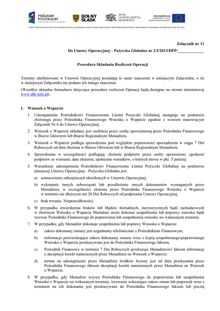 Załącznik nr 11 Do Umowy Operacyjnej – Pożyczka Globalna nr 2.5/201 /2013/DFP/_____________ Procedura Składania Rozliczeń Rozlicze Operacji Terminy zdefiniowane w Umowie Operacyjnej posiadają posiadaj to samo znaczenie w niniejszym Załączniku, o ile w niniejszym Załączniku czniku nie podano ich innego znaczenia. (Wszelkie Wszelkie aktualne formularze dotyczące dotyczą procedury rozliczeń Operacji będą ę ą dostępne na stronie internetowej www.dfp.info.pl). I. Wniosek o Wsparcie 1. Udostępnienie Pośrednikowi średnikowi Finansowemu Limitu Pożyczki Po yczki Globalnej następuje nast na podstawie złożonego przez Pośrednika średnika rednika Finansowego Wniosku o Wsparcie zgodnie z wzorem stanowiącym Załącznik Nrr 6 do Umowy Operacyjnej. 2. Wniosek o Wsparcie składany jest osobiście przez osobę upoważnionąą przez Pośrednika Po Finansowego w Biurze Głównym lub Biurze Regionalnym Menadżera. 3. Wniosek o Wsparcie podlega sprawdzeniu pod względem wzgl poprawności ści sporządzenia sporz w ciągu 7 Dni Roboczych od dnia złożenia żenia w Biurze Głównym lub w Biurze Regionalnym Menadżera. Menad 4. Sprawdzeniu w szczególności szczególnoś podlegają: złożenie enie podpisów przez osoby uprawnione; zgodność zgodno podpisów ze wzorami; data złożenia; zło enia; spełnienie warunków, o których mowa w pkt. 5 poniżej. 5. Warunkiem udostępnienia ępnienia Po Pośrednikowi Finansowemu Limitu Pożyczki życzki Globalnej na podstawie niniejszej Umowy Operacyjnej - Pożyczka Globalna jest: a) ustanowienie zabezpieczeń określonych w Umowie Operacyjnej, b) wykonanie innych zobowiązań zobowi lub przedłożenie enie innych dokumentów wymaganych przez Menadżera, era, w szczególno szczególności złożenie przez Pośrednika rednika Finansowego Wniosku o Wsparcie w terminie nie dłuższym ższym ni niż 20 Dni Roboczych od podpisania Umowy Operacyjnej, Operacyjnej c) brak trwania Nieprawidłowości. Nieprawidłowo 6. W przypadku stwierdzenia braków lub błędów bł dów formalnych, merytorycznych bądź b rachunkowych w złożonym onym Wniosku o Wsparcie Menadżer Menad może dokonać uzupełnienia lub poprawy wniosku bbądź wezwać Pośrednika rednika Finansowego do poprawienia lub uzupełnienia wniosku we wskazanym terminie. 7. W przypadku, gdy Menadżer żer er dokonuje uzupełnienia lub poprawy Wniosku o Wsparcie: a) zakres dokonanej zmiany jest uzgadniany telefonicznie z Pośrednikiem Po rednikiem Finansowym, b) informacja potwierdzająca potwierdzają zakres dokonanej zmiany wraz z kopiąą uzupełnionego/poprawionego Wniosku o Wsparcie przekazywana jest do Pośrednika Po rednika Finansowego faksem, c) Pośrednik rednik Finansowy w terminie 7 Dni Roboczych przekazuje Menadżerowi Menadż faksem informację o akceptacji korekt naniesionych przez Menadżera M era na Wniosek o Wsparcie; d) termin na udostępnienie ępnienie przez Menadżera środków rodków liczony jest od dnia przekazania przez Pośrednika rednika Finansowego faksem akceptacji korekt naniesionych przez Menadżera Menad na Wniosek o Wsparcie. Menadż wzywa Pośrednika rednika Finansowego do poprawienia lub uzupełnienia 8. W przypadku, gdy Menadżer Wniosku o Wsparcie we wskazanym terminie, wezwanie wskazujące wskazuj ce zakres zmian lub poprawek wraz z terminem na ich dokonanie jest przekazywane do Pośrednika Po rednika Finansowego faks faksem lub pocztą elektroniczną. Termin na dokonanie przez Menadżera udostępnienia środków liczony jest od dnia złożenia przez Pośrednika Finansowego poprawionego lub uzupełnionego Wniosku o Wsparcie. 9. Przez udostępnienie środków przez Menadżera należy rozumieć wyodrębnienie środków, w wysokości zgodnej z kwotą wskazaną we Wniosku o Wsparcie, na Rachunku Bankowym Funduszu Powierniczego, z przeznaczeniem na wypłatę Transz Pożyczki Globalnej w wyniku zobowiązania Menadżera wynikającego z Umowy. 10. Menadżer wyodrębnia środki na Rachunku Bankowym Funduszu Powierniczego najpóźniej w terminie 7 Dni Roboczych od dnia złożenia Wniosku o Wsparcie, z zastrzeżeniem pkt 6, 7 i 8 powyżej II. Wypłata Transzy Pożyczki Globalnej 1. Wypłata Transzy Pożyczki Globalnej dokonywana jest na podstawie złożonego przez Pośrednika Finansowego Wniosku o Wypłatę Transzy zgodnie ze wzorem stanowiącym załącznik nr 7 do Umowy Operacyjnej. 2. Pierwszy Wniosek o Wypłatę Transzy musi być złożony w terminie 20 Dni Roboczych od zaakceptowania przez Menadżera Wniosku o Wsparcie. 3. Wniosek o Wypłatę Transzy składany jest osobiście w Biurze Głównym lub Biurze Regionalnym Menadżera albo pocztą ze zwrotnym potwierdzeniem odbioru bądź przesyłką kurierską (decyduje data wpływu do Biura Menadżera). 4. Wniosek o Wypłatę Transzy podlega sprawdzeniu przez Menadżera pod względem poprawności sporządzenia w ciągu 5 Dni Roboczych od dnia złożenia w Biurze Głównym lub Biurze Regionalnym Menadżera. 5. Sprawdzeniu w szczególności podlegają: złożenie podpisów przez osoby uprawnione; zgodność podpisów ze wzorami; data złożenia; złożenie dyspozycji na kwotę nieprzekraczającą łącznie ze Środkami Wypłaconymi Limitu Pożyczki Globalnej; spełnienie warunku, o którym mowa w pkt 10 poniżej. 6. W przypadku stwierdzenia braków lub błędów formalnych, merytorycznych bądź rachunkowych w złożonym Wniosku o Wypłatę Transzy Menadżer może dokonać uzupełnienia lub poprawy tego wniosku bądź wezwać Pośrednika Finansowego do poprawienia lub uzupełnienia wniosku we wskazanym terminie. 7. W przypadku, gdy Menadżer dokonuje uzupełnienia lub poprawy Wniosku o Wypłatę Transzy: a) zakres dokonanej zmiany jest uzgadniany telefonicznie z Pośrednikiem Finansowym, b) informacja potwierdzająca zakres dokonanej zmiany wraz z kopią uzupełnionego/poprawionego Wniosku o Wypłatę Transzy przekazywana jest do Pośrednika Finansowego faksem, c) Pośrednik Finansowy w terminie 5 Dni Roboczych przek