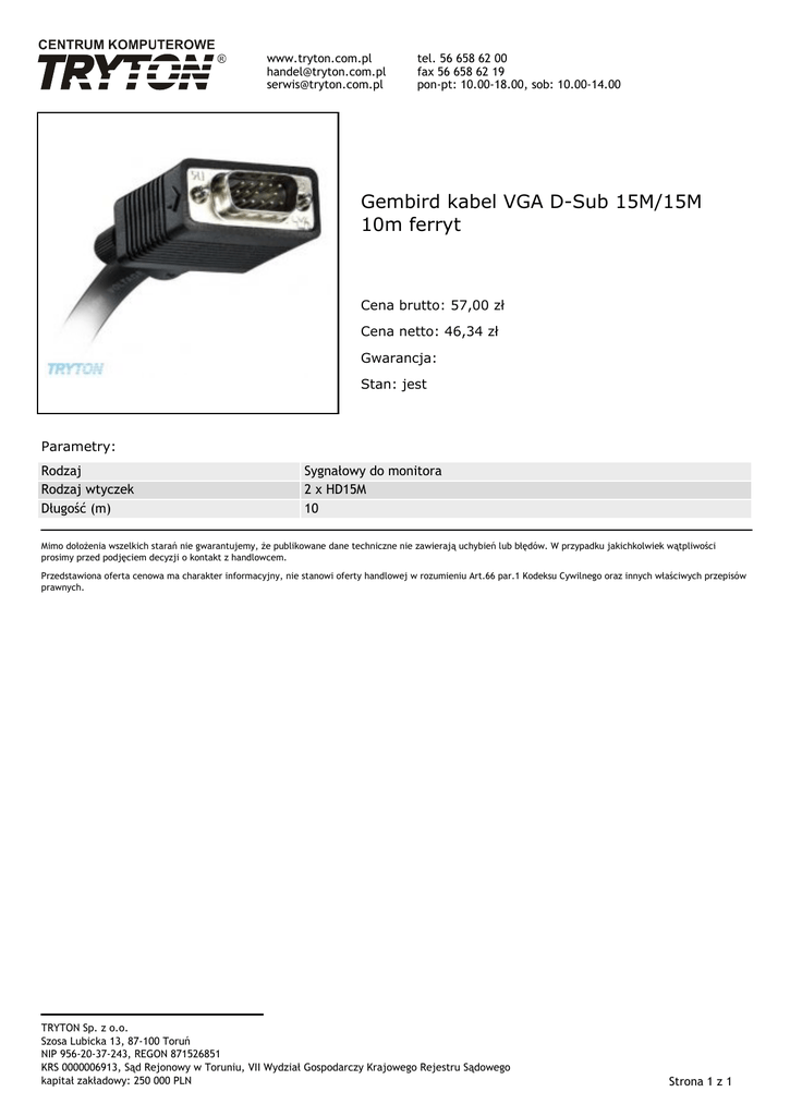 www.tryton.com.pl [email protected] [email protected] tel. 56 658 62 00 fax 56 658 62 19 pon-pt: 10.00-18.00, sob: 10.00-14.00 Gembird kabel VGA D-Sub 15M/15M 10m ferryt Cena brutto: 57,00 zł Cena netto: 46,34 zł Gwarancja: Stan: jest Parametry: Rodzaj Rodzaj wtyczek Długość (m) Sygnałowy do monitora 2 x HD15M 10 Mimo dołożenia wszelkich starań nie gwarantujemy, że publikowane dane techniczne nie zawierają uchybień lub błędów. W przypadku jakichkolwiek wątpliwości prosimy przed podjęciem decyzji o kontakt z handlowcem. Przedstawiona oferta cenowa ma charakter informacyjny, nie stanowi oferty handlowej w rozumieniu Art.66 par.1 Kodeksu Cywilnego oraz innych właściwych przepisów prawnych. TRYTON Sp. z o.o. Szosa Lubicka 13, 87-100 Toruń NIP 956-20-37-243, REGON 871526851 KRS 0000006913, Sąd Rejonowy w Toruniu, VII Wydział Gospodarczy Krajowego Rejestru Sądowego kapitał zakładowy: 250 000 PLN Strona 1 z 1