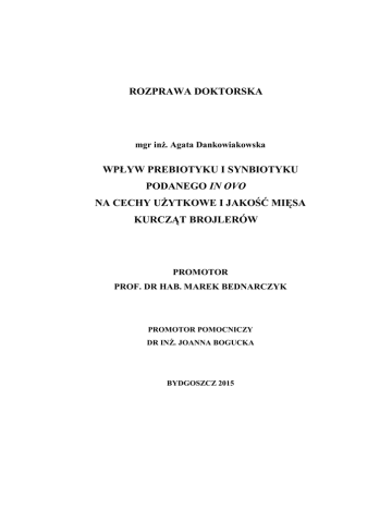 ROZPRAWA DOKTORSKA mgr inż. Agata Dankowiakowska WPŁYW PREBIOTYKU I SYNBIOTYKU PODANEGO IN OVO NA CECHY UŻYTKOWE I JAKOŚĆ MIĘSA KURCZĄT BROJLERÓW PROMOTOR PROF. DR HAB. MAREK BEDNARCZYK PROMOTOR POMOCNICZY DR INŻ. JOANNA BOGUCKA BYDGOSZCZ 2015 Praca powstała w ramach projektu Nr 2011/01/B/NZ9/00642 pt.: „Stymulacja in ovo mikrobiomu kury – charakterystyka działania prebiotyków i synbiotyków”. Pragnę złożyć serdeczne podziękowania Panu Profesorowi dr. hab. Markowi Bednarczykowi za nieocenioną pomoc udzieloną w trakcie przygotowania pracy doktorskiej, cierpliwość i wyrozumiałość. Wyrażam głęboką wdzięczność Pani dr inż. Joannie Boguckiej, osobie, bez której moja praca doktorska nie powstałaby. Dziękuję za cenne rady i wskazówki. Pragnę również podziękować za czas poświęcony na konsultacje oraz za pomoc w redagowaniu pracy. Szczególne podziękowania kieruję w stronę Pana Profesora Giuseppe Maiorano oraz całego zespołu z Uniwersytetu Molise w Campobasso, za możliwość wykonania badań oraz pomoc w analizowaniu wyników. Pragnę również wyrazić swoją wdzięczność Pracownikom Katedry Biochemii i Biotechnologii Zwierząt, którzy służyli pomocą, dobrą radą oraz wsparciem. SPIS TREŚCI 1. WPROWADZENIE ............................................................................. 14 2. PRZEGLĄD PIŚMIENNICTWA........................................................ 15 2.1. SUBSTANCJE BIOAKTYWNE .................................................. 15 2.1.1. Probiotyki ........................................................................ 15 2.1.2. Prebiotyki ........................................................................ 19 2.1.3. Synbiotyki ....................................................................... 21 3. TECHNOLOGIA IN OVO ................................................................... 23 4. JAKOŚĆ MIĘSA DROBIOWEGO..................................................... 27 5. MATERIAŁ I METODY..................................................................... 29 5.1. OCENA CECH UŻYTKOWYCH KURCZĄT BROJLERÓW ..... 32 5.1.1. Ocena wylęgowości piskląt poddanych iniekcji in ovo ...... 33 5.1.2. Wskaźnik konwersji paszy (FCR), Europejski Wskaźnik Wydajności (EWW) ......................................................... 33 5.2. OCENA CECH JAKOŚCI MIĘSA DROBIOWEGO .................... 34 5.2.1. Ocena wartości pH45 i pH24 .............................................. 34 5.2.2. Ocena jasności i nasycenia barwy ..................................... 34 5.2.3. Ocena wodochłonności mięsa (WHC) .............................. 34 5.2.4. Ocena zawartości kolagenu ogólnego ............................... 34 5.2.5. Ocena zawartości hydroksylizylopirydynoliny (HLP) ....... 36 5.2.6. Ocena zawartości cholesterolu.......................................... 36 5.3. OCENA MIKROSTRUKTURY MIĘŚNI PIERSIOWYCH.......... 37 5.3.1. Barwienie hematoksyliną i eozyną (H+E) ......................... 38 5.3.2. Barwienie czerwienią oleistą (Oil Red) ............................. 39 5.3.3. Reakcja na aktywność reduktazy terazolinowej NADH - TR ..................................................................... 39 5.3.4. Barwienie PAS (Periodic Acid - Schiff) ........................... 39 5.3.5. Barwienie kapilar ............................................................. 40 5.4. ANALIZA OBRAZU MIKROSKOPOWEGO ............................. 40 5.5. ANALIZA STATYSTYCZNA ..................................................... 41 6. WYNIKI ............................................................................................... 42 11 6.1. WYLĘGOWOŚĆ ORAZ CECHY UŻYTKOWE KURCZĄT BROJLERÓW.............................................................................. 42 6.2. CECHY JAKOŚCI MIĘSA DROBIOWEGO ............................... 43 6.3. CECHY MIKROSTRUKTURY MIĘŚNI PIERSIOWYCH .......... 46 7. DYSKUSJA .......................................................................................... 51 7.1. WYLĘGOWOŚĆ ORAZ CECHY UŻYTKOWE KURCZĄT BROJLERÓW.............................................................................. 51 7.2. CECHY JAKOŚCI MIĘSA DROBIOWEGO ............................... 54 7.3. CECHY MIKROSTRUKTURY MIĘŚNI PIERSIOWYCH .......... 59 8. WNIOSKI............................................................................................. 64 9. SPIS PIŚMIENNICTWA ..................................................................... 65 10. FOTOGRAFIE MIKROSKOPOWE .................................................. 82 11. STRESZCZENIE ................................................................................. 87 12 WYKAZ SKRÓTÓW ASW – Antybiotykowe Stymulatory Wzrostu C/F – Capillary/ Fibre Ratio (liczba kapilar przypadająca na włókno) CD – Capillary Density (gęstość kapliarna) CE – Competitive exclusion (wykluczenie konkurencyjne) CFU – Colony Forming Unit (jednostka tworząca kolonię) CSA – Cross Sectional Area (powierzchnia przekroju poprzecznego) DFD – Dark – Firm – Dry (ciemne, twarde, suche) DFM – Direct Feed Microbial FAO – Food and Agriculture Organziation (Organizacja Narodów Zjednoczonych do spraw Wyżywienia i Rolnictwa) FCR – Feed Conversion Ratio (wskaźnik spożycia paszy) FOS – Fruktooligosacharydy GALT – Gut Associated Lymphoid Tissue (tkanka limfatyczna związana z układem pokarmowym) GF – Gigant Fibre (włókno olbrzymie) GOS – Galaktooligosacharydy HLP– Hydroksylizylopirydynolina HMB – β – hydroksy – β – metylomaślan HPLC – Hight Preformance Liquid Chromatography (wysokosprawna chromatografia cieczowa) IOF – In Ovo Feeding (dożywianie in ovo) LAB – Bakterie fermentacji mlekowej MOS – Mannanooligosacharydy ORR lub RFO – Raffinose Family Oligosaccharides (Oligosacharydy Rodziny Rafinozy) PSE – Pale – Soft – Exudative (jasne, miękkie, wodniste) RNA – kwas rybonukleinowy SCF