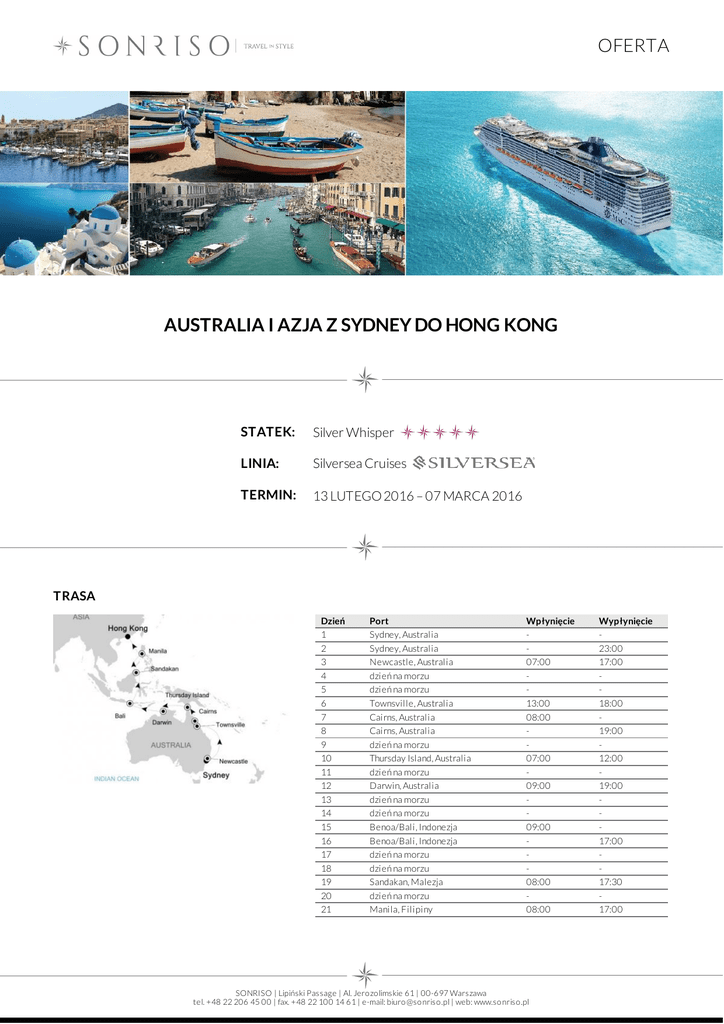 OFERTA AUSTRALIA I AZJA Z SYDNEY DO HONG KONG STATEK: Silver Whisper LINIA: Silversea Cruises TERMIN: 13 LUTEGO 2016 – 07 MARCA 2016 TRASA Dzień 1 2 3 4 5 6 7 8 9 10 11 12 13 14 15 16 17 18 19 20 21 Port Sydney, Australia Sydney, Australia Newcastle, Australia dzień na morzu dzień na morzu Townsville, Australia Cairns, Australia Cairns, Australia dzień na morzu Thursday Island, Australia dzień na morzu Darwin, Australia dzień na morzu dzień na morzu Benoa/Bali, Indonezja Benoa/Bali, Indonezja dzień na morzu dzień na morzu Sandakan, Malezja dzień na morzu Manila, Filipiny Wpłynięcie 07:00 13:00 08:00 07:00 09:00 09:00 08:00 08:00 SONRISO | Lipiński Passage | Al. Jero zo limskie 61 | 00-697 Warszawa tel. +48 22 206 45 00 | fax. +48 22 100 14 61 | e-mail: biuro @so nriso .pl | web: www.so nriso .pl Wypłynięcie 23:00 17:00 18:00 19:00 12:00 19:00 17:00 17:30 17:00 OFERTA Dzień Port Wpłynięcie Wypłynięcie 22 23 dzień na morzu Hong Kong, Chiny 12:00 - 24 Hong Kong, Chiny - - CENA Typ kabiny Cena z osobę Terrace Suite od 10 950 EUR Veranda Suite od 12 650 EUR CENA ZAWIERA DOTATKOWE OPŁATY zakwaterowanie w 2 - os apartamencie wybranej kategorii pełne wyżywienie: 3 posiłki, przekąski między posiłakmi, bufet o północy open bar: wybrane wina i szampany, alkohole premium, różnorodne kawy i herbaty, wodę mineralną butelkowaną, napoje bezalkoholowe oraz soki dostępne w barach i restauracjach korzystanie z mini baru w apartamencie serwis bagażowy podczas wejścia i zejścia ze statku obsługa kamerdynerska 24 godzinny serwis kabinowy korzystanie z urządzeń sportowo - rekreacyjnych dostępnych na pokładzie (baseny, jacuzzi, boiska sportowe, itp.) udział we wszystkich imprezach organizowanych na pokładzie (przedstawienia, pokazy, aukcje, animacje i inne) opłatę serwisową (napiwki) dla obsługi statku transfer pomiędzy portem a miastem (uzależniony od lokalnych przepisów) obowiązkowe opłaty portowe dojazd/przelot do portu rozpoczęcia i zakończenia rejsu transfery (lotnisko - port - lotnisko) ewentualne noclegi przed lub po rejsie wycieczki fakultatywne korzystanie z usług typu: SPA, salon piękności, pralnia itp. wydatki osobiste tj. zakupy w butikach, internet, kasyno itp. obowiązkowe ubezpieczenie turystyczne koszt wymaganych wiz ewentualna opłata paliwowa (linia w momencie wzrotu cen ropy zastrzega sobie prawo do dodania oplaty paliwowej do każdej rezerwacji) Na życzenie świadczymy dodatkowo usługi: rezerwacje hotelowe na całym świecie rezerwacje biletów lotniczych, trasferów oraz parkingu w porcie rezerwacje wycieczek fakultatywnych i innych atrakcji SONRISO | Lipiński Passage | Al. Jero zo limskie 61 | 00-697 Warszawa tel. +48 22 206 45 00 | fax. +48 22 100 14 61 | e-mail: biuro @so nriso .pl | web: www.so nriso .pl