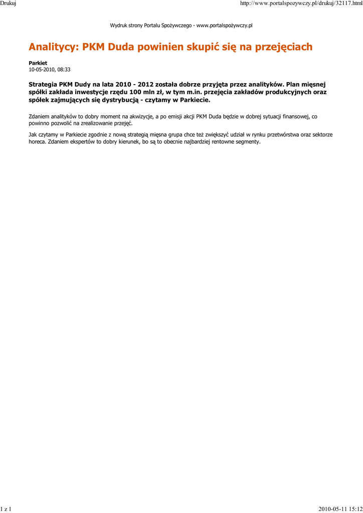 Drukuj 1z1 http://www.portalspozywczy.pl/drukuj/32117.html Wydruk strony Portalu SpoŜywczego - www.portalspoŜywczy.pl Analitycy: PKM Duda powinien skupić się na przejęciach Parkiet 10-05-2010, 08:33 Strategia PKM Dudy na lata 2010 - 2012 została dobrze przyjęta przez analityków. Plan mięsnej spółki zakłada inwestycje rzędu 100 mln zł, w tym m.in. przejęcia zakładów produkcyjnych oraz spółek zajmujących się dystrybucją - czytamy w Parkiecie. Zdaniem analityków to dobry moment na akwizycje, a po emisji akcji PKM Duda będzie w dobrej sytuacji finansowej, co powinno pozwolić na zrealizowanie przejęć. Jak czytamy w Parkiecie zgodnie z nową strategią mięsna grupa chce teŜ zwiększyć udział w rynku przetwórstwa oraz sektorze horeca. Zdaniem ekspertów to dobry kierunek, bo są to obecnie najbardziej rentowne segmenty. 2010-05-11 15:12