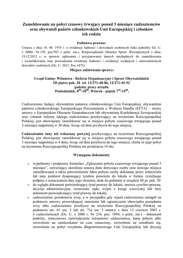 Zameldowanie na pobyt czasowy trwający ponad 3 miesiące cudzoziemców oraz obywateli państw członkowskich Unii Europejskiej i członków ich rodzin Podstawa prawna: Ustawa z dnia 10. 04. 1974 r. o ewidencji ludności i dowodach osobistych (teks jednolity Dz. U. z 2006r. Nr.139, poz.993 z późn .zm.), Rozporządzenie Ministra Spraw Wewnętrznych z dnia: 19.12.2012 r. w sprawie zgłaszania i przyjmowania danych niezbędnych do zameldowania i wymeldowania oraz prowadzenia ewidencji ludności i ewidencji wydanych i unieważnionych dowodów osobistych (Dz. U. 2012. Poz.1475) Miejsce załatwienia sprawy: Urząd Gminy Wiśniowa - Referat Organizacyjny i Spraw Obywatelskich III piętro pok. 20 tel. 12/271-40-86, 12/271-45-52 godziny pracy urzędu Poniedziałek. 800-1800, Wtorek - piątek 730-1500, Cudzoziemiec będący obywatelem państwa członkowskiego Unii Europejskiej, obywatelem państwa członkowskiego Europejskiego Porozumienia o Wolnym Handlu (EFTA) – strony umowy o Europejskim Obszarze Gospodarczym lub obywatelem Konfederacji Szwajcarskiej oraz członek rodziny takiego cudzoziemca przebywający na terytorium Rzeczypospolitej Polskiej, jest obowiązany zameldować się w miejscu pobytu czasowego trwającego ponad 3 miesiące najpóźniej w 30 dniu, licząc od dnia przybycia do tego miejsca. Cudzoziemiec inny niż wskazany powyżej przebywający na terytorium Rzeczypospolitej Polskiej, jest obowiązany zameldować się w miejscu pobytu czasowego trwającego ponad 3 miesiące najpóźniej w 4 dniu, licząc od dnia przybycia do tego miejsca, chyba że jego pobyt na terytorium Rzeczypospolitej Polskiej nie przekracza 14 dni. Wymagane dokumenty • • • wypełniony i podpisany formularz „Zgłoszenie pobytu czasowego trwającego ponad 3 miesiące”, zawierający określone ustawą dane dotyczące osoby oraz nowego miejsca zameldowania a także potwierdzenie faktu pobytu osoby dokonane przez właściciela lub inny podmiot dysponujący tytułem prawnym do lokalu w formie czytelnego podpisu z oznaczeniem daty jego złożenia; druk do pobrania w urzędzie III pt. pok. 20 do wglądu dokument potwierdzający tytuł prawny do lokalu: umowa cywilno-prawna, decyzja administracyjna, orzeczenie sądu, wypis z księgi wieczystej lub inny dokument poświadczający tytuł prawny do lokalu; cudzoziemiec przedstawia wizę, a w przypadku gdy wjazd cudzoziemca nastąpił na podstawie umowy przewidującej zniesienie lub ograniczenie obowiązku posiadania wizy albo cudzoziemiec przebywa na terytorium Rzeczypospolitej Polskiej na podstawie art. 61 ust. 3 lub art. 71a ust. 3 ustawy z dnia 13 czerwca 2003 r. o cudzoziemcach (Dz. U. z 2006 r. Nr 234, poz. 1694, z późn. zm.) - dokument podróży, tymczasowe zaświadczenie tożsamości cudzoziemca, kartę pobytu albo zezwolenie na zamieszkanie na czas oznaczony, zezwolenie na osiedlenie się, zezwolenie na pobyt rezydenta długoterminowego Unii Europejskiej lub decyzję • • o nadaniu statusu uchodźcy w Rzeczypospolitej Polskiej, udzieleniu w Rzeczypospolitej Polskiej ochrony uzupełniającej lub zgody na pobyt tolerowany; obywatel państwa członkowskiego Unii Europejskiej przedstawia ważny dokument podróży lub inny dokument potwierdzający jego tożsamość i obywatelstwo oraz ważny dokument potwierdzający prawo stałego pobytu lub zaświadczenie o zarejestrowaniu pobytu obywatela Unii Europejskiej lub, w przypadku braku zaświadczenia, składa oświadczenie o zarejestrowaniu pobytu na terytorium Rzeczypospolitej Polskiej; członek jego rodziny obywatela UE niebędący obywatelem państwa członkowskiego Unii Europejskiej przedstawia ważny dokument podróży oraz ważną kartę stałego pobytu członka rodziny obywatela Unii Europejskiej lub ważną kartę pobytu członka rodziny obywatela Unii Europejskiej. Termin i sposób załatwienia sprawy W chwili przyjęcia zgłoszenia meldunkowego. Osoba otrzymuje potwierdzenie zameldowania ważne do czasu upływu terminu zameldowania Tryb odwoławczy Brak, czynność materialno-techniczna Opłaty nie są pobierane. Uwagi • • • • • za osobę nieposiadającą pełnej zdolności do czynności prawnych obowiązek meldunkowy wykonuje jej przedstawiciel ustawowy lub inna osoba sprawująca nad nią faktyczną opiekę w miejscu ich wspólnego pobytu; osoba, która przedłuża pobyt czasowy w tej samej miejscowości ponad zgłoszony czas jego trwania, zmienia adres albo zmienia pobyt czasowy na stały, jest obowiązana dokonać odpowiedniego zameldowania w ciągu 30 dni od daty zmiany; zasady meldowania obywateli państw członkowskich Unii Europejskiej stosuje się do obywateli państwa należącego do Europejskiego Porozumienia o Wolnym Handlu (EFTA) stron umowy o Europejskim Obszarze Gospodarczym lub Konfederacji Szwajcarskiej, którzy mogą korzystać ze swobody przepływu osób na podstawie umów zawartych przez te państwa ze Wspólnotą Europejską i jej państwami członkowskim oraz do członków ich rodzin; zameldowania na pobyt czasowy trwający ponad 3 miesiące można dopełnić przez pełnomocnika, legitymującego się pełnomocnictwem udzielonym w formie, o której mowa w art. 33 § 2 ustawy z dnia 14 czerwca 1960 r. – Kodeks postępowania administracyjnego (Dz. U. z 2000 r. Nr 98, poz. 1071, z późn. zm.3), po okazaniu przez pełnomocnika do wglądu jego dowodu osobistego, a w uzasadnionych przypadkach – innego dokumentu pozwalającego na ustalenie tożsamości; cudzoziemiec niebędący obywatelem państwa członkowskiego Unii Europejskiej i niebędący członkiem rodziny obywatela państwa członkowskiego Unii Europejskiej oraz niebędący obywatelem państwa należącego do Europejskiego Porozumienia o Wolnym Handlu (EFTA) - stron umowy o Europejskim Obszarze Gospodarczym lub Konfederacji Szwajcarskiej, dokonuje zameldowania na pobyt czasowy na czas nie dłuższy niż okres legalnego pobytu na terytorium Rzeczypospolitej Polskiej, wynikający z dokumentu potwierdzającego jego 