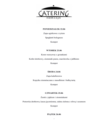 PONIEDZIAŁEK 22.06 Zupa ogórkowa z ryżem Spaghetti bolognese Kompot WTOREK 23.06 Krem warzywny z grzankami Kotlet drobiowy, ziemniaki puree, marchewka z jabłkiem Kompot ŚRODA 24.06 Zupa kalafiorowa Kopytka ziemniaczane z masełkiem i bułką tartą Kompot CZWARTEK 25.06 Żurek z jajkiem i ziemniakami Potrawka drobiowa, kasza jęczmienna, sałata zielona z oliwą i sezamem Kompot PIĄTEK 26.06 -