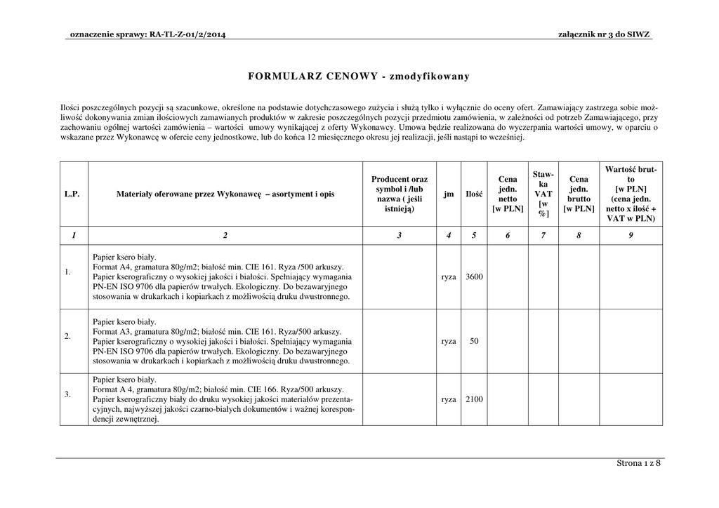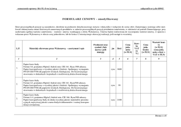 oznaczenie sprawy: RA-TL-Z-01/2/2014 załącznik nr 3 do SIWZ FORMULARZ CENOWY - zmodyfikowany Ilości poszczególnych pozycji są szacunkowe, określone na podstawie dotychczasowego zuŜycia i słuŜą tylko i wyłącznie do oceny ofert. Zamawiający zastrzega sobie moŜliwość dokonywania zmian ilościowych zamawianych produktów w zakresie poszczególnych pozycji przedmiotu zamówienia, w zaleŜności od potrzeb Zamawiającego, przy zachowaniu ogólnej wartości zamówienia – wartości umowy wynikającej z oferty Wykonawcy. Umowa będzie realizowana do wyczerpania wartości umowy, w oparciu o wskazane przez Wykonawcę w ofercie ceny jednostkowe, lub do końca 12 miesięcznego okresu jej realizacji, jeśli nastąpi to wcześniej. Ilość Cena jedn. netto [w PLN] Stawka VAT [w %] Cena jedn. brutto [w PLN] Wartość brutto [w PLN] (cena jedn. netto x ilość + VAT w PLN) 4 5 6 7 8 9 Papier ksero biały. Format A4, gramatura 80g/m2; białość min. CIE 161. Ryza /500 arkuszy. Papier kserograficzny o wysokiej jakości i białości. Spełniający wymagania PN-EN ISO 9706 dla papierów trwałych. Ekologiczny. Do bezawaryjnego stosowania w drukarkach i kopiarkach z moŜliwością druku dwustronnego. ryza 3600 Papier ksero biały. Format A3, gramatura 80g/m2; białość min. CIE 161. Ryza/500 arkuszy. Papier kserograficzny o wysokiej jakości i białości. Spełniający wymagania PN-EN ISO 9706 dla papierów trwałych. Ekologiczny. Do bezawaryjnego stosowania w drukarkach i kopiarkach z moŜliwością druku dwustronnego. ryza 50 Papier ksero biały. Format A 4, gramatura 80g/m2; białość min. CIE 166. Ryza/500 arkuszy. Papier kserograficzny biały do druku wysokiej jakości materiałów prezentacyjnych, najwyŜszej jakości czarno-białych dokumentów i waŜnej korespondencji zewnętrznej. ryza 2100 L.P. Materiały oferowane przez Wykonawcę – asortyment i opis Producent oraz symbol i /lub nazwa ( jeśli istnieją) 1 2 3 1. 2. 3. jm Strona 1 z 8 oznaczenie sprawy: RA-TL-Z-01/2/2014 4. 5. 6. 7. 8. 9. 10. 11. 12. Papier ksero biały. Format A 3, gramatura 80g/m2; białość min. CIE 166. Ryza/500 arkuszy. Papier kserograficzny biały do druku wysokiej jakości materiałów prezentacyjnych, najwyŜszej jakości czarno-białych dokumentów i waŜnej korespondencji zewnętrznej. Papier ksero biały. Format A4, gramatura 100g/m2. Ryza/500 arkuszy. Papier kserograficzny biały najwyŜszej jakości, bardzo wysokiej białości i gładkości. Do wydruków zawierających grafikę w kolorze. Papier ksero super biały. Format A4, gramatura 160g/m2; białość CIE 168. Opakowanie/250 arkuszy. Papier najwyŜszej jakości, bardzo wysokiej białości i gładkości. Do wydruków zawierających grafikę w kolorze. Papier ksero biały. Format A4, gramatura: 200g- 220g/m2; najwyŜszej jakości, bardzo wysokiej białości CIE i gładkości. Opakowanie/250 arkuszy. Papier kserograficzny super biały, do wydruków zawierających grafikę w kolorze. Papier biały specjal./inkjet. Format A4, gramatura 120g/m2. Opakowanie/250 arkuszy. Specjalny papier do Inkjet. NajwyŜszej jakości papier (do wydruków kolorowych dokumentów ze zdjęciami o wysokiej rozdzielczości) do stosowania w kolorowych drukarkach atramentowych. Papier biały specjalny/laser. Wysokiej jakości. Format A3, gramatura 160g/m2. Opakowanie/250 arkuszy. Do stosowania w kolorowych drukarkach laserowych i kopiarkach. Papier biały specjalny/laser. Format A4, gramatura 170g - 190g/m2. białość od 161CIE. Opakowanie/250 arkuszy. Do kolorowych wydruków o fotograficznej jakości. Specjalny do stosowania w kolorowych drukarkach laserowych. Papier biały satynowany. Format A4, gramatura: 120-135g/m2, białość CIE 168. Ryza/500 arkuszy. Wysokiej jakości satynowany biały papier do pełnokolorowych wydruków i kopii kolorowych. Papier satynowany w kolorze ecru lub kość słoniowa. Format A4, gramatura 160g/m2. Opakowanie/250 arkuszy. Wysokiej jakości satynowany nie bielony papier do kolorowych kopiarek i drukarek laserowych. załącznik nr 3 do SIWZ ryza 10 ryza 10 op. 5 op. 10 op. 2 op. 5 op. 2 ryza 5 op. 5 Strona 2 z 8 oznaczenie sprawy: RA-TL-Z-01/2/2014 13. 14. 15. 16. 17. 18. 19. 20. 21. Papier satynowany ecru lub kość słoniowa. Format A4, gramatura: 200g-220g/m2; Opakowanie/ 250 arkuszy. Wysokiej jakości satynowany nie bielony papier do kolorowych kopiarek i drukarek laserowych. Papier ksero kolor. Wg wyboru zamawiającego 1 ryza/ jeden kolor pastel lub delikatny pastel. Format A4, gramatura 80g/m2; ryza/ 500 arkuszy. O szerokiej gamie kolorów pastelowych jasnych i delikatnych pasteli. Papier ksero kolorowy. Wg wyboru zamawiającego 1 ryza/ jeden kolor pastel mocny. Format A4, gramatura 80g/m2. Ryza/ 500 arkuszy. Papier o szerokiej gamie kolorów pastelowych mocnych. Do drukarek i kopiarek. Papier ksero kolorowy o szerokiej gamie kolorów intensywnych, Ŝywych fluorescencyjnych neon. Według wyboru zamawiającego /1 ryza / jeden kolor. Format A4, gramatura 80g/m2. Ryza/ 500 arkuszy. Do drukarek i kopiarek. załącznik nr 3 do SIWZ op. 5 ryza 15 ryza 10 ryza 2 Papier kserograficzny kolorowy o szerokiej gamie kolorów pastelowych od pasteli jasnych po ciemne. Według wyboru zamawiającego 1 opakowanie/ jeden kolor. Format A4, gramatura 80g/m2. Opakowanie/ 100 arkuszy. Do stosowania w InkJet+laser+ksero. op. 5 Papier ksero kolorowy o szerokiej gamie kolorów intensywnych lub neon. Według wyboru zamawiającego 1 opakowanie/ jeden kolor. Format A4, gramatura 80g/m2. Opakowanie/100 arkuszy. Zastosowanie: kopiarka, drukarka atrament. lub laser. op. 10 Papier ksero kolorowy o szerokiej gamie kolorów pastelowych. Jeden kolor pastel lub jasny delikatny pastel. Według wyboru zamawiającego. Format A3, gramatura 80g/m2. Ryza/500 arkuszy. ryza 5 Papier ksero kolorowy o szerokiej gamie kolorów pastelowych od delikatnych po jasne odcienie. Według wyboru zamawiającego jeden kolor. Format A4, gramatura 160g/m2. Opakowanie/ 250 arkuszy. Do urządze