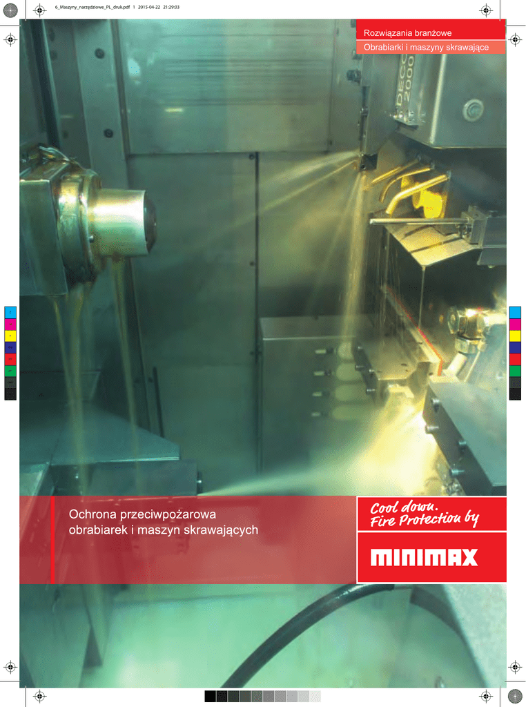 6_Maszyny_narzędziowe_PL_druk.pdf 1 2015-04-22 21:29:03 Rozwiązania branżowe Obrabiarki i maszyny skrawające C M Y CM MY CY CMY K ROZPOZNANIE RYZYKA Rozpoznanie ryzyka Niebezpieczne części maszyn obróbki metali lekkich i ich stopów Obrabiarki i maszyny skrawające powstają dodatkowe zagrożenia używane przy obróbce metali, takiej jak wiercenie, toczenie, szlifowanie itd., pożarowe. wykorzystujące łatwopalne smary, chłodziwa stanowią potencjalne ryzyko wybuchu pożaru. Dodatkowo podczas Elementy maszyn szczególnie obarczone ryzykiem pożarowym, gdzie w szczególności należy rozpatrywać możliwość stosowania systemów Ppoż. przestrzeń robocza (wiercenie, szlifowanie, frezowanie, wygładzanie itp.) obszar pomiędzy systemami hydraulicznymi i manipulatorami obrabiarki. obszar przenośnika (wprowadzenie i wyprowadzanie materiału) kanały wyciągowe do klap Ppoż. lub filtr elektrostatyczny. W sytuacjach kiedy obrabiarka jest podłączona do centralnego systemu wyciągowego lub innych maszyn, zakres ochrony pożarowej systemu powinien zostać rozszerzony o te elementy. Jeżeli zaistnieje potrzeba, system ochrony Ppoż. można rozszerzyć o inne obszary przyległe np. szafy sterownicze, obszary regeneracji oleju itp. system umożliwia taką rozbudowę. Rozwiązania branżowe Rozwiązania ochrony przeciwpożarowej Warunkiem stworzenia kompletnej ochrony Ppoż jest indywidualnie opracowana koncepcja systemu ochrony przecipożarowej obejmująca wszystkie istotne kwestie i zagadnienia dotyczące bezpieczeństwa. System gaśniczy stanowi podstawę do opracowania koncepcji. Firma Minimax oferuje niezawodne rozwiązania przecizpożarowe dla obrabiarek i maszyn skrawających. Instalacje gaśnicze niezwłocznie i automatycznie rozpoznaja wczesnie oznaki pojawienia się ognia i pozwalają zminimalizować zniszczenia. Przedstawione rozwiązania są zgodne z najnowszą wiedzą specjalisyów ppoż i przepisów prawa zostały przetestowane w warunkach zbliżonych do rzeczywistych. BEZPIECZEŃSTWO INDYWIDUALNA KONCEPCJA Nasi eksperci z przyjemnością przekażą Państwu cenne wskazówki ułatwiające podjęcie właściwej decyzji dotyczącej systemu, koncepcji ochrony Ppoż oferowanej przez MINIMAX. Przy Państwa współudziale wypracujjemy najbardziej dopasowane rozwiązania techniczne uwzględniając charakter, funkcjonalność oraz przeznaczenie obiektu. MINIMAX oferuje państwu stałe wsparcie techniczne w trakcie eksploatacji urządzeń jak również po ich modernizacji. Minimax jest pionierem w tworzeniu indywidualnych systemów przeciwpożarowych, które były wykorzystywane już setki razy na całym świecie. SYSTEMY SYGNALIZACJI POŻAROWEJ Właściwie dobrane kombinacje czujek detekcji pożaru gwarantują wysoka czułość i niezawodność przy minimalnym ryzyku powstania fałszywych alarmów. Przycisk ROP (ręczny ostrzegacz pożarowy), może zostać użyty w celu ręcznego uruchomienia alarmu lub aktywacji systemu gaśniczego. Wkrótce po zarejestrowaniu sygnału o pożarze przez Centralę Sygnalizacji Pożarowej, centrala poprzez programowalny moduł sterowniczy weryfikuje sygnał pożarowy, aktywuje program ustawienia pożarowe (awaryjne) obrabiarki po czym odcina zasilanie urządzenia. Panel sterujący uruchamia proces gaszenia (uruchomienie sygnalizacji akustyczno-optycznej i rozpoczęcie uwalniania środka gaśniczego). Kiedy pojawia się ogień, zwykle rozprzestrzenia się on bardzo szybko. Czujki płomienia i różnicowe czujki temperatury, zainstalowane w przestrzeniach wysokiego ryzyka pożarowego, automatycznie rozpoznają wszelkie zagrożenia pożarowe we wczesnym stadium pożaru, monitorując typowe cechy pożaru. Ochrona przeciwpożarowa firmy Minimax jest projektowana, produkowana oraz instalowana zgodnie z krajowymi i międzynarodowymi normami i wskazówkami, gwarantując jakość i zapewniając bezpieczeństwo. TECHNOLOGIA Rozwiązania branżowe FUNKCJI KONTROLNYCH Sterowanie i wyłączanie Urządzeń Pożar może zostać z powodzeniem ugaszony, przy właściwie dobranej procedurze sterowania urządzeniami podczas trwania pożaru. Przeciwdziałając przy tym zniszczeniu i niekontrolowanej dezaktywacji cennych urządzeń. Blokowanie Przydatną funkcję stanowi serwisowa blokada maszyny. Wyłącznik bezpieczeństwa przerywa połączenie z systemami gaśniczymi tak by w przypadku np. otwarcia drzwi obudowy, podczas prowadzenia prac konserwacyjnych, zablokować przypadkowe uruchomienie urządzenia i błędne działanie elementów detekcji systemu gaśniczego MINIMAX. Alarmowanie Sygnał dźwiękowy alarmujący jest aktywowany w sytuacji wykrycia pożaru, może on zostać uzupełniony o sygnalizację optyczną. Zawór odciążający w przypadku wybuchu Ciśnienie występujące podczas wybuchu może zostać zmniejszone do bezpiecznego poziomu poprzez zastosowanie stref odciążających działających już we wczesnym etapie eksplozji. Do tego celu specjalnie wbudowywuje się w obudowę urządzenia zawory odciążające. Tak by w przypadku wybuchu, zapewniły otwory upuszczające ciśnienie i płomienie. Stanowi to zabezpieczenie przed zniszczeniem obudowy, pokryw oraz innych wrażliwych elementów urządzenia. Odprowadzenie fali wybuchowej oraz płomieni musi odbywać się w sposób nie stwarzający nowego ryzyka pożarowego oraz niebezpieczeństwa dla osób obsługujących urządzenie. Projektowanie, umiejscowienie, Przykładowa procedura poprzedzająca gaszenie - Wycofanie głowicy obrabiarki w pozycję bezpieczną (pożar). - Wyłączenie urządzeń wentylacyjnych oraz innych procesów wspomagających. - Ustawienie klap Ppoż. w pozycję POŻAR. - Zamknięcie elektromagnetycznego zaworu sprężonego powietrza. - Wyłączenie maszyny. - Przekazanie alarmu pożarowego do Centrali Sygnalizacji Pożaru. - Przekazanie zakłóceń systemu instalacja oraz integracja klap upustowych w przypadku uszkodzenia elementów w urządzeniu wymaga wiedzy eksperckiej detekcji po