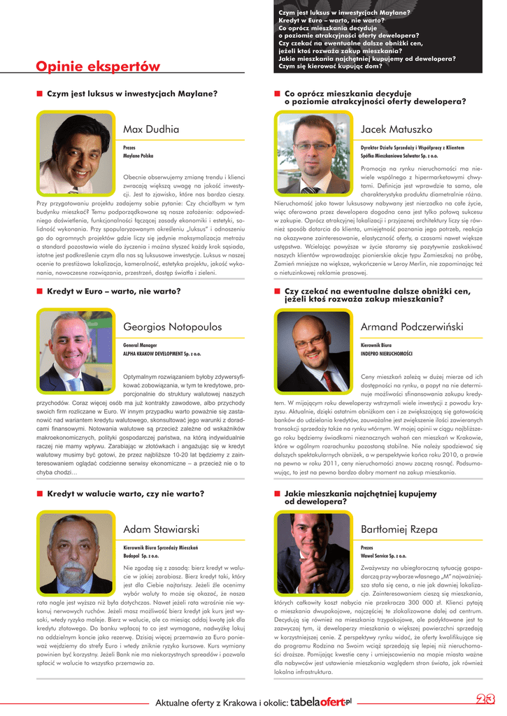 Opinie ekspertów Czym jest luksus w inwestycjach Maylane? Czym jest luksus w inwestycjach Maylane? Kredyt w Euro – warto, nie warto? Co oprócz mieszkania decyduje o poziomie atrakcyjności oferty dewelopera? Czy czekać na ewentualne dalsze obniżki cen, jeżeli ktoś rozważa zakup mieszkania? Jakie mieszkania najchętniej kupujemy od dewelopera? Czym się kierować kupując dom? Co oprócz mieszkania decyduje o poziomie atrakcyjności oferty dewelopera? Max Dudhia Jacek Matuszko Prezes Dyrektor Działu Sprzedaży i Współpracy z Klientem Maylane Polska Spółka Mieszkaniowa Salwator Sp. z o.o. Obecnie obserwujemy zmianę trendu i klienci zwracają większą uwagę na jakość inwestycji. Jest to zjawisko, które nas bardzo cieszy. Przy przygotowaniu projektu zadajemy sobie pytanie: Czy chciałbym w tym budynku mieszkać? Temu podporządkowane są nasze założenia: odpowiedniego doświetlenia, funkcjonalności łączącej zasady ekonomiki i estetyki, solidność wykonania. Przy spopularyzowanym określeniu „luksus” i odnoszeniu go do ogromnych projektów gdzie liczy się jedynie maksymalizacja metrażu a standard pozostawia wiele do życzenia i można słyszeć każdy krok sąsiada, istotne jest podkreślenie czym dla nas są luksusowe inwestycje. Luksus w naszej ocenie to prestiżowa lokalizacja, kameralność, estetyka projektu, jakość wykonania, nowoczesne rozwiązania, przestrzeń, dostęp światła i zieleni. Kredyt w Euro – warto, nie warto? Promocja na rynku nieruchomości ma niewiele wspólnego z hipermarketowymi chwytami. Definicja jest wprawdzie ta sama, ale charakterystyka produktu diametralnie różna. Nieruchomość jako towar luksusowy nabywany jest nierzadko na całe życie, więc oferowana przez dewelopera dogodna cena jest tylko połową sukcesu w zakupie. Oprócz atrakcyjnej lokalizacji i przyjaznej architektury liczy się również sposób dotarcia do klienta, umiejętność poznania jego potrzeb, reakcja na okazywane zainteresowanie, elastyczność oferty, a czasami nawet większe ustępstwa. Wcielając powyższe w życie staramy się pozytywnie zaskakiwać naszych klientów wprowadzając pionierskie akcje typu Zamieszkaj na próbę, Zamień mniejsze na większe, wykończenie w Leroy Merlin, nie zapominając też o nietuzinkowej reklamie prasowej. Czy czekać na ewentualne dalsze obniżki cen, jeżeli ktoś rozważa zakup mieszkania? Georgios Notopoulos Armand Podczerwiński General Manager Kierownik Biura ALPHA KRAKOW DEVELOPMENT Sp. z o.o. INDEPRO NIERUCHOMOŚCI Optymalnym rozwiązaniem byłoby zdywersyfikować zobowiązania, w tym te kredytowe, proporcjonalnie do struktury walutowej naszych przychodów. Coraz więcej osób ma już kontrakty zawodowe, albo przychody swoich firm rozliczane w Euro. W innym przypadku warto poważnie się zastanowić nad wariantem kredytu walutowego, skonsultować jego warunki z doradcami finansowymi. Notowania walutowe są przecież zależne od wskaźników makroekonomicznych, polityki gospodarczej państwa, na którą indywidualnie raczej nie mamy wpływu. Zarabiając w złotówkach i angażując się w kredyt walutowy musimy być gotowi, że przez najbliższe 10-20 lat będziemy z zainteresowaniem oglądać codzienne serwisy ekonomiczne – a przecież nie o to chyba chodzi… Ceny mieszkań zależą w dużej mierze od ich dostępności na rynku, a popyt na nie determinuje możliwości sfinansowania zakupu kredytem. W mijającym roku deweloperzy wstrzymali wiele inwestycji z powodu kryzysu. Aktualnie, dzięki ostatnim obniżkom cen i ze zwiększającą się gotowością banków do udzielania kredytów, zauważalne jest zwiększenie ilości zawieranych transakcji sprzedaży także na rynku wtórnym. W mojej opinii w ciągu najbliższego roku będziemy świadkami nieznacznych wahań cen mieszkań w Krakowie, które w ogólnym rozrachunku pozostaną stabilne. Nie należy spodziewać się dalszych spektakularnych obniżek, a w perspektywie końca roku 2010, a prawie na pewno w roku 2011, ceny nieruchomości znowu zaczną rosnąć. Podsumowując, to jest na pewno bardzo dobry moment na zakup mieszkania. Kredyt w walucie warto, czy nie warto? Jakie mieszkania najchętniej kupujemy od dewelopera? Adam Stawiarski Bartłomiej Rzepa Kierownik Biura Sprzedaży Mieszkań Prezes Budopol Sp. z o.o. Wawel Service Sp. z o.o. Nie zgodzę się z zasadą: bierz kredyt w walucie w jakiej zarabiasz. Bierz kredyt taki, który jest dla Ciebie najtańszy. Jeżeli źle ocenimy wybór waluty to może się okazać, że nasza rata nagle jest wyższa niż była dotychczas. Nawet jeżeli rata wzrośnie nie wykonuj nerwowych ruchów. Jeżeli masz możliwość bierz kredyt jak kurs jest wysoki, wtedy ryzyko maleje. Bierz w walucie, ale co miesiąc oddaj kwotę jak dla kredytu złotowego. Do banku wpłacaj to co jest wymagane, nadwyżkę lokuj na oddzielnym koncie jako rezerwę. Dzisiaj więcej przemawia za Euro ponieważ wejdziemy do strefy Euro i wtedy zniknie ryzyko kursowe. Kurs wymiany powinien być korzystny. Jeżeli Bank nie ma niekorzystnych spreadów i pozwala spłacić w walucie to wszystko przemawia za. Zważywszy na ubiegłoroczną sytuację gospodarczą przy wyborze własnego „M” najważniejsza stała się cena, a nie jak dawniej lokalizacja. Zainteresowaniem cieszą się mieszkania, których całkowity koszt nabycia nie przekracza 300 000 zł. Klienci pytają o mieszkania dwupokojowe, najczęściej te zlokalizowane dalej od centrum. Decydują się również na mieszkania trzypokojowe, ale podyktowane jest to zazwyczaj tym, iż deweloperzy mieszkania o większej powierzchni sprzedają w korzystniejszej cenie. Z perspektywy rynku widać, że oferty kwalifikujące się do programu Rodzina na Swoim wciąż sprzedają się lepiej niż nieruchomości droższe. Pomijając kwestie ceny i umiejscowienia na mapie miasta ważne dla nabywców jest ustawienie mieszkania względem stron świata, jak również lokalna infrastruktura. Aktualne ofert