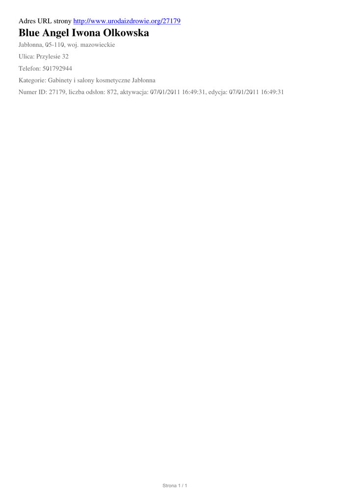 Adres URL strony http://www.urodaizdrowie.org/27179 Blue Angel Iwona Olkowska Jabłonna, 05-110, woj. mazowieckie Ulica: Przylesie 32 Telefon: 501792944 Kategorie: Gabinety i salony kosmetyczne Jabłonna Numer ID: 27179, liczba odsłon: 872, aktywacja: 07/01/2011 16:49:31, edycja: 07/01/2011 16:49:31 Strona 1 / 1