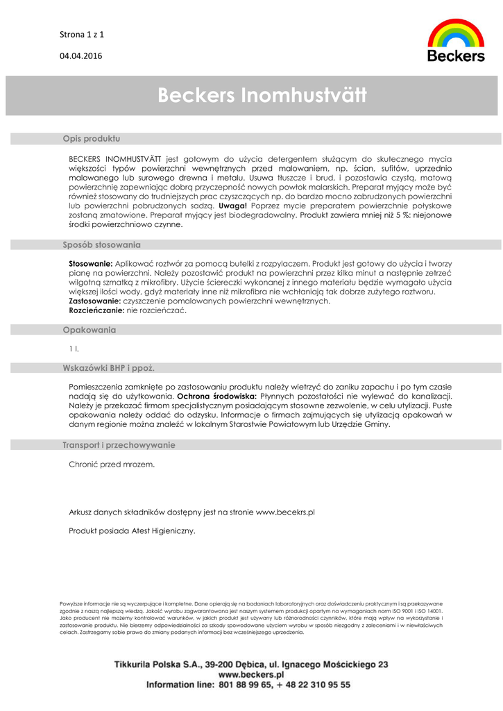 Strona 1 z 1 04.04.2016 Beckers Inomhustvätt Opis produktu BECKERS INOMHUSTVÄTT jest gotowym do użycia detergentem służącym do skutecznego mycia większości typów powierzchni wewnętrznych przed malowaniem, np. ścian, sufitów, uprzednio malowanego lub surowego drewna i metalu. Usuwa tłuszcze i brud, i pozostawia czystą, matową powierzchnię zapewniając dobrą przyczepność nowych powłok malarskich. Preparat myjący może być również stosowany do trudniejszych prac czyszczących np. do bardzo mocno zabrudzonych powierzchni lub powierzchni pobrudzonych sadzą. Uwaga! Poprzez mycie preparatem powierzchnie połyskowe zostaną zmatowione. Preparat myjący jest biodegradowalny. Produkt zawiera mniej niż 5 %: niejonowe środki powierzchniowo czynne. Sposób stosowania Stosowanie: Aplikować roztwór za pomocą butelki z rozpylaczem. Produkt jest gotowy do użycia i tworzy pianę na powierzchni. Należy pozostawić produkt na powierzchni przez kilka minut a następnie zetrzeć wilgotną szmatką z mikrofibry. Użycie ściereczki wykonanej z innego materiału będzie wymagało użycia większej ilości wody, gdyż materiały inne niż mikrofibra nie wchłaniają tak dobrze zużytego roztworu. Zastosowanie: czyszczenie pomalowanych powierzchni wewnętrznych. Rozcieńczanie: nie rozcieńczać. Opakowania 1 l. Wskazówki BHP i ppoż. Pomieszczenia zamknięte po zastosowaniu produktu należy wietrzyć do zaniku zapachu i po tym czasie nadają się do użytkowania. Ochrona środowiska: Płynnych pozostałości nie wylewać do kanalizacji. Należy je przekazać firmom specjalistycznym posiadającym stosowne zezwolenie, w celu utylizacji. Puste opakowania należy oddać do odzysku. Informacje o firmach zajmujących się utylizacją opakowań w danym regionie można znaleźć w lokalnym Starostwie Powiatowym lub Urzędzie Gminy. Transport i przechowywanie Chronić przed mrozem. Arkusz danych składników dostępny jest na stronie www.becekrs.pl Produkt posiada Atest Higieniczny. Powyższe informacje nie są wyczerpujące i kompletne. Dane opierają się na badaniach laboratoryjnych oraz doświadczeniu praktycznym i są przekazywane zgodnie z naszą najlepszą wiedzą. Jakość wyrobu zagwarantowana jest naszym systemem produkcji opartym na wymaganiach norm ISO 9001 i ISO 14001. Jako producent nie możemy kontrolować warunków, w jakich produkt jest używany lub różnorodności czynników, które mają wpływ na wykorzystanie i zastosowanie produktu. Nie bierzemy odpowiedzialności za szkody spowodowane użyciem wyrobu w sposób niezgodny z zaleceniami i w niewłaściwych celach. Zastrzegamy sobie prawo do zmiany podanych informacji bez wcześniejszego uprzedzenia.