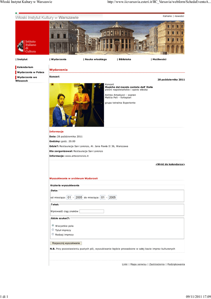Włoski Instytut Kultury w Warszawie http://www.iicvarsavia.esteri.it/IIC_Varsavia/webform/SchedaEventoA... italiano | nowości | Instytut Kalendarium Wydarzenia w Polsce Wydarzenia we | Wydarzenia | Nauka włoskiego | Biblioteka | Możliwości Wydarzenia Koncert 28 października 2011 Włoszech Koncert Musiche dal mando cantate dall' Italia pieśni napoletańskie i opera włoska Astrea Amaduzzi - sopran Mattia Peli - fortepian grupa tetralna Esperiente Informacje Data: 28 października 2011 Godziny: godz. 20.00 Gdzie?: Restauracja San Lorenzo, Al. Jana Pawła II 36, Warszawa Kto zorganizował: Restauracja San Lorenzo Informacje: www.arteconvivio.it <Wróć do kalendarza> Wyszukiwanie w archiwum Wydarzeń Kryteria wyszukiwania Data: od miesiąca: - do miesiąca: - Tekst: Wprowadź ciąg znaków Gdzie szukać?: W szystkie pola Tytuł imprezy Rodzaj imprezy Rozpocznij wyszukiwanie N.B. Przy pozostawieniu pustych pól, wyszukiwanie będzie prowadzone w całej bazie imprez kulturanych Linki | Mapa serwisu | Zastrzeżenia | Podziękowania 1 di 1 09/11/2011 17.09