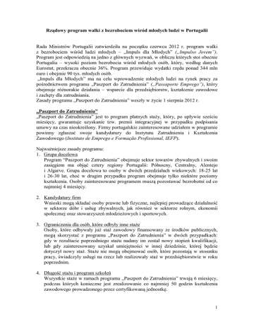 Rządowy program walki z bezrobociem wśród młodych ludzi w Portugalii Rada Ministrów Portugalii zatwierdziła na początku czerwca 2012 r. program walki z bezrobociem wśród ludzi młodych – „Impuls dla Młodych” („Impulso Jovem”). Program jest odpowiedzią na jedno z głównych wyzwań, w obliczu których stoi obecnie Portugalia – wysoki poziom bezrobocia wśród młodych osób, który, według danych Eurostat, przekracza obecnie 36%. Program przewiduje wydatki rzędu ponad 344 mln euro i obejmie 90 tys. młodych osób. „Impuls dla Młodych” ma na celu wprowadzenie młodych ludzi na rynek pracy za pośrednictwem programu „Paszport do Zatrudnienia” („Passaporte Emprego”), który obejmuje różnorakie działania – wsparcie dla przedsiębiorstw, kształcenie zawodowe i zachęty dla zatrudniania. Zasady programu „Paszport do Zatrudnienia” weszły w życie 1 sierpnia 2012 r. „Paszport do Zatrudnienia” „Paszport do Zatrudnienia” jest to program płatnych staży, który, po upływie sześciu miesięcy, gwarantuje uzyskanie tzw. premii integracyjnej w przypadku podpisania umowy na czas nieokreślony. Firmy portugalskie zainteresowane udziałem w programie powinny zgłaszać swoje kandydatury do Instytutu Zatrudnienia i Kształcenia Zawodowego (Instituto de Emprego e Formação Profissional, IEFP). Najważniejsze zasady programu: 1. Grupa docelowa Program “Paszport do Zatrudnienia” obejmuje sektor towarów zbywalnych i swoim zasięgiem ma objąć cztery regiony Portugalii: Północny, Centralny, Alentejo i Algarve. Grupa docelowa to osoby w dwóch przedziałach wiekowych: 18-25 lat i 26-30 lat, choć w drugim przypadku program obejmuje tylko niektóre poziomy kształcenia. Osoby zainteresowane programem muszą pozostawać bezrobotni od co najmniej 4 miesięcy. 2. Kandydatury firm Wnioski mogą składać osoby prawne lub fizyczne, najlepiej prowadzące działalność w sektorze dóbr i usług zbywalnych, jak również w sektorze rolnym, ekonomii społecznej oraz stowarzyszeń młodzieżowych i sportowych. 3. Ograniczenia dla osób, które odbyły inne staże Osoby, które odbywały już staż zawodowy finansowany ze środków publicznych, mogą skorzystać z programu „Paszport do Zatrudnienia” w dwóch przypadkach: gdy w rezultacie poprzedniego stażu nadany im został nowy stopień kwalifikacji, lub gdy zainteresowany uzyskał umiejętności w innej dziedzinie, której będzie dotyczył nowy staż. Staże nie mogą obejmować osób, które pozostają w stosunku pracy, świadczyły usługi na rzecz lub realizowały staż w przedsiębiorstwie w roku poprzednim. 4. Długość stażu i program szkoleń Wszystkie staże w ramach programu „Paszport do Zatrudnienia” trwają 6 miesięcy, podczas których konieczne jest zrealizowanie co najmniej 50 godzin kształcenia zawodowego prowadzonego przez certyfikowaną jednostkę. 1 Stażyści są traktowani jako pracownicy na rzecz osób trzecich i w związku z tym są zobowiązani do wypełniania swoich zobowiązań w zakresie podatku dochodowego od osób fizycznych (IRS) oraz wpłat na ubezpieczenie społeczne (Segurança Social). 5. Stypendium W przypadku staży w obszarze sektora ekonomii społecznej, stypendia są w pełni refundowane. W pozostałych przypadkach, w firmach zatrudniających 10 lub mniej pracowników, pierwszy zatrudniony stażysta także otrzymuje stypendium w pełni refundowane. W przypadku natomiast zatrudnienia drugiego stażysty lub firm, w których liczba pracowników przekracza 10, zwrot kosztów stażu wynosi 70%. Wartość stypendiów wynosi odpowiednio: 419,22 euro w przypadku stażystów, którzy nie ukończyli szkoły średniej, 524,00 euro dla stażystów ze średnim wykształceniem, 691,70 euro w przypadku stażystów posiadających wykształcenie policealne lub wyższe. Ponadto, firma przyjmująca stażystę jest zobowiązana do wypłaty dodatku żywieniowego oraz pokrycia kosztów transportu, a także ubezpieczenia zdrowotnego. 6. Premia integracyjna Firmy, które w ślad za odbytym stażem zatrudnią stażystów na czas nieokreślony w terminie maksymalnie 30 dni od zakończenia stażu, mają prawo do tzw. premii integracyjnej o wartości odpowiadającej uczestnictwu w kosztach stypendium stażowego. Równolegle do programu „Paszport do Zatrudnienia” wprowadzone zostały również dwie inne inicjatywy: projekty (i) „CoopJovem” i (ii) „Mikrokredyt”. (i) „CoopJovem” to projekt rozwoju przedsiębiorczości młodych, który stanowi szybką pomoc dla inicjatyw w zakresie tworzenia samozatrudnienia oraz tworzenia spółdzielni. (ii) Projekt „Mikrokredyt” wpisuje się w Narodowy Program Mikrokredytu, którego celem jest ułatwianie dostępu do kredytu oraz udzielenie wsparcia technicznego w zakresie kształcenia przedsiębiorców przez pierwsze lata działalności. Projekt ten ma służyć pobudzaniu tworzenia nowych miejsc pracy oraz przedsiębiorczości osób o największych trudnościach w dostępie do rynku pracy. Zwrot kosztów składki ubezpieczeń społecznych - TSU Kolejną inicjatywą przyjętą przez rząd portugalski w ramach programu „Impuls dla Młodych” jest, obowiązująca od 5 sierpnia br., możliwość złożenia przez pracodawcę, który zatrudni młodego bezrobotnego wniosku o całkowity lub częściowy zwrot kosztów poniesionych z tytułu składki ubezpieczeń społecznych - TSU (Taxa Social Única). Możliwość odzyskania części wpłaconej składki posiadają przedsiębiorstwa, które zatrudniają młode bezrobotne osoby, zarejestrowane w urzędzie pracy od co najmniej 12 miesięcy. Pracodawca może również ubiegać się o taki zwrot w sytuacji, gdy 2 zatrudnia osoby bezrobotne posiadające umowę o pracę zawieszoną z powodu niewypłacania wynagrodzenia, o ile spełniają one warunek rejestracji w urzędzie pracy przez 12 kolejnych miesięcy. Omawiana forma wsparcia jest możliwa jedynie w przypadku umów o pracę w pełnym 