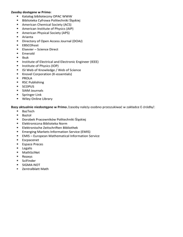 Zasoby dostępne w Primo: Katalog biblioteczny OPAC WWW Biblioteka Cyfrowa Politechniki Śląskiej American Chemical Society (ACS) American Institute of Physics (AIP) American Physical Society (APS) Arianta Directory of Open Access Journal (DOAJ) EBSCOhost Elsevier – Science Direct Emerald Ibuk Institute of Electrical and Electronic Engineer (IEEE) Institute of Physics (IOP) ISI Web of Knowledge / Web of Science Knovel Corporation (K-essentials) PROLA RSC Publishing SCOPUS SIAM Journals Springer Link Wiley Online Library Bazy aktualnie niedostępne w Primo /zasoby należy osobno przeszukiwać w zakładce E-źródła/: BazTech Baztol Dorobek Pracowników Politechniki Śląskiej Elektroniczna Biblioteka Norm Elektronische Zeitschriften Bibliothek Emerging Markets Information Service (EMIS) EMIS – European Mathematical Information Service Escpacenet Espace Preces Legalis MathSciNet Reaxys SciFinder SIGMA-NOT Zentralblatt Math
