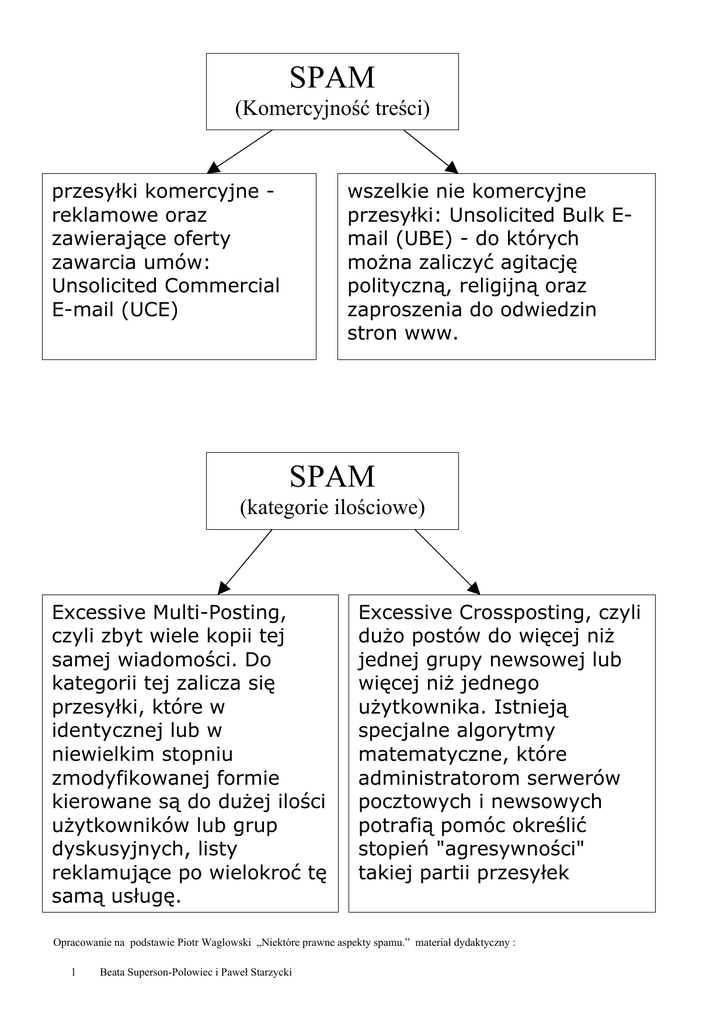 SPAM (Komercyjność treści) przesyłki komercyjne reklamowe oraz zawierające oferty zawarcia umów: Unsolicited Commercial E-mail (UCE) wszelkie nie komercyjne przesyłki: Unsolicited Bulk Email (UBE) - do których można zaliczyć agitację polityczną, religijną oraz zaproszenia do odwiedzin stron www. SPAM (kategorie ilościowe) Excessive Multi-Posting, czyli zbyt wiele kopii tej samej wiadomości. Do kategorii tej zalicza się przesyłki, które w identycznej lub w niewielkim stopniu zmodyfikowanej formie kierowane są do dużej ilości użytkowników lub grup dyskusyjnych, listy reklamujące po wielokroć tę samą usługę. Excessive Crossposting, czyli dużo postów do więcej niż jednej grupy newsowej lub więcej niż jednego użytkownika. Istnieją specjalne algorytmy matematyczne, które administratorom serwerów pocztowych i newsowych potrafią pomóc określić stopień "agresywności" takiej partii przesyłek Opracowanie na podstawie Piotr Waglowski „Niektóre prawne aspekty spamu.” materiał dydaktyczny : 1 Beata Superson-Polowiec i Paweł Starzycki