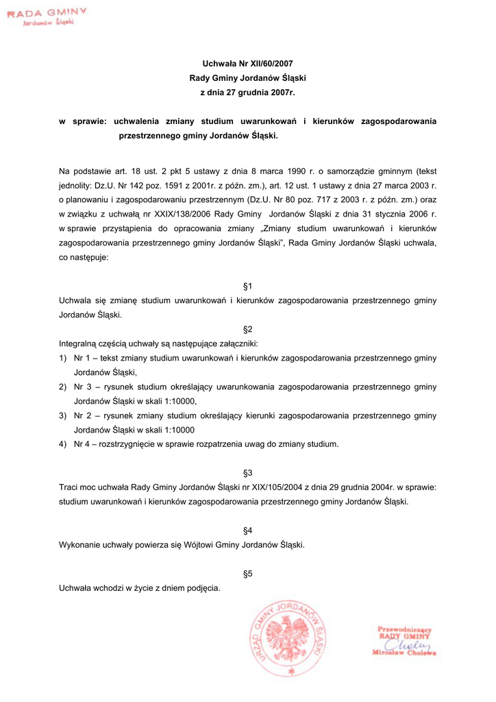 Uchwała Nr XII/60/2007 Rady Gminy Jordanów Śląski z dnia 27 grudnia 2007r. w sprawie: uchwalenia zmiany studium uwarunkowań i kierunków zagospodarowania przestrzennego gminy Jordanów Śląski. Na podstawie art. 18 ust. 2 pkt 5 ustawy z dnia 8 marca 1990 r. o samorządzie gminnym (tekst jednolity: Dz.U. Nr 142 poz. 1591 z 2001r. z późn. zm.), art. 12 ust. 1 ustawy z dnia 27 marca 2003 r. o planowaniu i zagospodarowaniu przestrzennym (Dz.U. Nr 80 poz. 717 z 2003 r. z późn. zm.) oraz w związku z uchwałą nr XXIX/138/2006 Rady Gminy Jordanów Śląski z dnia 31 stycznia 2006 r. w sprawie przystąpienia do opracowania zmiany „Zmiany studium uwarunkowań i kierunków zagospodarowania przestrzennego gminy Jordanów Śląski”, Rada Gminy Jordanów Śląski uchwala, co następuje: §1 Uchwala się zmianę studium uwarunkowań i kierunków zagospodarowania przestrzennego gminy Jordanów Śląski. §2 Integralną częścią uchwały są następujące załączniki: 1) Nr 1 – tekst zmiany studium uwarunkowań i kierunków zagospodarowania przestrzennego gminy Jordanów Śląski, 2) Nr 3 – rysunek studium określający uwarunkowania zagospodarowania przestrzennego gminy Jordanów Śląski w skali 1:10000, 3) Nr 2 – rysunek zmiany studium określający kierunki zagospodarowania przestrzennego gminy Jordanów Śląski w skali 1:10000 4) Nr 4 – rozstrzygnięcie w sprawie rozpatrzenia uwag do zmiany studium. §3 Traci moc uchwała Rady Gminy Jordanów Śląski nr XIX/105/2004 z dnia 29 grudnia 2004r. w sprawie: studium uwarunkowań i kierunków zagospodarowania przestrzennego gminy Jordanów Śląski. §4 Wykonanie uchwały powierza się Wójtowi Gminy Jordanów Śląski. §5 Uchwała wchodzi w życie z dniem podjęcia. Uzasadnienie do Uchwały Nr XII/60/2007 Rady Gminy Jordanów Śląski z dnia 27 grudnia 2007r. Studium uwarunkowań i kierunków zagospodarowania przestrzennego gminy jest dokumentem planistycznym, określającym politykę zagospodarowania przestrzennego gminy, sporządzonym dla całego obszaru gminy. W odróżnieniu od miejscowych planów zagospodarowania przestrzennego studium nie stanowi prawa miejscowego. Jest zobowiązaniem władz gminy do działań zgodnie z wyznaczonymi kierunkami. W dokumencie tym formułuje się zasady polityki przestrzennej, integruje dokumenty programowe i wizje związane z rozwojem gospodarczym i społecznym. Studium stanowi zbiór zapisów ustalonych i uzgodnionych jako nienaruszalne uwarunkowania i kierunki zagospodarowania przyjęte za podstawę do opracowania miejscowych planów zagospodarowania przestrzennego. Podstawę do opracowania zmiany studium stanowiła uchwała XXIX/138/2006 Rady Gminy Jordanów Śląski z dnia 31 stycznia 2006 r. w sprawie przystąpienia do opracowania zmiany „Studium uwarunkowań i kierunków zagospodarowania przestrzennego gminy Jordanów Śląski” Bezpośrednim powodem podjęcia powyższej uchwały była potrzeba zmiany zapisów w studium w nowej zmieniającej się sytuacji społeczno-gospodarczej oraz potrzeba przygotowania szerszej oferty inwestycyjnej na terenie gminy. Przy sporządzaniu projektu zmiany studium wzięto pod uwagę wnioski i uwagi złożone przez instytucje i mieszkańców. Projekt zmiany studium poddany został procedurze formalno-prawnej związanej z jego uzgodnieniem i konsultacją społeczną, określoną w art. 11 ustawy o planowaniu i zagospodarowaniu przestrzennym. Uwagi, które wniesiono do wyłożonego do publicznego wglądu projektu zmiany studium w znacznym zakresie zostały uwzględnione przez Wójta. Zgodnie z art. 11 pkt 12 nieuwzględnione uwagi Wójt Gminy kieruje pod obrady Rady Gminy w celu rozstrzygnięcia. Zmiana studium stanowi korektę obowiązującego studium i jest kontynuacją polityki przestrzennej i kierunków rozwoju przyjętych w studium z 2005 roku. W związku z powyższym zasadne jest podjęcie przez Radę Gminy przedmiotowej uchwały. Załącznik nr 4 do uchwały nr XII/60/2007 Rady Gminy Jordanów Śląski z dnia 27 grudnia 2007r. w sprawie uchwalenia zmiany studium uwarunkowań i kierunków zagospodarowania przestrzennego Gminy Jordanów Śląski. ROZPATRZENIE UWAG ZŁOŻONYCH DO ZMIANY STUDIUM UWARUNKOWAŃ I KIERUNKÓW ZAGOSPODAROWANIA PRZESTRZENNEGO GMINY JORDANÓW ŚLĄSKI Rozstrzygnięcia dokonano na podstawie art. 12 ust. 1 ustawy z dnia 27 marca 2003 r. o planowaniu i zagospodarowaniu przestrzennym (Dz. U. 80 poz. 717 ze zm.) Złożone uwagi do zmiany studium uwarunkowań i kierunków zagospodarowania przestrzennego Gminy Jordanów Śląski, nieuwzględnione przez Wójta, rozpatruje się w sposób następujący: 1) Uwagę złożoną w dniu 11.10.2007 Przez Annę Demską, ul. Wrocławska 36, 155-065 Jordanów Śląski, dla dz. nr 10/3 Glinica, dotyczą zmiany przeznaczenia terenu na teren aktywności gospodarczej, odrzuca się w całości, ponieważ działka jest oderwana od terenów planowanych do przeznaczenia pod działalność przemysłowo-usługową, jest otoczona terenami przeznaczonymi pod produkcję rolną. Zmiana przeznaczenia tereny naruszyłaby ład przestrzenny i pogorszyłaby warunki dla produkcji rolniczej na terenach sąsiednich. 2) Uwagę złożoną w dniu 27.09.2007 przez Józefa Pisarewskiego, Glinica 6, 55-065 Jordanów Śląski, dla dz. nr 51, 52 Glinica, odrzuca się w części, nieuwzględniona część dotyczy przeznaczenia działki na cele mieszkalne, ponieważ wnioskowany teren znajduje się w bezpośrednim sąsiedztwie terenów przemysłowo – usługowych. 3) Uwagę złożoną w dniu 19.10.2007 przez Ilonę i Piotra Ligas ul. Kręta 3, 55-065 Jordanów Śląski, dla dz. nr 732/2 i 733 obręb Jordanów Śląski, dotyczącą zmiany przeznaczenia działek na cele mieszkalne odrzuca się w całości, ponieważ nieruchomości są oderwane od terenów planowanych perspektywicznie do zabudowy mieszkaniowej jednorodzinnej.