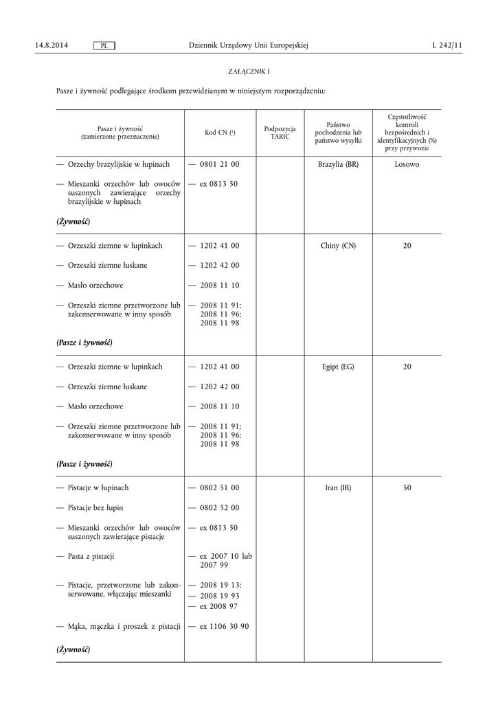 14.8.2014 PL Dziennik Urzędowy Unii Europejskiej L 242/11 ZAŁĄCZNIK I Pasze i żywność podlegające środkom przewidzianym w niniejszym rozporządzeniu: Pasze i żywność (zamierzone przeznaczenie) — Orzechy brazylijskie w łupinach Kod CN (1) — 0801 21 00 Podpozycja TARIC Państwo pochodzenia lub państwo wysyłki Częstotliwość kontroli bezpośrednich i identyfikacyjnych (%) przy przywozie Brazylia (BR) Losowo Chiny (CN) 20 Egipt (EG) 20 Iran (IR) 50 — Mieszanki orzechów lub owoców — ex 0813 50 suszonych zawierające orzechy brazylijskie w łupinach (Żywność) — Orzeszki ziemne w łupinkach — 1202 41 00 — Orzeszki ziemne łuskane — 1202 42 00 — Masło orzechowe — 2008 11 10 — Orzeszki ziemne przetworzone lub — 2008 11 91; zakonserwowane w inny sposób 2008 11 96; 2008 11 98 (Pasze i żywność) — Orzeszki ziemne w łupinkach — 1202 41 00 — Orzeszki ziemne łuskane — 1202 42 00 — Masło orzechowe — 2008 11 10 — Orzeszki ziemne przetworzone lub — 2008 11 91; zakonserwowane w inny sposób 2008 11 96; 2008 11 98 (Pasze i żywność) — Pistacje w łupinach — 0802 51 00 — Pistacje bez łupin — 0802 52 00 — Mieszanki orzechów lub owoców — ex 0813 50 suszonych zawierające pistacje — Pasta z pistacji — ex 2007 10 lub 2007 99 — Pistacje, przetworzone lub zakon — 2008 19 13; serwowane, włączając mieszanki — 2008 19 93 — ex 2008 97 — Mąka, mączka i proszek z pistacji — ex 1106 30 90 (Żywność) L 242/12 PL Pasze i żywność (zamierzone przeznaczenie) — Suszone figi Dziennik Urzędowy Unii Europejskiej Kod CN (1) — 0804 20 90 Podpozycja TARIC 14.8.2014 Państwo pochodzenia lub państwo wysyłki Częstotliwość kontroli bezpośrednich i identyfikacyjnych (%) przy przywozie Turcja (TR) 20 Turcja (TR) Losowo Turcja (TR) 50 — Mieszanki orzechów lub owoców — ex 0813 50 suszonych zawierające figi — Pasta z fig — ex 2007 10 lub 2007 99 — Figi, przetworzone lub zakonser — ex 2008 99 wowane, włączając mieszanki — ex 2008 97 (Żywność) — Orzechy leszczyny (Corylus sp.) w — 0802 21 00 łupinach — Orzechy leszczyny (Corylus sp.) bez — 0802 22 00 łupin — Mieszanki orzechów lub owoców — ex 0813 50 suszonych zawierające orzechy leszczyny — Pasta z orzechów leszczyny — ex 2007 10 lub 2007 99 — Orzechy leszczyny, przetworzone — ex 2008 19 lub zakonserwowane, włączając — ex 2008 97 mieszanki — Mąka, mączka i proszek z orze — ex 1106 30 90 chów leszczyny — Siekane, krojone i łamane orzechy — ex 0802 22 00; leszczyny 2008 19 — Olej z orzechów leszczyny — ex 1515 90 99 (Żywność) — Pistacje w łupinach — 0802 51 00 — Pistacje bez łupin — 0802 52 00 — Mieszanki orzechów lub owoców — ex 0813 50 suszonych zawierające pistacje — Pasta z pistacji — ex 2007 10 lub 2007 99 — Pistacje, przetworzone lub zakon — 2008 19 13; serwowane, włączając mieszanki — 2008 19 93 — ex 2008 97 — Mąka, mączka i proszek z pistacji — ex 1106 30 90 (Żywność) 14.8.2014 PL Pasze i żywność (zamierzone przeznaczenie) Dziennik Urzędowy Unii Europejskiej Kod CN (1) — Orzeszki ziemne w łupinkach — 1202 41 00 — Orzeszki ziemne łuskane — 1202 42 00 — Masło orzechowe — 2008 11 10 Podpozycja TARIC L 242/13 Państwo pochodzenia lub państwo wysyłki Częstotliwość kontroli bezpośrednich i identyfikacyjnych (%) przy przywozie Ghana (GH) 50 Indie (IN) 20 Nigeria (NG) 50 — Orzeszki ziemne przetworzone lub — 2008 11 91; zakonserwowane w inny sposób 2008 11 96; 2008 11 98 (Pasze i żywność) — Orzeszki ziemne w łupinkach — 1202 41 00 — Orzeszki ziemne łuskane — 1202 42 00 — Masło orzechowe — 2008 11 10 — Orzeszki ziemne przetworzone lub — 2008 11 91; zakonserwowane w inny sposób 2008 11 96; 2008 11 98 (Pasze i żywność) Pestki arbuza (egusi, Citrullus lanatus) i produkty pochodne (Żywność) ex 1207 70 00; ex 1106 30 90; ex 2008 99 99; 10 30 50