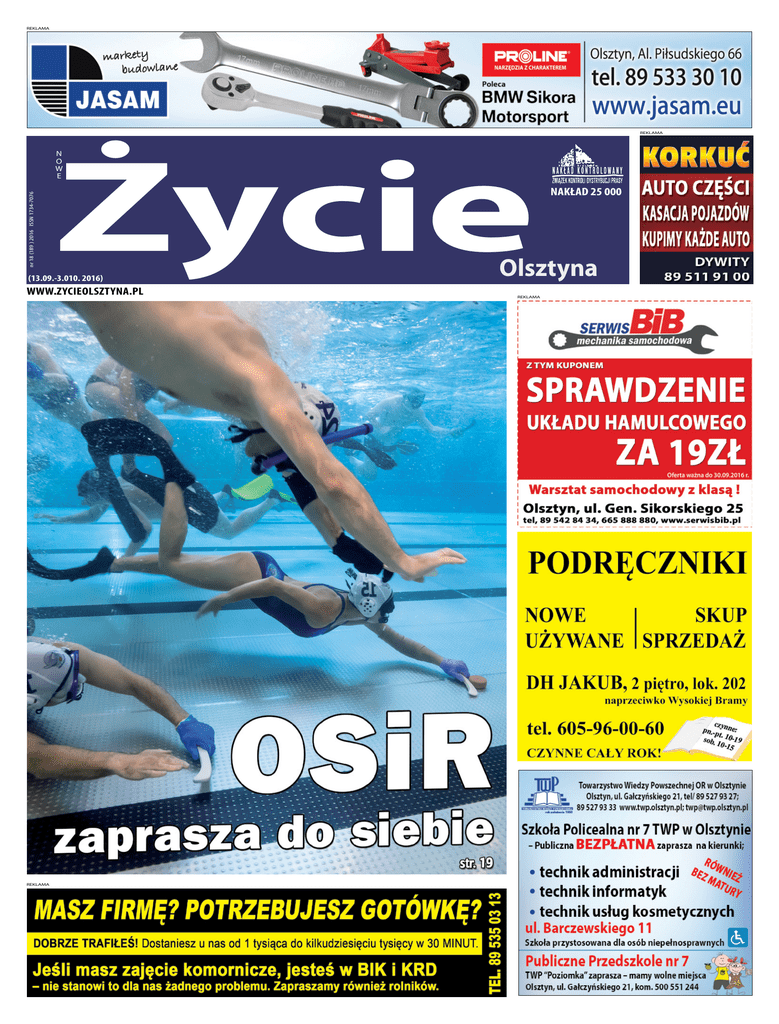 REKLAMA nr 18 (189 ) 2016 ISSN 1734-7076 NOWE Życie REKLAMA (13.09.-3.010. 2016) www.zycieolsztyna.pl REKLAMA NAKŁAD 25 000 Olsztyna REKLAMA 2 “Nowe Życie Olsztyna” nr 18 (189) 2016 z olsztyna Szczenię do adopcji Tori to czteromiesięczne szczenię, którego pozbyto się jak śmiecia. Mała suczka została porzucona przy markecie. A jest piękną pręgowaną psinką. Nie znamy jej rodziców, więc ciężko powiedzieć, jakiej wielkości będzie, ale najprawdopodobniej średniej. Mała jest wesoła, energiczna, wszędzie jej pełno. Choć niepozorna, jest bardzo charakterna. Dlatego potrzebuje rodziny, której nie wejdzie na głowę. Tori została odrobaczona, odpchlona (wolontariuszka powiedziała, że jeszcze nie widziała aż tak zapchlonego szczeniaka) oraz zaszczepiona. Przebywa w domu tymczasowym z innymi psami i kotami i nie ma problemu w kontaktach z nimi. Warunkiem adopcji Tori jest wypełnienie ankiety, wizyta przed/poadopcyjna i podpisanie umowy adopcyjnej. Torinka przebywa w okolicach Dobrego Miasta, ale wolontariusze pomogą w przewiezieniu tego pieska do nowego domu. Czy ktoś z Czytelników zaopiekuje się tym maleństwem? Kontakt pod numerem telefonu 794 304 181. Oszustwo na rolnika Mechanik, piekarz, elektromonter czy doradca klienta – każdy z nich podawał się za rolnika, aby wyłudzić unijne dotacje. Policja podaje, że podejrzanych jest dziesięciu, którzy w porozumieniu ze swoim pełnomocnikiem Andrzejem R. usiłowali oszukać Skarb Państwa na ponad pół miliona złotych. Sprawa rozpoczęła się przed rokiem, gdy do wydziału zajmującego się zwalczaniem przestępczości gospodarczej KMP w Olsztynie trafiło zawiadomienie o podejrzeniu popełnienia przestępstwa na szkodę Skarbu Państwa. W procederze miało brać udział 10 osób, które łączyła osoba Andrzeja R. Mężczyźni mieli starać się o dopłaty unijne na wykaszanie użytków zielonych. Ich pełnomocnik był jednocześnie organizatorem procederu i jego pomysłodawcą. 47-latek był już karany za oszustwa i odbył karę więzienia. Wraz z tzw. słupami usiłował uzyskać dopłatę bezpośrednią do gruntów rolnych na 2014 rok. Straty Skarbu Państwa mogły wynieść nawet 600 tys. zł. Przypomnijmy, że jego kompani na co dzień wykonywali zupełnie inne prace. Za każdym razem mężczyźni wprowadzali w błąd pracowników agencji w zakresie spełnienia przesłanek, które warunkowały przyznanie dopłat bezpośrednich, posiadania gruntów i wykonywania na nich prac agrotechnicznych, np. wykaszania. Fałszywi rolnicy mieli otrzymać od Andrzeja R. zróżnicowane bonifikaty pieniężne uzależnione od wysokości dopłaty. Za usiłowanie oszustwa lub oszustwo grozi kara do ośmiu lat więzienia. Wyjątkowa kamienica z nową elewacją Zakończyły się prace renowacyjne w kamienicy przy placu Konsulatu Polskiego 5. Rozpoczęły się na początku lipca, polegały na odnowieniu zniszczonej elewacji. Pieniądze na ten cel pochodziły z dotacji miejskich przydzielanych na ratowanie zabytków będących w administrowaniu osób prywatnych. Część kwoty dołożyła wspólnota mieszkaniowa z tej nieruchomości. NOWE Życie Wydawca: Agencja Reklamowo-Wydawnicza INNA PERSPEKTYWA” Paweł Lik, “ redaktor naczelny: Leszek Lik, [email protected]; redaktor wydania bezpłatnego: Paweł Lik, dziennikarze: Andrzej Zb. Brzozowski, Cezary Kapłon, Jacek Panas, Jerzy Pantak, Mirosław Rogalski, Olga Ropiak, Mariusz Wadas; rysunki: Zbigniew Piszczako; okładka: Paweł Lik Biuro promocji i reklamy: tel. 505 129 273; (r) – materiał reklamowy lub powierzony, ar- archiwum redakcji. Redakcja nie odpowiada za treœæ i formê powierzonych materia³ów, zastrzega sobie prawo adiustacji powierzonych tekstów. Druk: Grupa WM Sp. z o.o. Olsztyna Nakład 25 000 Dzięki temu elewacja kamienicy odzyskała swój pierwotny łososiowy kolor. Do tej pory wykonano tu izolację fundamentów przed wilgocią. Mieszkańcy nie ukrywają, że marzy im się jeszcze remont dachu. Kamienica przy placu Konsulatu Polskiego 5 jest jedną z najbardziej charakterystycznych i najładniejszych w Olsztynie. Przypomnijmy, że w kamienicy, która została wybudowana na początku XX wieku, w latach 1927-1939 mieścił się Konsulat Generalny RP. W latach po II wojnie światowej zamieszkiwał w niej znany pisarz Melchior Wańkowicz. Nowe pracownie dla niepełnosprawnych Zespół Placówek Edukacyjnych w Olsztynie otworzył nowe pracownie. Jedną z nich jest szklarnia ogrodnicza. Oprócz niej są także pracownie krawiecka, stolarska i rękodzielnicza. Jak twierdzą przedstawiciele tej placówki, dla niepełnosprawnych intelektualnie uczniów takie miejsca to nierzadko jedyna szansa, by zdobyć umiejętności zawodowe. – Do udziału w zajęciach ogrodniczych nikogo nie trzeba namawiać – twierdzi Aneta Jabłońska, instruktorka terapii zajęciowej. – To osoby, które bardzo lubią przebywać na powietrzu i chętnie udzielają się we wszystkiego rodzaju akcjach. A kiedy odwiedzają nas goście i chcą z nimi pracować, to są najszczęśliwsze na świecie – dodaje. We wszystkich rodzajach zajęć uczestniczy do 65 osób. Zajęcia z hortiterapii, w której łączy się terapię ogrodem z nauką nowego zawodu, przynoszą bardzo dobre efekty. – Od dawien dawna wiadomo, że najlepiej uczyć się poprzez zabawę – zaznacza Wanda Jabłońska, dyrektorka ZPE. – Naturalnie najlepiej wychodzi to, gdy wokół są koledzy naszych uczniów, robią coś wspólnie, a na końcu ktoś zachwyca się efektem ich działań. reklama “Nowe Życie Olsztyna” nr 18 (189) 2016 3 4 “Nowe Życie Olsztyna” nr 18 (189) 2016 olsztyn Stare miasto Miasto postanowiło wydać wojnę zeszpeconej w byle jakich reklamach starówce. Przygotowuje nawet specjalne rozporządzenia. Tymczasem tylnymi drzwiami samo może doprowadzić do zniszczenia wyglądu starego miasta na długie lata. Banery reklamujące wszystko, co się da – od barów i pizzerii po sa
