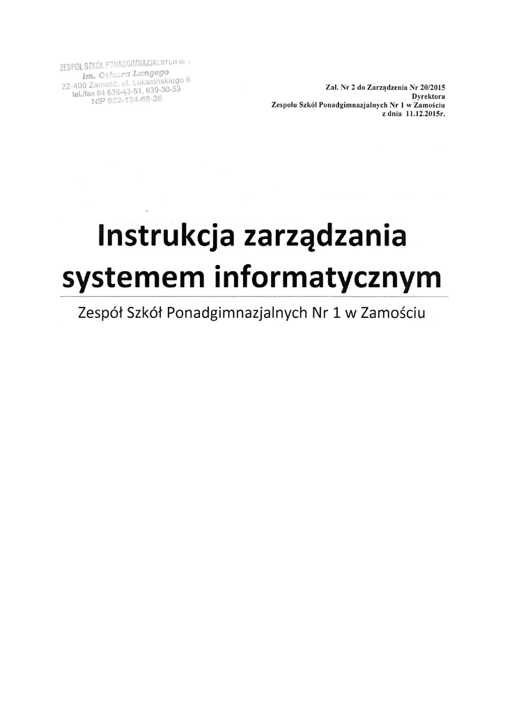 Spis treści Podstawa prawna: ....................................................................................................................... 3 I. Cel instrukcji ....................................................................................................................... 4 II. Definicje .............................................................................................................................. 4 III. Poziom bezpieczeństwa ...................................................................................................... 7 IV. Nadawanie i rejestrowanie (wyrejestrowywanie) uprawnień do przetwarzania ............... 7 V. Metody i środki uwierzytelnienia oraz procedury związane z ich zarządzaniem i użytkowaniem ............................................................................................................................ 8 VI. Procedury rozpoczęcia, zawieszenia i zakończenia pracy, przeznaczone dla użytkowników systemu....................................................................................................................................... 8 VII. Procedury tworzenia kopii zapasowych ........................................................................... 10 VIII. Sposób zabezpieczenia systemu informatycznego przed działalnością oprogramowania, którego celem jest uzyskanie nieuprawnionego dostępu do systemu informatycznego ......... 12 IX. Kontrola nad wprowadzaniem, dalszym przetwarzaniem i udostępnianiem danych osobowych................................................................................................................................ 13 X. Procedury wykonywania przeglądów i konserwacji systemów oraz nośników informacji służących do przetwarzania danych ......................................................................................... 13 XI. Naprawy urządzeń komputerowych z chronionymi danymi osobowymi ........................ 13 XII. Postępowanie w przypadku stwierdzenia naruszenia bezpieczeństwa systemu informatycznego ....................................................................................................................... 14 XIII. Postanowienia końcowe ............................................... Błąd! Nie zdefiniowano zakładki. XIV. Wykaz załączników ....................................................... Błąd! Nie zdefiniowano zakładki. 2 Podstawa prawna: 1. Konstytucja Rzeczypospolitej art. 47 i 51 Konstytucji Rzeczypospolitej Polskiej z dnia 2 kwietnia 1997r (Dz.U.1997.78.483); 2. Ustawa z dnia 26 czerwca 1974r kodeks pracy (Dz.U.2014.1502 ze zm).; 3. Ustawa o ochronie danych osobowych z dnia 29 sierpnia 1997r (Dz.U.2014.1182); 4. Rozporządzenie Ministra Spraw Wewnętrznych i Administracji z dnia 29 kwietnia 2004r w sprawie dokumentacji przetwarzania danych osobowych oraz warunków technicznych i organizacyjnych, jakim powinny odpowiadać urządzenia i systemy informatyczne służące do przetwarzania danych osobowych (Dz.U.2004.100.1024 ze zm); 5. Rozporządzenie Ministra Administracji i Cyfryzacji z dnia 10 grudnia 2014r w sprawie wzoru zgłoszeń powołania i odwołania administratora bezpieczeństwa informacji. (Dz.U.2014.1934); 6. Rozporządzenie Ministra Administracji i Cyfryzacji z dnia 11 maja 2015r w sprawie trybu i sposobu realizacji zadań w celu zapewnienia przestrzegania przepisów o ochronie danych osobowych przez administratora bezpieczeństwa informacji; 7. Rozporządzenie Ministra Administracji i Cyfryzacji z dnia 11 maja 2015r w sprawie sposobu prowadzenia przez administratora bezpieczeństwa informacji rejestru zbioru danych (Dz. U.2015.719). 3 I.Cel instrukcji Instrukcja określa sposób zarządzania systemem informatycznym, wykorzystywanym do przetwarzania danych osobowych, przez Administratora Danych – w celu zabezpieczenia danych osobowych przed zagrożeniami, w tym zwłaszcza przed ich udostępnieniem osobom nieupoważnionym, nieautoryzowaną zmianą, utratą, uszkodzeniem lub zniszczeniem. II.Definicje Ilekroć w instrukcji zarządzania system informatycznym jest mowa o: 1) Administratorze Danych – rozumie się przez to Dyrektora Zespołu Szkół Ponadgimnazjalnych N r 1 im. Oskara Langego w Zamościu, 2) Administratorze Bezpieczeństwa Informacji /ABI/ – rozumie się przez to osobę, której Administrator Danych powierzył pełnienie obowiązków Administratora Bezpieczeństwa Informacji, nadzorującą stosowanie środków technicznych i organizacyjnych zapewniających ochronę przetwarzanych danych osobowych, a w szczególności zabezpieczenie danych przed ich udostępnieniem osobom nieupoważnionym, zabraniem przez osobę nieuprawnioną, przetwarzaniem z naruszeniem ustawy z dnia 29 sierpnia 1997r. o ochronie danych osobowych (Dz.U.2014.1182) oraz zmianą, utratą, uszkodzeniem lub zniszczeniem, a także przeprowadzająca kontrole w zakresie określonym regulacjami wewnętrznymi Administratora Danych, Funkcje Administratora Bezpieczeństwa Informacji w ZSP N r 1 pełni Pani Maria Godzisz. Obowiązki ABI określają dalsze przepisy polityki bezpieczeństwa. 3) Administratorze Systemu Informatycznego /ASI/– rozumie się przez to osobę zarządzającą systemem informatycznym w którym przetwarzane są dane osobowe, Obowiązki Administratora Systemu Informatycznego pełni Pan Piotr Misiorek Obowiązki ASI określają dalsze przepisy. 4) haśle – rozumie się przez to ciąg znaków literowych, cyfrowych lub innych, znany jedynie osobie uprawnionej do pracy w systemie informatycznym, 5) identyfikatorze użytkownika – rozumie się przez to ciąg znaków literowych, cyfrowych lub innych, jednoznacznie identyfikujący osobę upoważnioną do przetwarzania danych osobowych w systemie informatycznym, 4 6) integralności danych – rozumie się przez to właściwość zapewniającą, że dane osobowe nie zostały zmienione lub zniszczone w sposób nieautoryzowany, 7) odbiorcy danych – rozumie się przez to każde