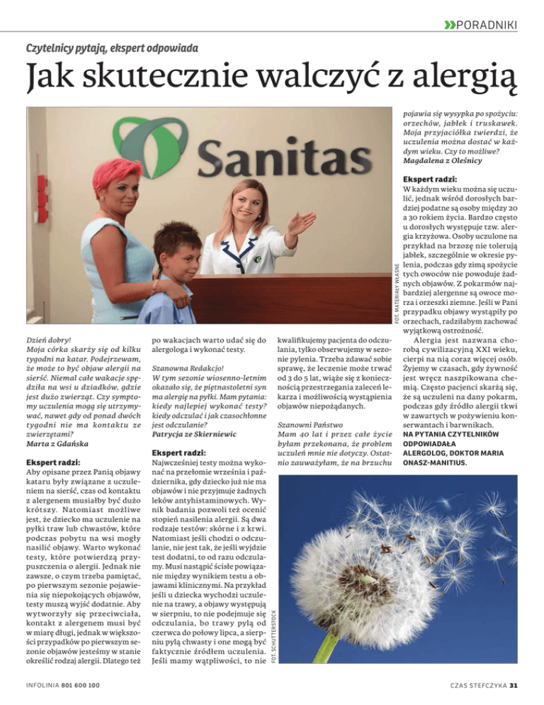 PORADNIKI Czytelnicy pytają, ekspert odpowiada Jak skutecznie walczyć z alergią fot. materiały własne pojawia się wysypka po spożyciu: orzechów, jabłek i truskawek. Moja przyjaciółka twierdzi, że uczulenia można dostać w każdym wieku. Czy to możliwe? Magdalena z Oleśnicy Ekspert radzi: Aby opisane przez Panią objawy kataru były związane z uczuleniem na sierść, czas od kontaktu z alergenem musiałby być dużo krótszy. Natomiast możliwe jest, że dziecko ma uczulenie na pyłki traw lub chwastów, które podczas pobytu na wsi mogły nasilić objawy. Warto wykonać testy, które potwierdzą przypuszczenia o alergii. Jednak nie zawsze, o czym trzeba pamiętać, po pierwszym sezonie pojawienia się niepokojących objawów, testy muszą wyjść dodatnie. Aby wytworzyły się przeciwciała, kontakt z alergenem musi być w miarę długi, jednak w większości przypadków po pierwszym sezonie objawów jesteśmy w stanie określić rodzaj alergii. Dlatego też INFOLINIA 801 600 100 po wakacjach warto udać się do alergologa i wykonać testy. kwalifikujemy pacjenta do odczulania, tylko obserwujemy w sezonie pylenia. Trzeba zdawać sobie sprawę, że leczenie może trwać od 3 do 5 lat, wiąże się z koniecznością przestrzegania zaleceń lekarza i możliwością wystąpienia objawów niepożądanych. Szanowna Redakcjo! W tym sezonie wiosenno-letnim okazało się, że piętnastoletni syn ma alergię na pyłki. Mam pytania: kiedy najlepiej wykonać testy? kiedy odczulać i jak czasochłonne jest odczulanie? Patrycja ze Skierniewic Ekspert radzi: Najwcześniej testy można wykonać na przełomie września i października, gdy dziecko już nie ma objawów i nie przyjmuje żadnych leków antyhistaminowych. Wynik badania pozwoli też ocenić stopień nasilenia alergii. Są dwa rodzaje testów: skórne i z krwi. Natomiast jeśli chodzi o odczulanie, nie jest tak, że jeśli wyjdzie test dodatni, to od razu odczulamy. Musi nastąpić ścisłe powiązanie między wynikiem testu a objawami klinicznymi. Na przykład jeśli u dziecka wychodzi uczulenie na trawy, a objawy występują w sierpniu, to nie podejmuje się odczulania, bo trawy pylą od czerwca do połowy lipca, a sierpniu pylą chwasty i one mogą być faktycznie źródłem uczulenia. Jeśli mamy wątpliwości, to nie Szanowni Państwo Mam 40 lat i przez całe życie byłam przekonana, że problem uczuleń mnie nie dotyczy. Ostatnio zauważyłam, że na brzuchu NA PYTANIA CZYTELNIKÓW ODPOWIADAŁA ALERGOLOG, DOKTOR MARIA ONASZ-MANITIUS. fot. schutterstock Dzień dobry! Moja córka skarży się od kilku tygodni na katar. Podejrzewam, że może to być objaw alergii na sierść. Niemal całe wakacje spędziła na wsi u dziadków, gdzie jest dużo zwierząt. Czy symptomy uczulenia mogą się utrzymywać, nawet gdy od ponad dwóch tygodni nie ma kontaktu ze zwierzętami? Marta z Gdańska Ekspert radzi: W każdym wieku można się uczulić, jednak wśród dorosłych bardziej podatne są osoby między 20 a 30 rokiem życia. Bardzo często u dorosłych występuje tzw. alergia krzyżowa. Osoby uczulone na przykład na brzozę nie tolerują jabłek, szczególnie w okresie pylenia, podczas gdy zimą spożycie tych owoców nie powoduje żadnych objawów. Z pokarmów najbardziej alergenne są owoce morza i orzeszki ziemne. Jeśli w Pani przypadku objawy wystąpiły po orzechach, radziłabym zachować wyjątkową ostrożność. Alergia jest nazwana chorobą cywilizacyjną XXI wieku, cierpi na nią coraz więcej osób. Żyjemy w czasach, gdy żywność jest wręcz naszpikowana chemią. Często pacjenci skarżą się, że są uczuleni na dany pokarm, podczas gdy źródło alergii tkwi w zawartych w pożywieniu konserwantach i barwnikach. C Z AS STEFC Z YK A 31