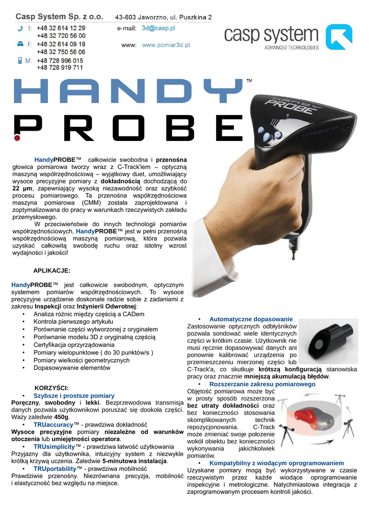 HandyPROBE™ całkowicie swobodna i przenośna głowica pomiarowa tworzy wraz z C-Track'iem – optyczną maszyną współrzędnościową – wyjątkowy duet, umożliwiający wysoce precyzyjne pomiary z dokładnością dochodzącą do 22 μm, zapewniający wysoką niezawodność oraz szybkość procesu pomiarowego. Ta przenośna współrzędnościowa maszyna pomiarowa (CMM) została zaprojektowana i zoptymalizowana do pracy w warunkach rzeczywistych zakładu przemysłowego. W przeciwieństwie do innych technologii pomiarów współrzędnościowych, HandyPROBE™ jest w pełni przenośną współrzędnościową maszyną pomiarową, która pozwala uzyskać całkowitą swobodę ruchu oraz istotny wzrost wydajności i jakości! APLIKACJE: HandyPROBE™ jest całkowicie swobodnym, optycznym systemem pomiarów współrzędnościowych. To wysoce precyzyjne urządzenie doskonale radzie sobie z zadaniami z zakresu Inspekcji oraz Inżynierii Odwrotnej: • Analiza różnic między częścią a CADem • Kontrola pierwszego artykułu • Porównanie części wytworzonej z oryginałem • Porównanie modelu 3D z oryginalną częścią • Certyfikacja oprzyrządowania • Pomiary wielopunktowe ( do 30 punktów/s ) • Pomiary wielkości geometrycznych • Dopasowywanie elementów KORZYŚCI: • Szybsze i prostsze pomiary Poręczny, swobodny i lekki. Bezprzewodowa transmisja danych pozwala użytkownikowi poruszać się dookoła części. Waży zaledwie 450g. • TRUaccuracy™ - prawdziwa dokładność Wysoce precyzyjne pomiary niezależne od warunków otoczenia lub umiejętności operatora. • TRUsimplicity™ - prawdziwa łatwość użytkowania Przyjazny dla użytkownika, intuicyjny system z niezwykle krótką krzywą uczenia. Zaledwie 5-minutowa instalacja. • TRUportability™ - prawdziwa mobilność Prawdziwie przenośny. Niezrównana precyzja, mobilność i elastyczność bez względu na miejsce. • Automatyczne dopasowanie Zastosowanie optycznych odbłyśników pozwala sondować wiele identycznych części w krótkim czasie. Użytkownik nie musi ręcznie dopasowywać danych ani ponownie kalibrować urządzenia po przemieszczeniu mierzonej części lub C-Track'a, co skutkuje krótszą konfiguracją stanowiska pracy oraz znacznie mniejszą akumulacją błędów. • Rozszerzanie zakresu pomiarowego Objętość pomiarowa może być w prosty sposób rozszerzona bez utraty dokładności oraz bez konieczności stosowania skomplikowanych technik repozycjonowania. C-Track może zmieniać swoje położenie wokół obiektu bez konieczności wykonywania jakichkolwiek pomiarów. • Kompatybilny z wiodącym oprogramowaniem Uzyskane pomiary mogą być wykorzystywane w czasie rzeczywistym przez każde wiodące oprogramowanie inspekcyjne i metrologiczne. Natychmiastowa integracja z zaprogramowanym procesem kontroli jakości. SPECYFIKACJA TECHNICZNA Dokładność Powtarzalność punktowa Dokładność objętościowa Dokładność przestrzenna (z wykorzystaniem MaxSHOT 3D lub C-Link ) Do 22 μm Do 25 μm Do 30 μm Nie dotyczy 3,80 m3 45 μm 50 μm 55 μm Nie dotyczy 7,80 m3 Nie dotyczy 55 μm 65 μm Nie dotyczy 14,80 m3 Nie dotyczy Nie dotyczy 95 μm Nie dotyczy 3,80 m3 75 μm 80 μm 90 μm Nie dotyczy 7,80 m3 Nie dotyczy 85 μm 95 μm Nie dotyczy 14,80 m3 Nie dotyczy Nie dotyczy 170 μm Nie dotyczy Do 1,2 m 75 μm 85 μm 170 μm Nie dotyczy Powyżej 1,2 m 45 μm + 25 μm/m 55 μm + 25 μm/m 95 μm + 25 μm/m Nie dotyczy Prędkość pomiarów 30 Hz 30 Hz Certyfikacje EN 301 489-1, EN 301 489-3, EN 300 220-1 EN 301 489-1, EN 301 489-3, EN 300 220-1 Zestaw zawiera: • HandyPROBE – swobodna sonda pomiarowa, • C-Track – wyposażony w 2 kamery układ śledzenia, • oprogramowanie do akwizycji danych VXelements, • stalowe odbłyśniki ⊘8mm 45˚ z podstawą ⊘6mm (4szt.), • magnetyczne podstawki pod odbłyśniki ⊘6mm (4szt), • kontroler, • głowica sondy pomiarowej M4 z rubinową kulą ⊘3mm, • narzędzie do montażu głowicy M4, • adapter sondy pomiarowej, • narzędzia kalibracji, • walizkę transportową, statyw i uniwersalny zasilacz, • 250 samoprzylepnych znaczników pozycjonujących, • wsparcie techniczne i gwarancja 1 rok. Opcjonalnie: • znaczniki pozycjonujące ⊘8mm i ⊘10mm, • stalowe odbłyśniki o różnych kątach nachylenia, • sondy pomiarowe Renishaw z akcesoriami, • oraz wiele innych akcesoriów...