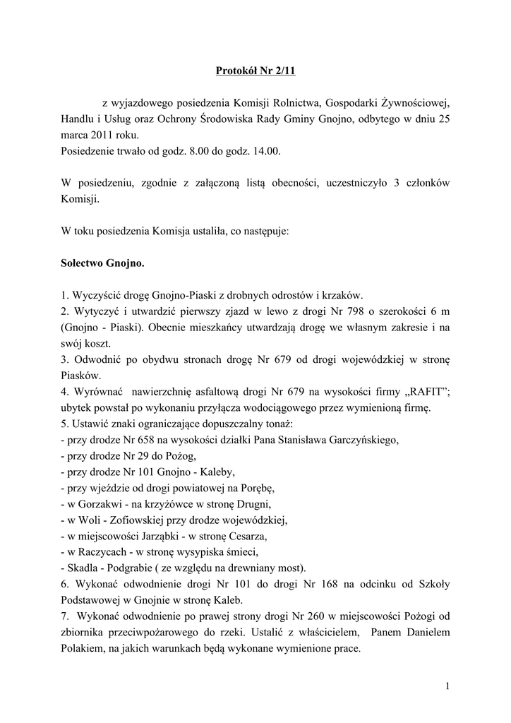 Protokół Nr 2/11 z wyjazdowego posiedzenia Komisji Rolnictwa, Gospodarki Żywnościowej, Handlu i Usług oraz Ochrony Środowiska Rady Gminy Gnojno, odbytego w dniu 25 marca 2011 roku. Posiedzenie trwało od godz. 8.00 do godz. 14.00. W posiedzeniu, zgodnie z załączoną listą obecności, uczestniczyło 3 członków Komisji. W toku posiedzenia Komisja ustaliła, co następuje: Sołectwo Gnojno. 1. Wyczyścić drogę Gnojno-Piaski z drobnych odrostów i krzaków. 2. Wytyczyć i utwardzić pierwszy zjazd w lewo z drogi Nr 798 o szerokości 6 m (Gnojno - Piaski). Obecnie mieszkańcy utwardzają drogę we własnym zakresie i na swój koszt. 3. Odwodnić po obydwu stronach drogę Nr 679 od drogi wojewódzkiej w stronę Piasków. 4. Wyrównać nawierzchnię asfaltową drogi Nr 679 na wysokości firmy „RAFIT”; ubytek powstał po wykonaniu przyłącza wodociągowego przez wymienioną firmę. 5. Ustawić znaki ograniczające dopuszczalny tonaż: - przy drodze Nr 658 na wysokości działki Pana Stanisława Garczyńskiego, - przy drodze Nr 29 do Pożog, - przy drodze Nr 101 Gnojno - Kaleby, - przy wjeździe od drogi powiatowej na Porębę, - w Gorzakwi - na krzyżówce w stronę Drugni, - w Woli - Zofiowskiej przy drodze wojewódzkiej, - w miejscowości Jarząbki - w stronę Cesarza, - w Raczycach - w stronę wysypiska śmieci, - Skadla - Podgrabie ( ze względu na drewniany most). 6. Wykonać odwodnienie drogi Nr 101 do drogi Nr 168 na odcinku od Szkoły Podstawowej w Gnojnie w stronę Kaleb. 7. Wykonać odwodnienie po prawej strony drogi Nr 260 w miejscowości Pożogi od zbiornika przeciwpożarowego do rzeki. Ustalić z właścicielem, Panem Danielem Polakiem, na jakich warunkach będą wykonane wymienione prace. 1 8. Wytyczyć drogę Nr 626 – 629 w Gorzakwi. Dowieźć kruszywo do miejscowości Gorzakiew na drogę Nr 575 i uzupełnić ubytki w drodze w stronę Drugni. Ponadto dostarczyć kruszywo na drogę Nr 578 o szerokości 12 m i uzupełnić ubytki (w miarę potrzeb) w drodze na Wymysłów. Wykonać drogę asfaltową o długości 280 m na odcinku Gorzakiew – Piaski. 9. Wyremontować most w Woli – Bokrzyckiej. Usunąć awarię wodociągu za mostem (w drodze). 10. Wola Zofiowska - uzupełnić kruszywem ubytki na drodze stanowiącej dojazd do gospodarstw Pana Kwaśniewskiego i Pana Sowińskiego. Wykonać dwa przepusty z kręgów o średnicy Ø 50 (po 5 sztuk) od drogi wojewódzkiej w stronę posesji Pana Samca i Półtoraka; dowieźć kruszywo i uzupełnić ubytki. Podgrabie za mostem - wytyczyć granice drogi od Pana Boksy w stronę Raczyc; po wcześniejszych uzgodnieniach z właścicielami, sąsiadującymi z drogą - usunąć krzewy i zarośla. 11. Uzupełnić kompleksowo ubytki i pęknięcia w drogach asfaltowych w niżej wymienionych miejscowościach: - Wola Zofiowska - cała droga główna w stronę sołtysa, - Glinka - obok posesji Pana Stróża i Pana Orkisza (uzupełnić ubytki masą bitumiczną). Przy posesji Pana Stanisława Kozłowskiego - oberwane pobocze, - Poręba – od zjazdu od drogi powiatowej w stronę Poręby i przez wieś, - Pożogi – zakrapianie tzw. „rakowin”, - Gnojno - Kaleby i obok posesji Pana Stanisława Garczyńskiego - j.w. Poza tym Pani Zofia Panak, sołtys wsi poinformowała członków Komisji, że w miejscowości Poręba odbędzie się zebranie wiejskie w trakcie którego będzie omówiona kwestia wyrażenia zgody na odwodnienie rowów wzdłuż drogi Nr 55 (przez wieś). Na tym protokół zakończono i podpisano.- Przewodniczący Komisji: Tomasz Pasternak 2
