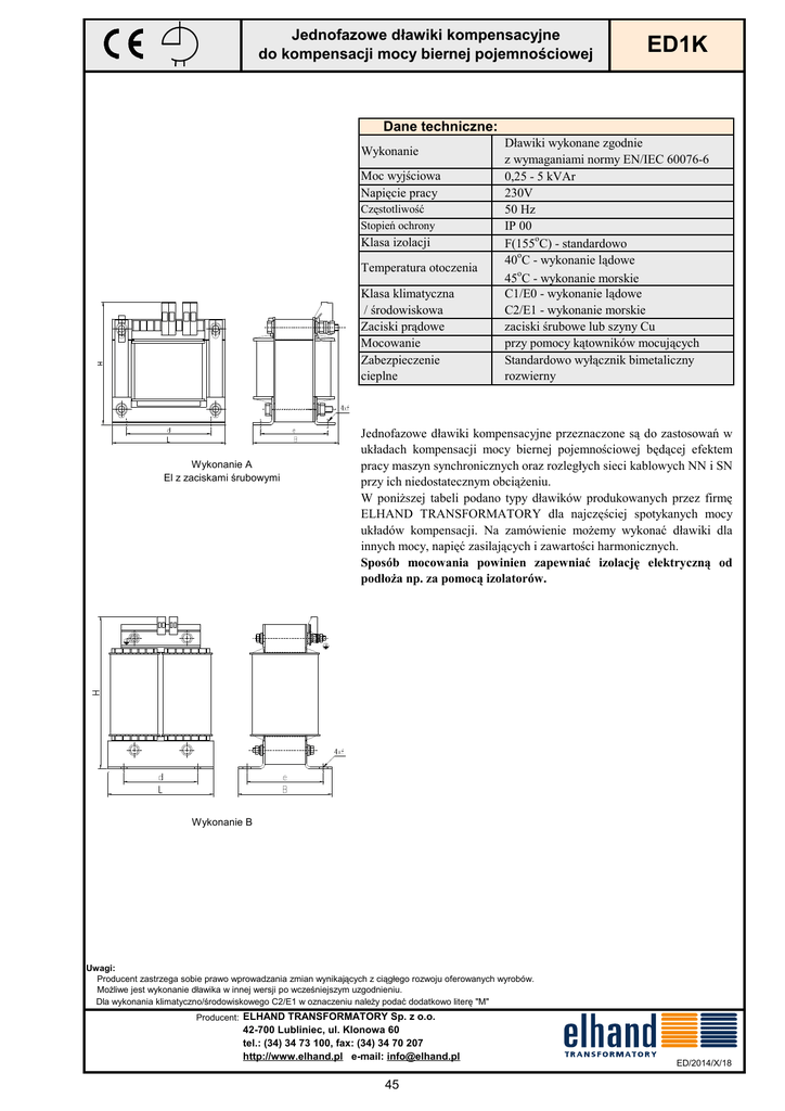 Jednofazowe dławiki kompensacyjne do kompensacji mocy biernej pojemnościowej ED1K Dane techniczne: Wykonanie Moc wyjściowa Napięcie pracy Częstotliwość Stopień ochrony Klasa izolacji Temperatura otoczenia Klasa klimatyczna / środowiskowa Zaciski prądowe Mocowanie Zabezpieczenie cieplne Wykonanie A El z zaciskami śrubowymi Dławiki wykonane zgodnie z wymaganiami normy EN/IEC 60076-6 0,25 - 5 kVAr 230V 50 Hz IP 00 o F(155 C) - standardowo o 40 C - wykonanie lądowe 45oC - wykonanie morskie C1/E0 - wykonanie lądowe C2/E1 - wykonanie morskie zaciski śrubowe lub szyny Cu przy pomocy kątowników mocujących Standardowo wyłącznik bimetaliczny rozwierny Jednofazowe dławiki kompensacyjne przeznaczone są do zastosowań w układach kompensacji mocy biernej pojemnościowej będącej efektem pracy maszyn synchronicznych oraz rozległych sieci kablowych NN i SN przy ich niedostatecznym obciążeniu. W poniższej tabeli podano typy dławików produkowanych przez firmę ELHAND TRANSFORMATORY dla najczęściej spotykanych mocy układów kompensacji. Na zamówienie możemy wykonać dławiki dla innych mocy, napięć zasilających i zawartości harmonicznych. Sposób mocowania powinien zapewniać izolację elektryczną od podłoża np. za pomocą izolatorów. Wykonanie B Uwagi: Producent zastrzega sobie prawo wprowadzania zmian wynikających z ciągłego rozwoju oferowanych wyrobów. Możliwe jest wykonanie dławika w innej wersji po wcześniejszym uzgodnieniu. Dla wykonania klimatyczno/środowiskowego C2/E1 w oznaczeniu należy podać dodatkowo literę "M" Producent: ELHAND TRANSFORMATORY Sp. z o.o. 42-700 Lubliniec, ul. Klonowa 60 tel.: (34) 34 73 100, fax: (34) 34 70 207 http://www.elhand.pl e-mail: [email protected] 45 ED/2014/X/18 ED1K Moc [kVAr] 0,25 0,5 0,75 1,0 1,5 2,0 2,5 3,0 4,0 5,0 Jednofazowe dławiki kompensacyjne do kompensacji mocy biernej pojemnościowej Parametry techniczne dławików kompensacyjnych L B Typ H d Indukcyjność Prąd [mm] [mm] dławika [mm] [mm] [mH] [A] ED1K – 0,25/230 678 1,08 84 80 93 64 ED1K – 0,5/230 340 2,16 120 110 122 90 ED1K – 0,75/230 226,4 3,25 120 110 122 90 ED1K – 1,0/230 166,5 4,4 120 130 122 90 ED1K – 1,5/230 112,3 6,52 150 110 145 122 ED1K – 2,0/230 84,9 8,67 174 140 160 135 ED1K – 2,5/230 67,2 10,9 174 150 160 135 ED1K – 3,0/230 55,9 13,1 174 150 160 135 ED1K – 4,0/230 42,1 17,4 175 155 263 116 ED1K – 5,0/230 33,7 21,7 200 165 280 140 e [mm] 63 84 84 104 88 111 121 121 126 133 f [mm] 4,8x8 5,8x12 5,8x12 5,8x12 7x13 7x13 7x13 7x13 11x15 11x15 Uwagi: Producent zastrzega sobie prawo wprowadzania zmian wynikających z ciągłego rozwoju oferowanych wyrobów. Możliwe jest wykonanie dławika w innej wersji po wcześniejszym uzgodnieniu. Dla wykonania klimatyczno/środowiskowego C2/E1 w oznaczeniu należy podać dodatkowo literę "M" Producent: ELHAND TRANSFORMATORY Sp. z o.o. ED/2014/X/19 42-700 Lubliniec, ul. Klonowa 60 tel.: (34) 34 73 100, fax: (34) 34 70 207 http://www.elhand.pl e-mail: [email protected] 46 Masa [kg] 2,2 5,2 5,6 7,4 8,3 14,9 17,8 21,6 18,6 21,6 Wykonanie A A A A A A A A B B