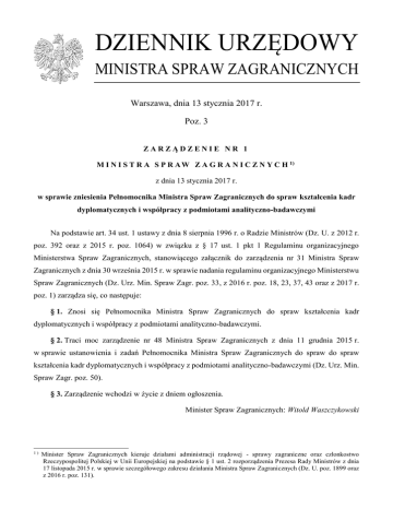 DZIENNIK URZĘDOWY MINISTRA SPRAW ZAGRANICZNYCH Warszawa, dnia 13 stycznia 2017 r. Poz. 3 ZARZĄDZENIE NR 1 M I N I S T R A S P R A W Z A G R A N I C Z N Y C H 1) z dnia 13 stycznia 2017 r. w sprawie zniesienia Pełnomocnika Ministra Spraw Zagranicznych do spraw kształcenia kadr dyplomatycznych i współpracy z podmiotami analityczno-badawczymi Na podstawie art. 34 ust. 1 ustawy z dnia 8 sierpnia 1996 r. o Radzie Ministrów (Dz. U. z 2012 r. poz. 392 oraz z 2015 r. poz. 1064) w związku z § 17 ust. 1 pkt 1 Regulaminu organizacyjnego Ministerstwa Spraw Zagranicznych, stanowiącego załącznik do zarządzenia nr 31 Ministra Spraw Zagranicznych z dnia 30 września 2015 r. w sprawie nadania regulaminu organizacyjnego Ministerstwu Spraw Zagranicznych (Dz. Urz. Min. Spraw Zagr. poz. 33, z 2016 r. poz. 18, 23, 37, 43 oraz z 2017 r. poz. 1) zarządza się, co następuje: § 1. Znosi się Pełnomocnika Ministra Spraw Zagranicznych do spraw kształcenia kadr dyplomatycznych i współpracy z podmiotami analityczno-badawczymi. § 2. Traci moc zarządzenie nr 48 Ministra Spraw Zagranicznych z dnia 11 grudnia 2015 r. w sprawie ustanowienia i zadań Pełnomocnika Ministra Spraw Zagranicznych do spraw do spraw kształcenia kadr dyplomatycznych i współpracy z podmiotami analityczno-badawczymi (Dz. Urz. Min. Spraw Zagr. poz. 50). § 3. Zarządzenie wchodzi w życie z dniem ogłoszenia. Minister Spraw Zagranicznych: Witold Waszczykowski 1) Minister Spraw Zagranicznych kieruje działami administracji rządowej - sprawy zagraniczne oraz członkostwo Rzeczypospolitej Polskiej w Unii Europejskiej na podstawie § 1 ust. 2 rozporządzenia Prezesa Rady Ministrów z dnia 17 listopada 2015 r. w sprawie szczegółowego zakresu działania Ministra Spraw Zagranicznych (Dz. U. poz. 1899 oraz z 2016 r. poz. 131).