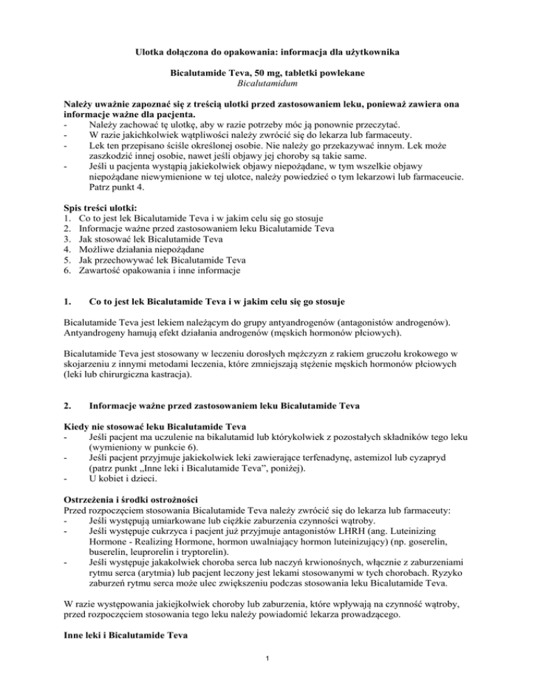 Ulotka dołączona do opakowania: informacja dla użytkownika Bicalutamide Teva, 50 mg, tabletki powlekane Bicalutamidum Należy uważnie zapoznać się z treścią ulotki przed zastosowaniem leku, ponieważ zawiera ona informacje ważne dla pacjenta. Należy zachować tę ulotkę, aby w razie potrzeby móc ją ponownie przeczytać. W razie jakichkolwiek wątpliwości należy zwrócić się do lekarza lub farmaceuty. Lek ten przepisano ściśle określonej osobie. Nie należy go przekazywać innym. Lek może zaszkodzić innej osobie, nawet jeśli objawy jej choroby są takie same. Jeśli u pacjenta wystąpią jakiekolwiek objawy niepożądane, w tym wszelkie objawy niepożądane niewymienione w tej ulotce, należy powiedzieć o tym lekarzowi lub farmaceucie. Patrz punkt 4. Spis treści ulotki: 1. Co to jest lek Bicalutamide Teva i w jakim celu się go stosuje 2. Informacje ważne przed zastosowaniem leku Bicalutamide Teva 3. Jak stosować lek Bicalutamide Teva 4. Możliwe działania niepożądane 5. Jak przechowywać lek Bicalutamide Teva 6. Zawartość opakowania i inne informacje 1. Co to jest lek Bicalutamide Teva i w jakim celu się go stosuje Bicalutamide Teva jest lekiem należącym do grupy antyandrogenów (antagonistów androgenów). Antyandrogeny hamują efekt działania androgenów (męskich hormonów płciowych). Bicalutamide Teva jest stosowany w leczeniu dorosłych mężczyzn z rakiem gruczołu krokowego w skojarzeniu z innymi metodami leczenia, które zmniejszają stężenie męskich hormonów płciowych (leki lub chirurgiczna kastracja). 2. Informacje ważne przed zastosowaniem leku Bicalutamide Teva Kiedy nie stosować leku Bicalutamide Teva Jeśli pacjent ma uczulenie na bikalutamid lub którykolwiek z pozostałych składników tego leku (wymieniony w punkcie 6). Jeśli pacjent przyjmuje jakiekolwiek leki zawierające terfenadynę, astemizol lub cyzapryd (patrz punkt „Inne leki i Bicalutamide Teva”, poniżej). U kobiet i dzieci. Ostrzeżenia i środki ostrożności Przed rozpoczęciem stosowania Bicalutamide Teva należy zwrócić się do lekarza lub farmaceuty: Jeśli występują umiarkowane lub ciężkie zaburzenia czynności wątroby. Jeśli występuje cukrzyca i pacjent już przyjmuje antagonistów LHRH (ang. Luteinizing Hormone - Realizing Hormone, hormon uwalniający hormon luteinizujący) (np. goserelin, buserelin, leuprorelin i tryptorelin). Jeśli występuje jakakolwiek choroba serca lub naczyń krwionośnych, włącznie z zaburzeniami rytmu serca (arytmia) lub pacjent leczony jest lekami stosowanymi w tych chorobach. Ryzyko zaburzeń rytmu serca może ulec zwiększeniu podczas stosowania leku Bicalutamide Teva. W razie występowania jakiejkolwiek choroby lub zaburzenia, które wpływają na czynność wątroby, przed rozpoczęciem stosowania tego leku należy powiadomić lekarza prowadzącego. Inne leki i Bicalutamide Teva 1 Należy powiedzieć lekarzowi lub farmaceucie o wszystkich lekach przyjmowanych obecnie lub ostatnio a także o lekach, które pacjent planuje stosować. Jest to szczególnie ważne w przypadku: terfenadyny lub astemizolu (stosowanych w leczeniu kataru siennego i alergii) (patrz punkt 2. „Kiedy nie stosować leku Bicalutamide Teva” powyżej) cyzaprydu (stosowanego w leczeniu chorób żołądka) (patrz punkt 2. „Kiedy nie stosować leku Bicalutamide Teva” powyżej) warfaryny oraz wszelkich innych podobnych leków przeciwzakrzepowych cyklosporyny (stosowanej do stłumienia aktywności układu odpornościowego w celu zapobiegania i leczenia odrzucania przeszczepionych narządów lub szpiku kostnego) antagonistów kanałów wapniowych takich jak nifedypina lub werapamil (stosowanych w leczeniu nadciśnienia tętniczego oraz niektórych chorób serca) cymetydyny (stosowanej w leczeniu choroby wrzodowej żołądka) ketokonazolu (używanego w leczeniu zakażeń grzybiczych skóry i paznokci) Bicalutamide Teva może wpływać na niektóre leki stosowane w leczeniu zaburzeń rytmu serca (np. chinidynę, prokainamid, amiodaron i sotalol) lub może zwiększać ryzyko zaburzeń rytmu serca kiedy stosowany jest razem z pewnymi lekami (np. metadonem (stosowanym w celu złagodzenia bólu lub jako część terapii związanej z odtruwaniem (detoksyfikacją) w uzależnieniu od leków), moksyfloksacyną (antybiotyk), lekami przeciwpsychotycznymi stosowanymi w leczeniu poważnych zaburzeń psychicznych. Ciąża, karmienie piersią i wpływ na płodność Kobiety nie mogą stosować leku Bicalutamide Teva. Prowadzenie pojazdów i obsługa maszyn Jest mało prawdopodobne, by lek Bicalutamide Teva wpływał na zdolność prowadzenia pojazdów mechanicznych lub obsługi maszyn. Jednakże u niektórych osób w czasie przyjmowania tego leku mogą sporadycznie wystąpić zawroty głowy i senność. Jeśli pacjent stwierdzi u siebie te objawy, powinien zachować szczególną ostrożność podczas wykonywania czynności tego typu. Bicalutamide Teva zawiera laktozę Tabletki leku Bicalutamide Teva zawierają laktozę. Jeśli lekarz poinformował pacjenta, że u niego występuje nietolerancja niektórych cukrów, przed zastosowaniem tego leku należy skontaktować się z lekarzem. 3. Jak stosować lek BicalutamideTeva Ten lek należy zawsze stosować zgodnie z zaleceniami lekarza. W razie wątpliwości należy zwrócić się do lekarza lub farmaceuty. O ile lekarz nie zaleci inaczej, zalecaną dawką jest jedna tabletka leku raz na dobę. Bardzo ważne jest, by lek przyjmować każdego dnia o stałej porze. Tabletki należy połykać w całości popijając niewielką ilością wody. Stosowanie u dzieci i młodzieży Dzieci i młodzież w wieku poniżej 18 lat nie mogą stosować leku Bicalutamide Teva. Zastosowanie większej niż zalecana dawki leku Bicalutamide Teva W razie przedawkowania tabletek lub przypadkowego połknięcia tabletki (tabletek) przez dziecko należy natychmiast skontaktować się ze swoim lekarzem lub udać się do najbliższego szpitalne