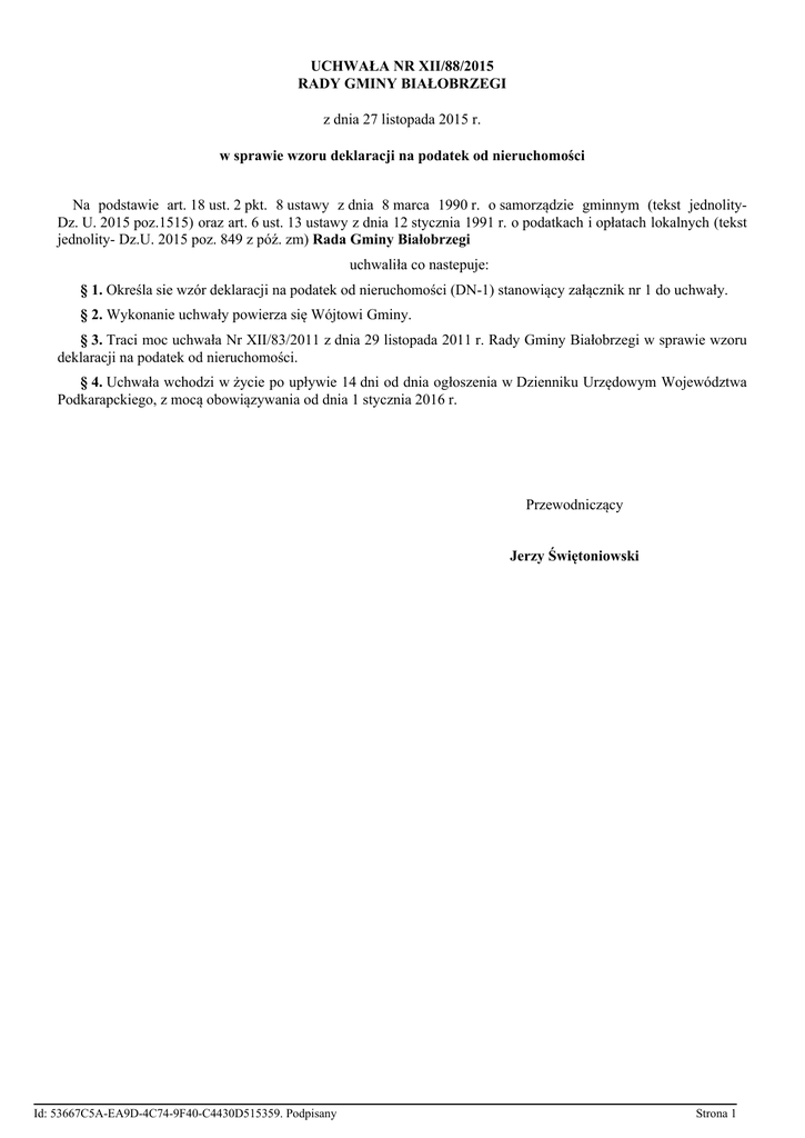 UCHWAŁA NR XII/88/2015 RADY GMINY BIAŁOBRZEGI z dnia 27 listopada 2015 r. w sprawie wzoru deklaracji na podatek od nieruchomości Na podstawie art. 18 ust. 2 pkt. 8 ustawy z dnia 8 marca 1990 r. o samorządzie gminnym (tekst jednolityDz. U. 2015 poz.1515) oraz art. 6 ust. 13 ustawy z dnia 12 stycznia 1991 r. o podatkach i opłatach lokalnych (tekst jednolity- Dz.U. 2015 poz. 849 z póź. zm) Rada Gminy Białobrzegi uchwaliła co nastepuje: § 1. Określa sie wzór deklaracji na podatek od nieruchomości (DN-1) stanowiący załącznik nr 1 do uchwały. § 2. Wykonanie uchwały powierza się Wójtowi Gminy. § 3. Traci moc uchwała Nr XII/83/2011 z dnia 29 listopada 2011 r. Rady Gminy Białobrzegi w sprawie wzoru deklaracji na podatek od nieruchomości. § 4. Uchwała wchodzi w życie po upływie 14 dni od dnia ogłoszenia w Dzienniku Urzędowym Województwa Podkarapckiego, z mocą obowiązywania od dnia 1 stycznia 2016 r. Przewodniczący Jerzy Świętoniowski Id: 53667C5A-EA9D-4C74-9F40-C4430D515359. Podpisany Strona 1 POLA JASNE WYPEŁNIA PODATNIK. WYPEŁNIAĆ NA MASZYNIE, KOMPUTEROWO LUB RĘCZNIE, DUŻYMI, DRUKOWANYMI LITERAMI, CZARNYM LUB NIEBIESKIM KOLOREM. 1. Identyfikator podatkowy NIP / numer PESEL (niepotrzebne skreślić) 1 2. Nr dokumentu Załącznik nr 1 do Uchwały nr XII/88/2015 Rady Gminy Białobrzegi z dnia 27 listopada 2015 r. DN-1 DEKLARACJA NA PODATEK OD NIERUCHOMOŚCI 3. Rok Podstawa prawna: Art. 6 ustawy z dnia 12 stycznia 1991 r. o podatkach i opłatach lokalnych (Dz.U. z 2014 r. poz.849, z późn. zm.). Składający: Formularz przeznaczony dla osób prawnych, jednostek organizacyjnych oraz spółek niemających osobowości prawnej będących właścicielami nieruchomości lub obiektów budowlanych, posiadaczami samoistnymi nieruchomości lub obiektów budowlanych, użytkownikami wieczystymi gruntów, posiadaczami nieruchomości lub ich części albo obiektów budowlanych lub ich części, stanowiących własność Skarbu Państwa lub jednostki samorządu terytorialnego oraz dla osób fizycznych będących współwłaścicielami lub współposiadaczami z osobami prawnymi, bądź z innymi jednostkami organizacyjnymi nieposiadającymi osobowości prawnej lub ze spółkami nieposiadającymi osobowości prawnej, z wyjątkiem osób fizycznych tworzących wspólnotę mieszkaniową. Do dnia 31 stycznia każdego roku podatkowego lub w terminie 14 dni od zaistnienia okoliczności mających wpływ na powstanie (wygaśnięcie) obowiązku podatkowego, lub wysokość opodatkowania. Termin składania: Miejsce składania: Organ podatkowy właściwy ze względu na miejsce położenia przedmiotów opodatkowania. A. MIEJSCE SKŁADANIA DEKLARACJI 4. Nazwa i adres siedziby organu podatkowego Wójt Gminy Białobrzegi , 37-114 Białobrzegi 4 woj. podkarpackie B. OBOWIĄZEK ZŁOŻENIA DEKLARACJI 5. Okoliczności powodujące obowiązek złożenia deklaracji (zaznaczyć właściwy kwadrat): 1. Deklaracja roczna 2. Korekta deklaracji rocznej (miesiąc – rok) C. PODMIOT ZOBOWIĄZANY DO ZŁOŻENIA DEKLARACJI 6. Rodzaj podmiotu (zaznaczyć właściwy kwadrat): 1. Właściciel, 2. Współwłaściciel, 3. Posiadacz samoistny 4.współposiadacz samoistny 5.użytkownik wieczysty 6.współużytkownik wieczysty 7.posiadacz ( np. dzierżawca) 8.współposiadacz ( np. dzierżawca) D. DANE PODATNIKA * - dotyczy podatnika niebędącego osobą fizyczną ** - dotyczy podatnika będącego osobą fizyczną D.1. DANE IDENTYFIKACYJNE 7. Rodzaj podatnika (zaznaczyć właściwy kwadrat): 1. Osoba fizyczna 8. Nazwa pełna * / Nazwisko ** 2. Osoba prawna 3. Jednostka organizacyjna, w tym spółka, nieposiadająca osobowości prawnej 9. Nazwa skrócona * / Pierwsze imię, drugie imię ** 10. Identyfikator REGON* 11. Klasa PKD* 13. Ilość zatrudnionych pracowników* 12. Nr KRS* Pola 14, 15, 16 wypełnia osoba fizyczna w przypadku, gdy numer PESEL nie został nadany. 15. Imię ojca 14. Data urodzenia (dzień - miesiąc - rok) 16. Imię matki D.2. ADRES SIEDZIBY * / ADRES ZAMIESZKANIA ** 17. Kraj 20.Gmina 18. Województwo 19. Powiat 21. Ulica 24. Miejscowość 22. Nr domu 25. Kod pocztowy 23. Nr lokalu 26. Poczta DN-1 (3) Id: 53667C5A-EA9D-4C74-9F40-C4430D515359. Podpisany 1/4 Strona 1 POLA JASNE WYPEŁNIA PODATNIK. WYPEŁNIAĆ NA MASZYNIE, KOMPUTEROWO LUB RĘCZNIE, DUŻYMI, DRUKOWANYMI LITERAMI, CZARNYM LUB NIEBIESKIM KOLOREM. D.3. ADRES DO DORĘCZEŃ W KRAJU Należy wypełnić tylko wówczas, gdy adres do korespondencji jest inny niż w części D.2. 28. Województwo 27. Kraj 30. Gmina 29. Powiat 31. Ulica 32. Nr domu 34. Miejscowość 35. Kod pocztowy 33. Nr lokalu 36. Poczta D.4. KONTAKT 37. Telefon 38. Faks 39. E-mail E. DANE O NIERUCHOMOŚCIACH PODLEGAJĄCYCH OPODATKOWANIU LUB ZWOLNIENIU Lp. Miejsce położenia Identyfikator geodezyjny działki Powierzchnia Nr Kw lub zbioru dok. 1. 2. 3. 4. 5. 6. 7. 8. 9. 10. 11. 12. 13. 14. 15. 16. F. DANE DOTYCZĄCE PRZEDMIOTÓW OPODATKOWANIA NIEPODLEGAJĄCYCH ZWOLNIENIU F.1. POWIERZCHNIA GRUNTÓW Podstawa opodatkowania w m2 (ha) z dokładnością do 1 m2 1. Związane z prowadzeniem działalności gospodarczej, bez względu na sposób zakwalifikowania w ewidencji gruntów i budynków 40. 2. Pod wodami powierzchniowymi stojącymi lub wodami powierzchniowymi płynącymi jezior i zbiorników sztucznych2 43. 3. Pozostałe grunty, w tym zajęte na prowadzenie odpłatnej statutowej działalności pożytku publicznego przez organizacje pożytku publicznego 46. 4. Niezabudowane objęte obszarem rewitalizacji, o którym mowa w ustawie z dnia 9 października 2015 r. o rewitalizacji, i położone na terenach, dla których miejscowy plan zagospodarowania przestrzennego przewiduje przeznaczenie pod zabudowę mieszkaniową, usługową albo zabudowę o przeznaczeniu mieszanym obejmującym wyłącznie te rodzaje zabudowy, jeżeli od dnia wejścia w życie tego planu w odniesieniu do tych gruntów upłynął okres 4 lat, a w tym czasie nie zakończono budowy zgodnie z przepisami prawa budow